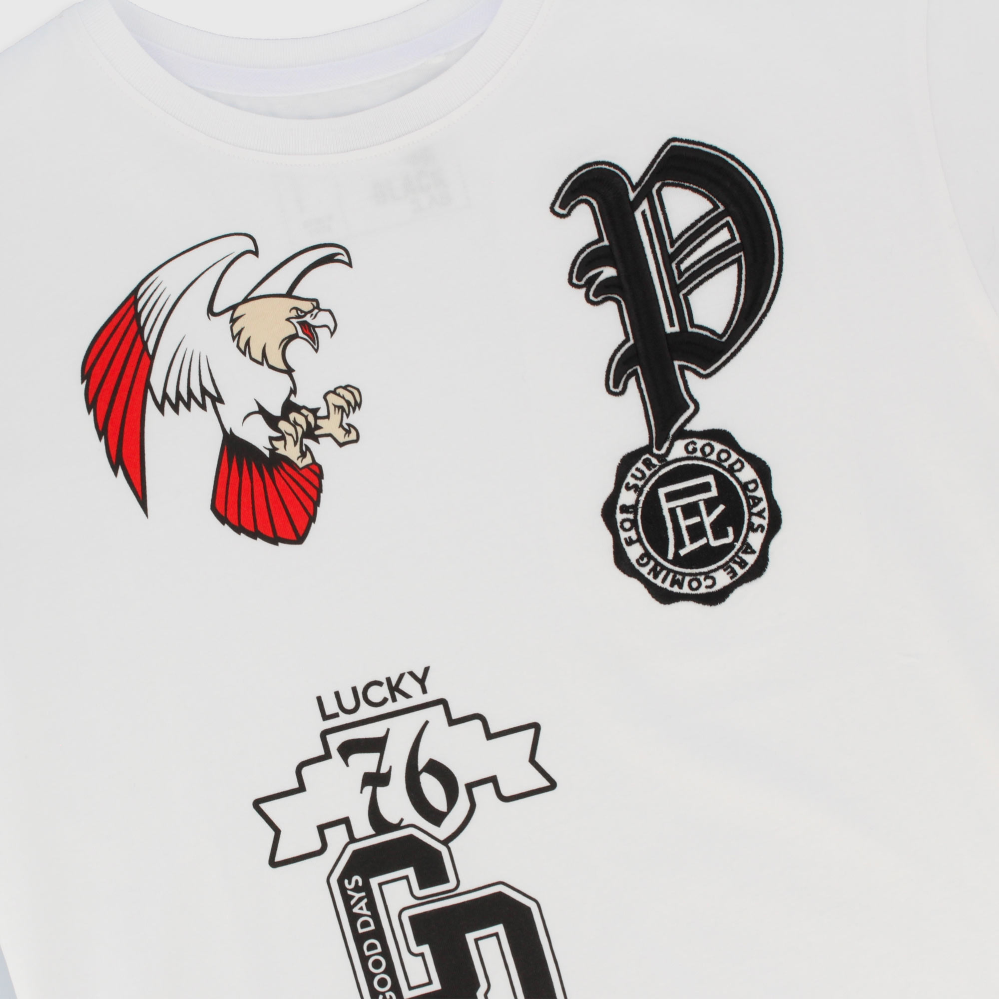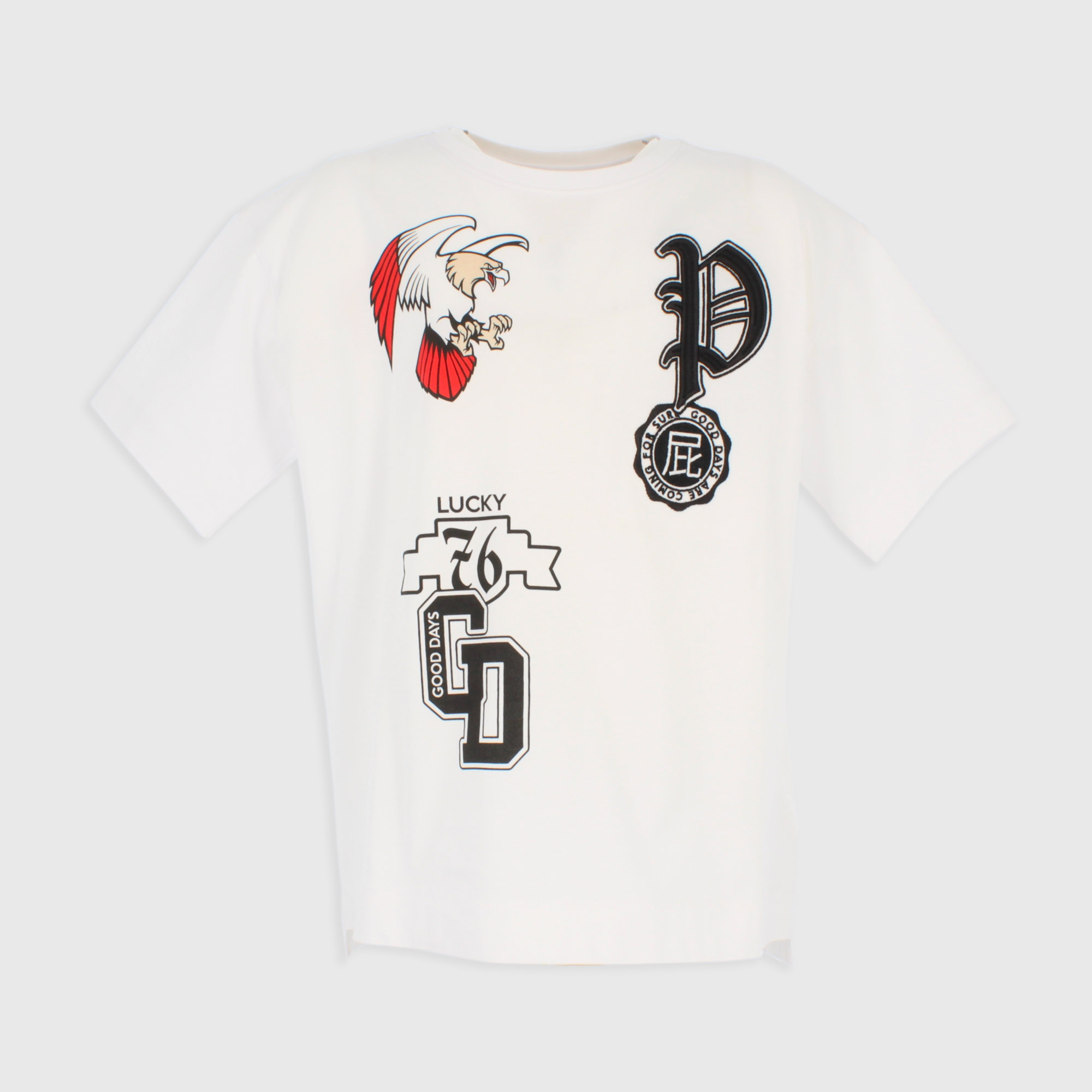 Футболка оверсайз из джерси, круглый вырез, короткие рукава. Принт и вышивка спереди.