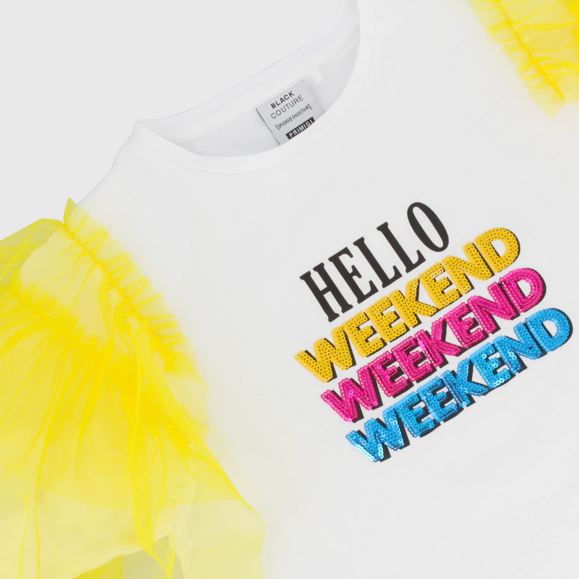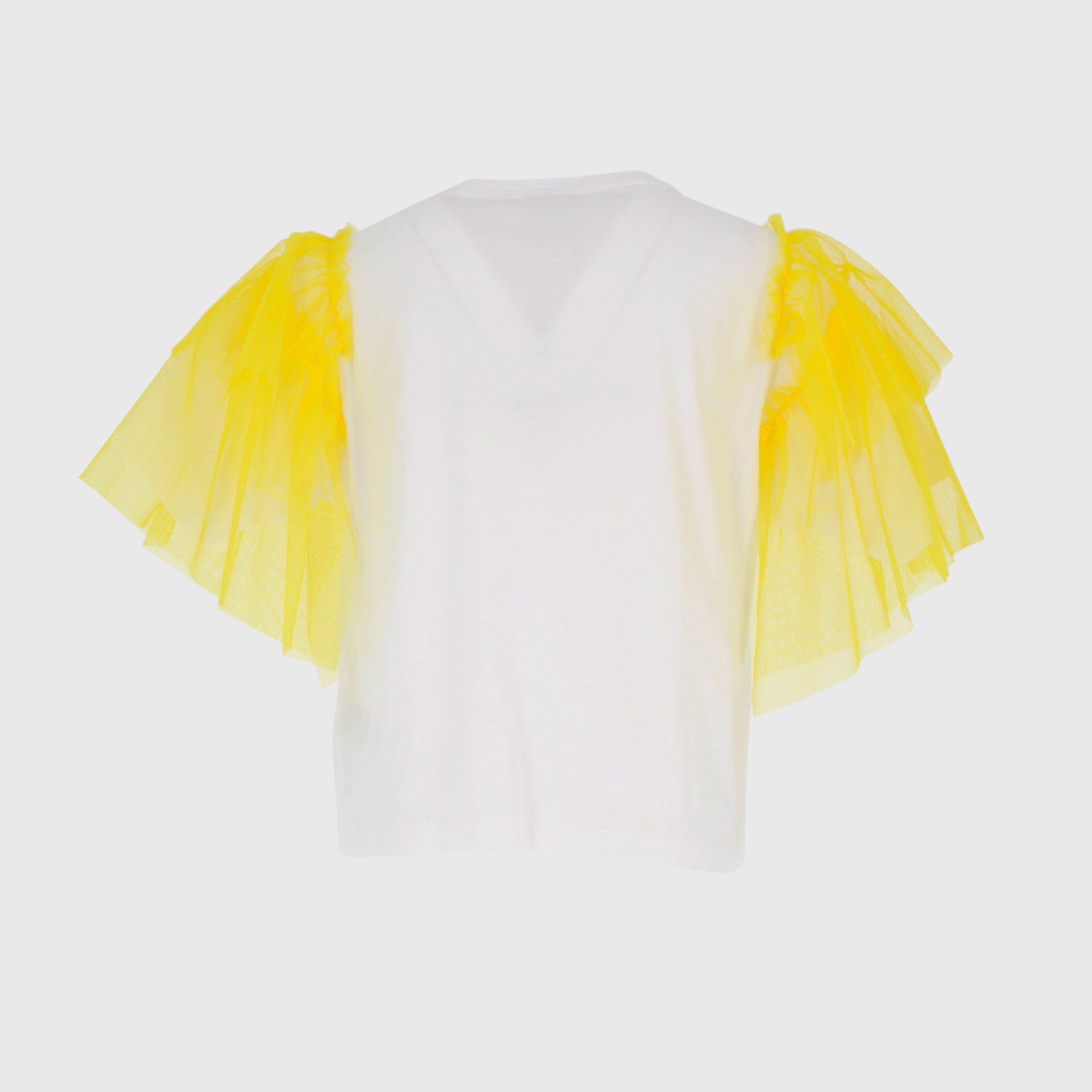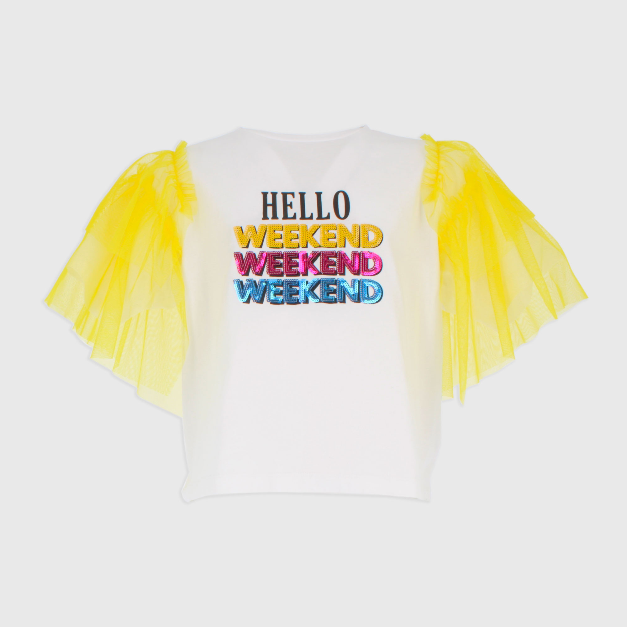 Футболка из джерси, круглый вырез, короткие рукава. Принт с пайетками спереди и оборками из тюля на рукавах.