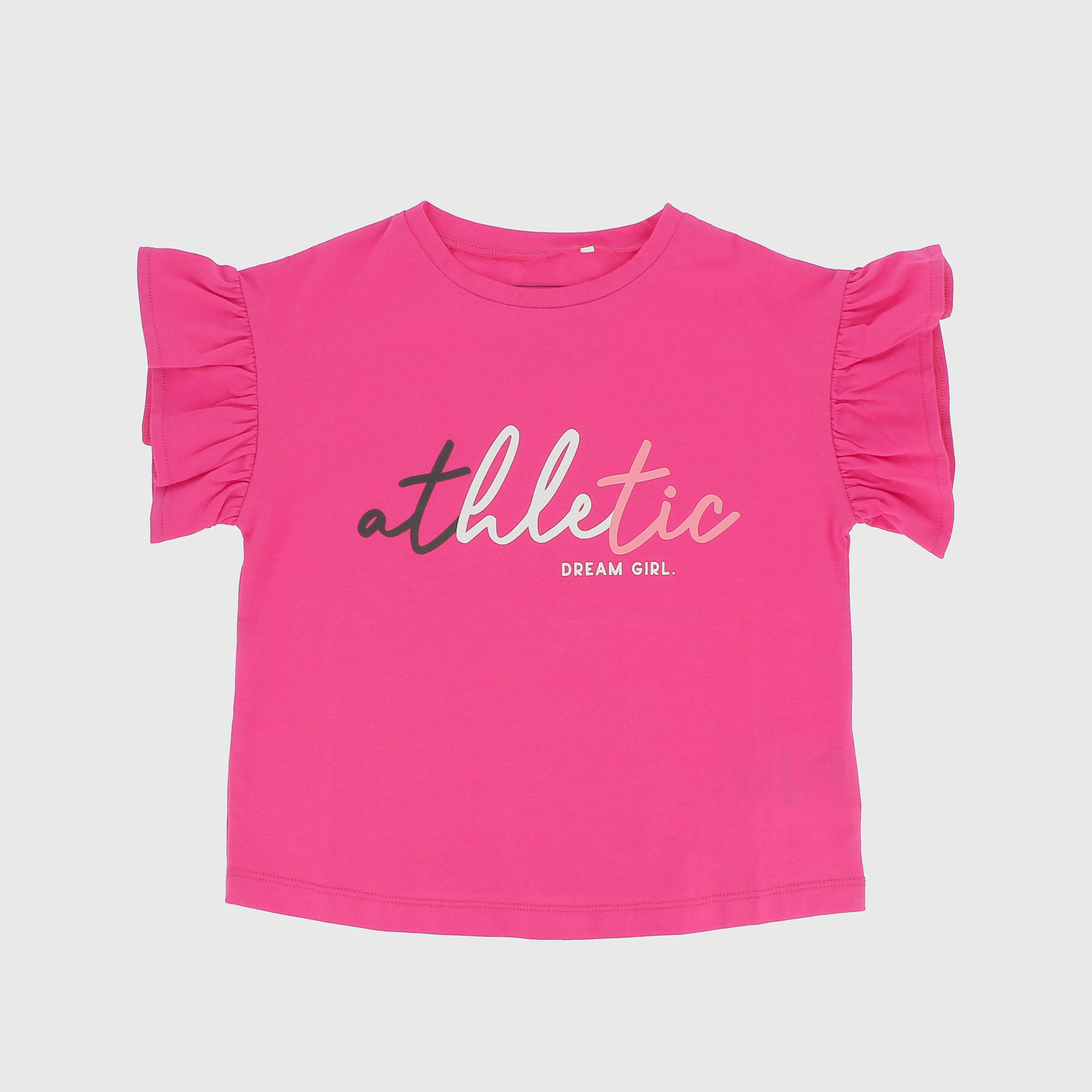 Футболка из джерси, круглый вырез, короткие рукава с воланами. Фронтальная печать.