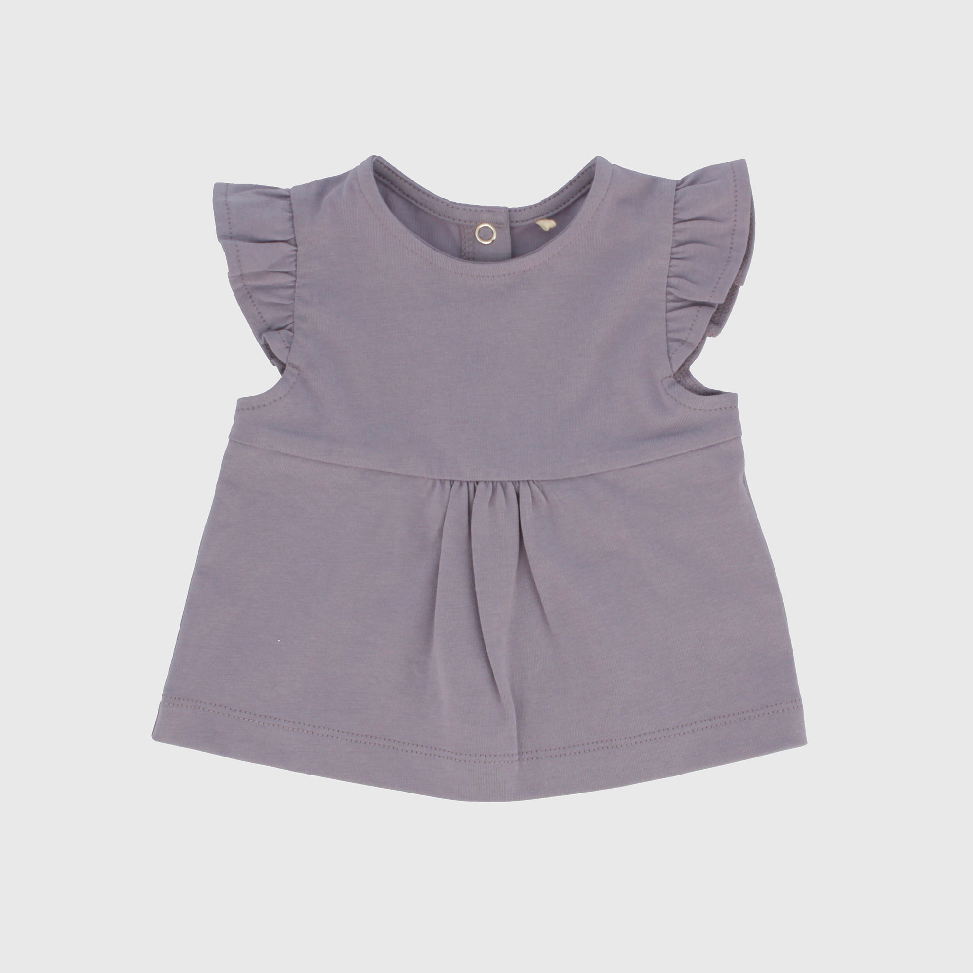 Футболка из джерси, круглый вырез, короткие рукава с воланами. Застежка сзади. Эта одежда экологична, потому что изготовлена из органического хлопка.