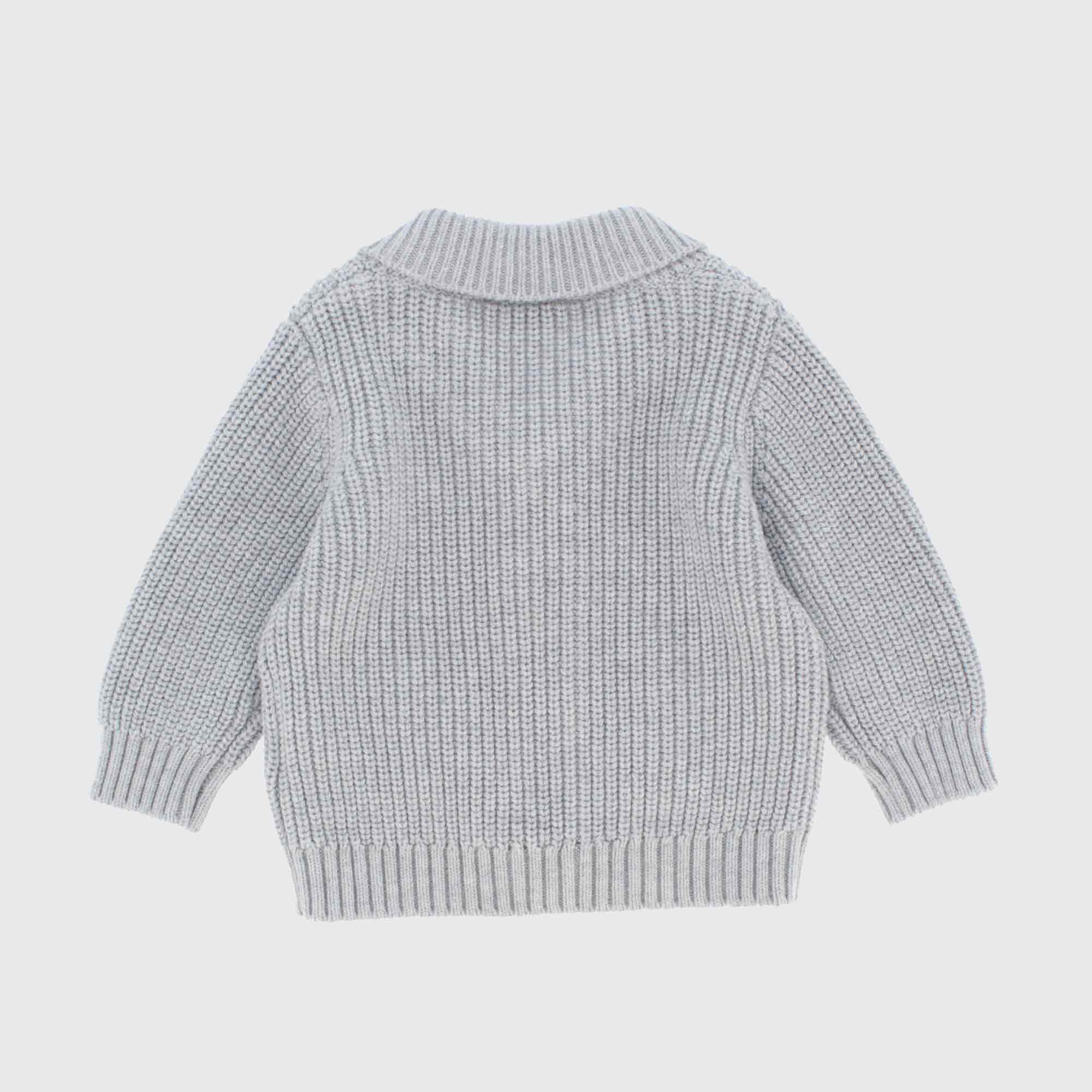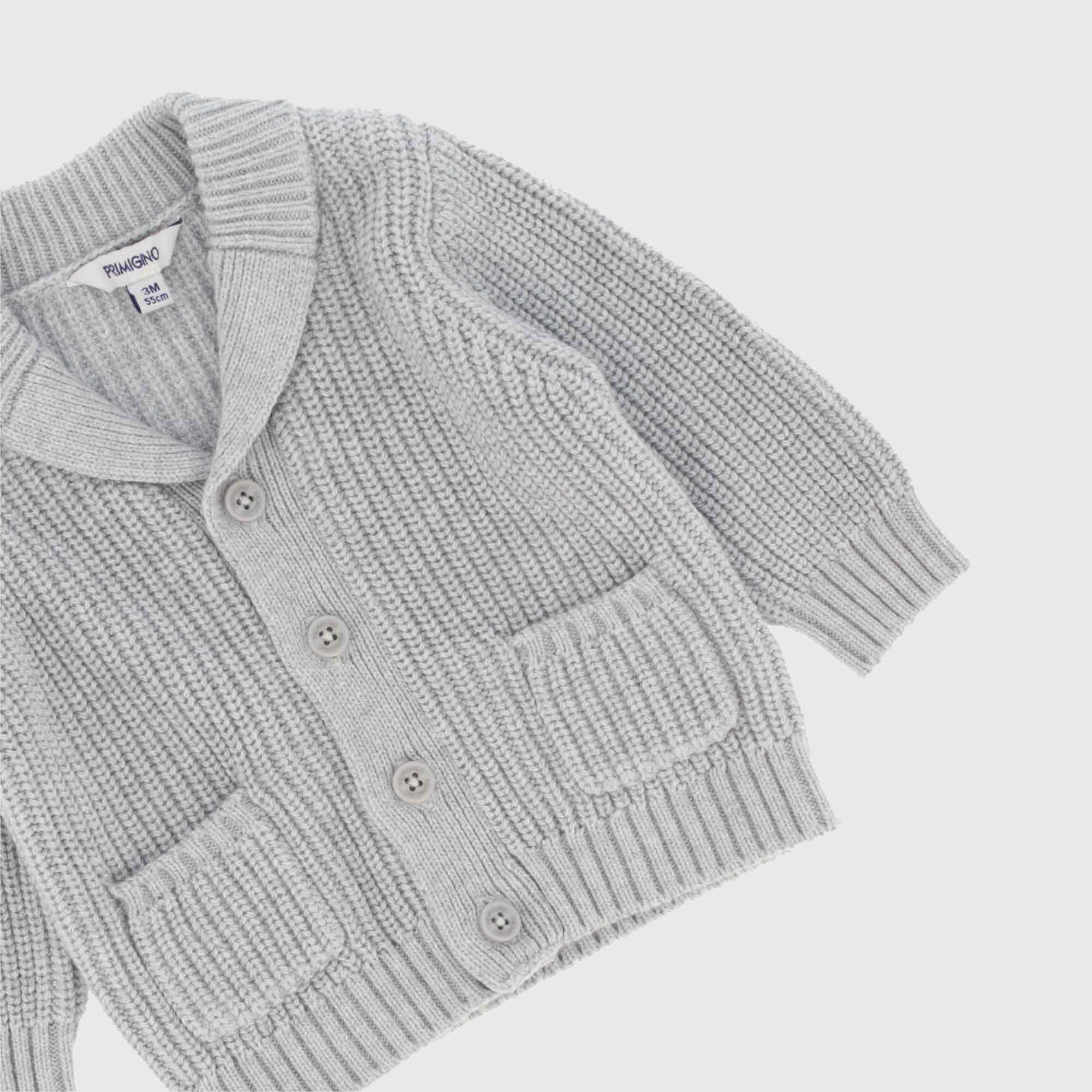 Вязаный кардиган в рубчик, V-образный вырез с лацканами, длинные рукава. Застежка на пуговицы спереди. Передние карманы.