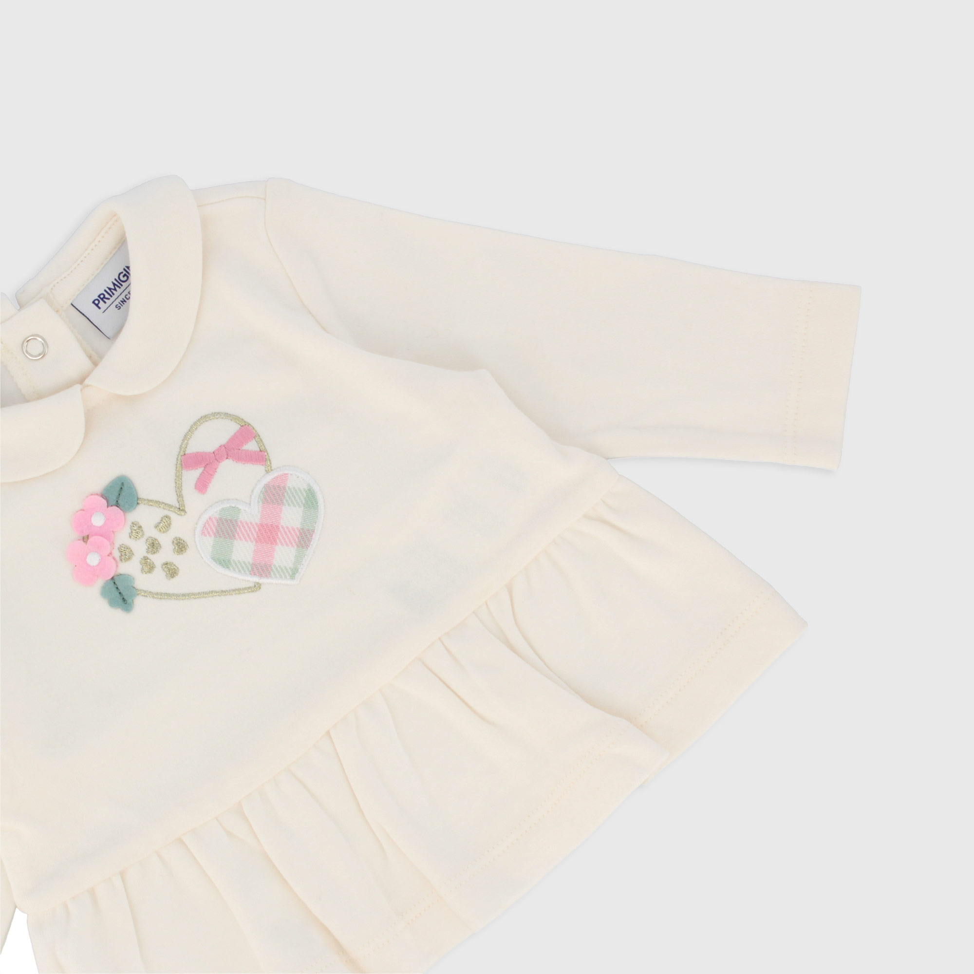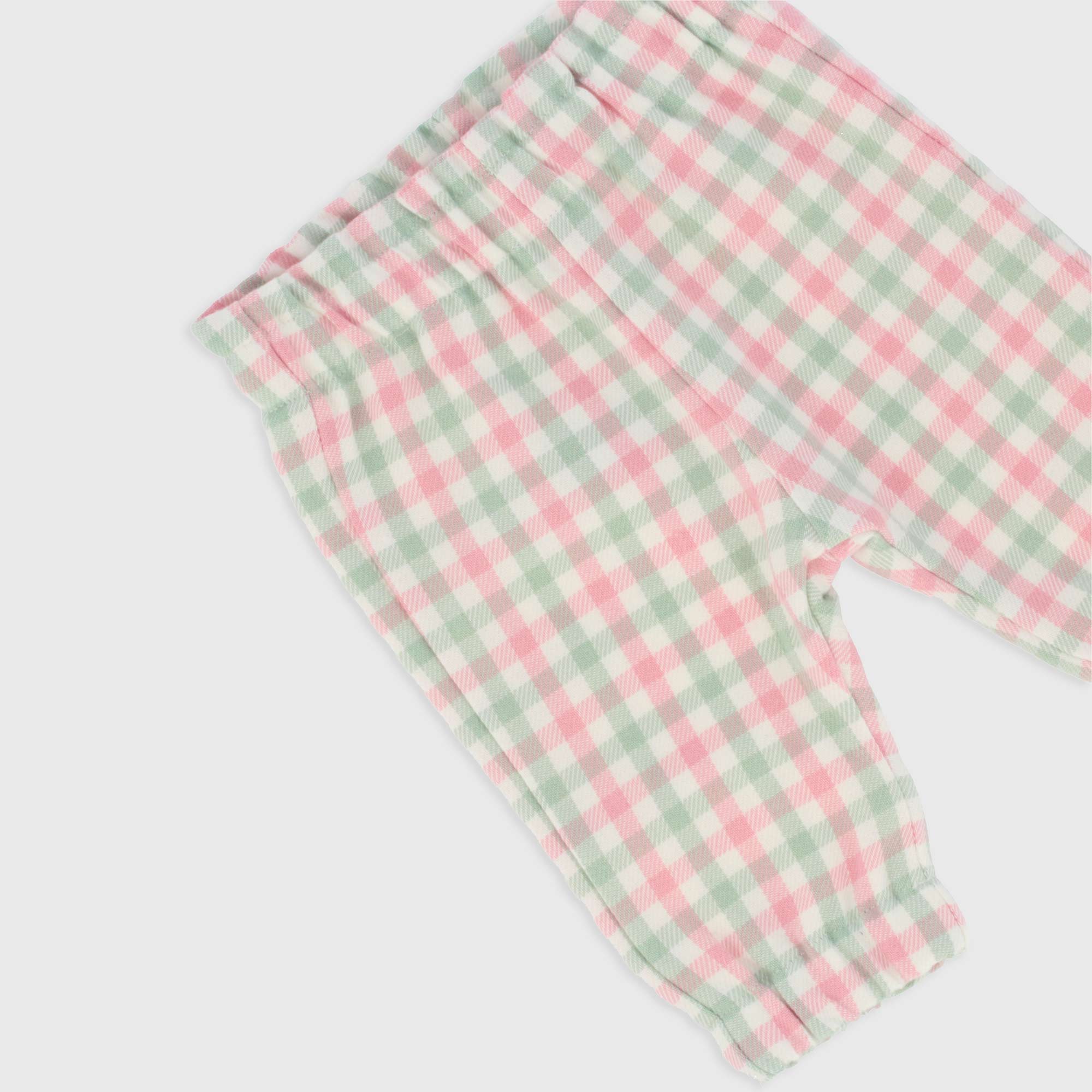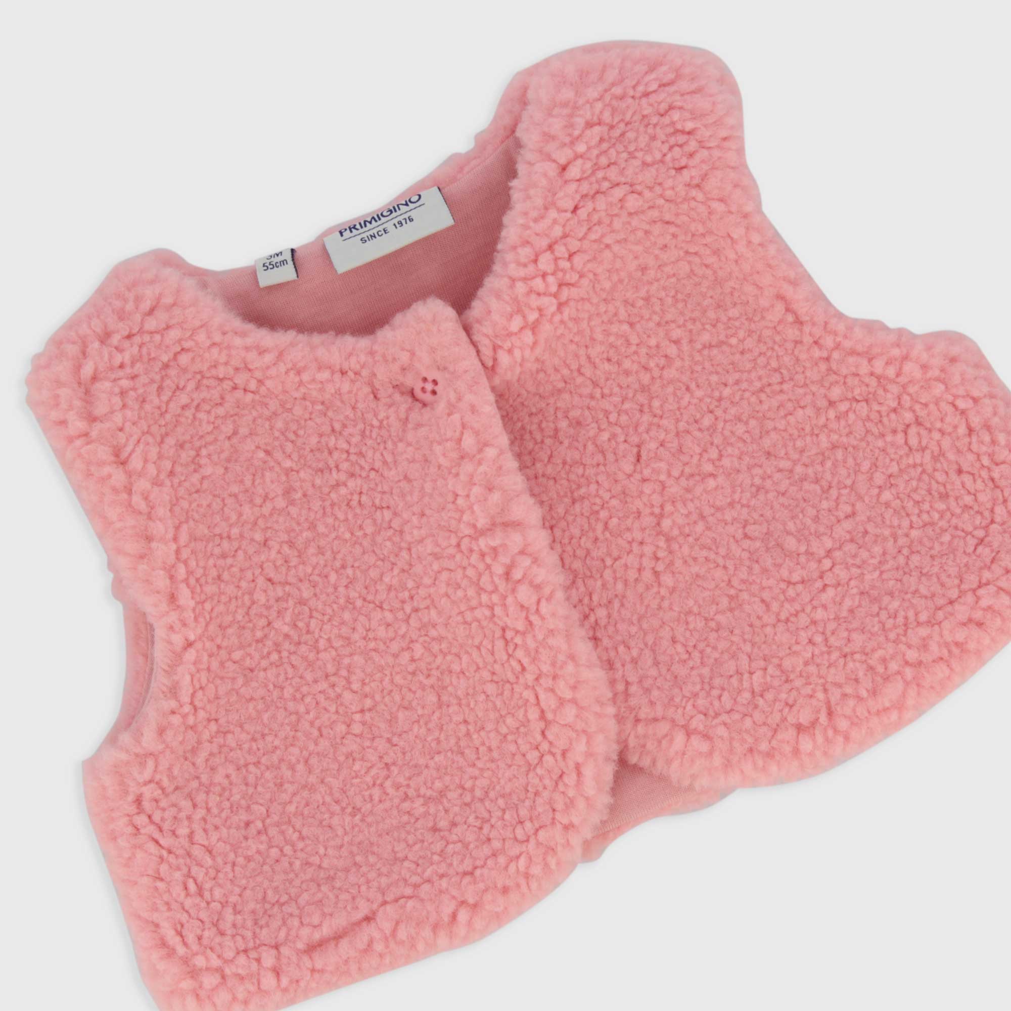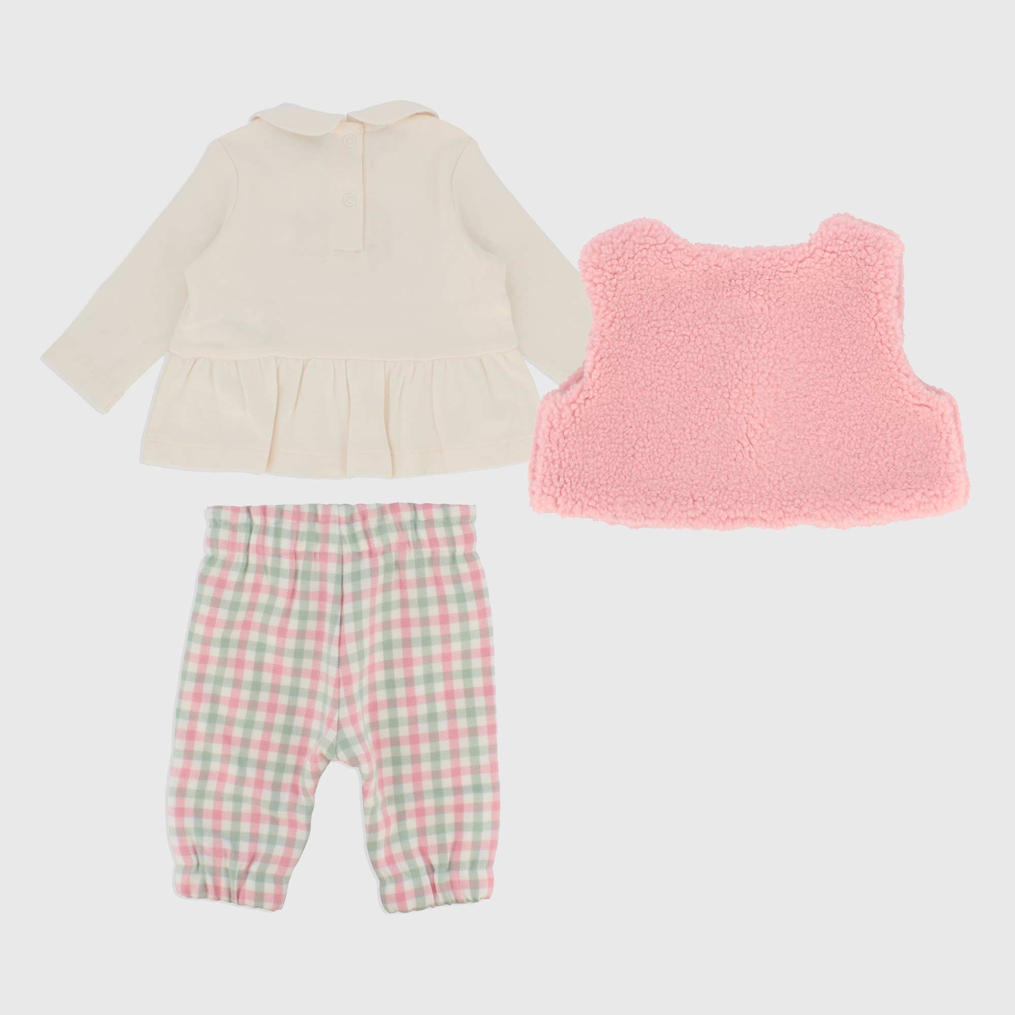 Набор из трех частей. Жилет Тедди из искусственного меха. Застежка на пуговицу. Рубашка из джерси с воротником, длинными рукавами. Закрывается на автоматические пуговицы на плече. Приложения на фронте. Брюки из ткани с эффектом шерсти в клетку с эластичной талией.