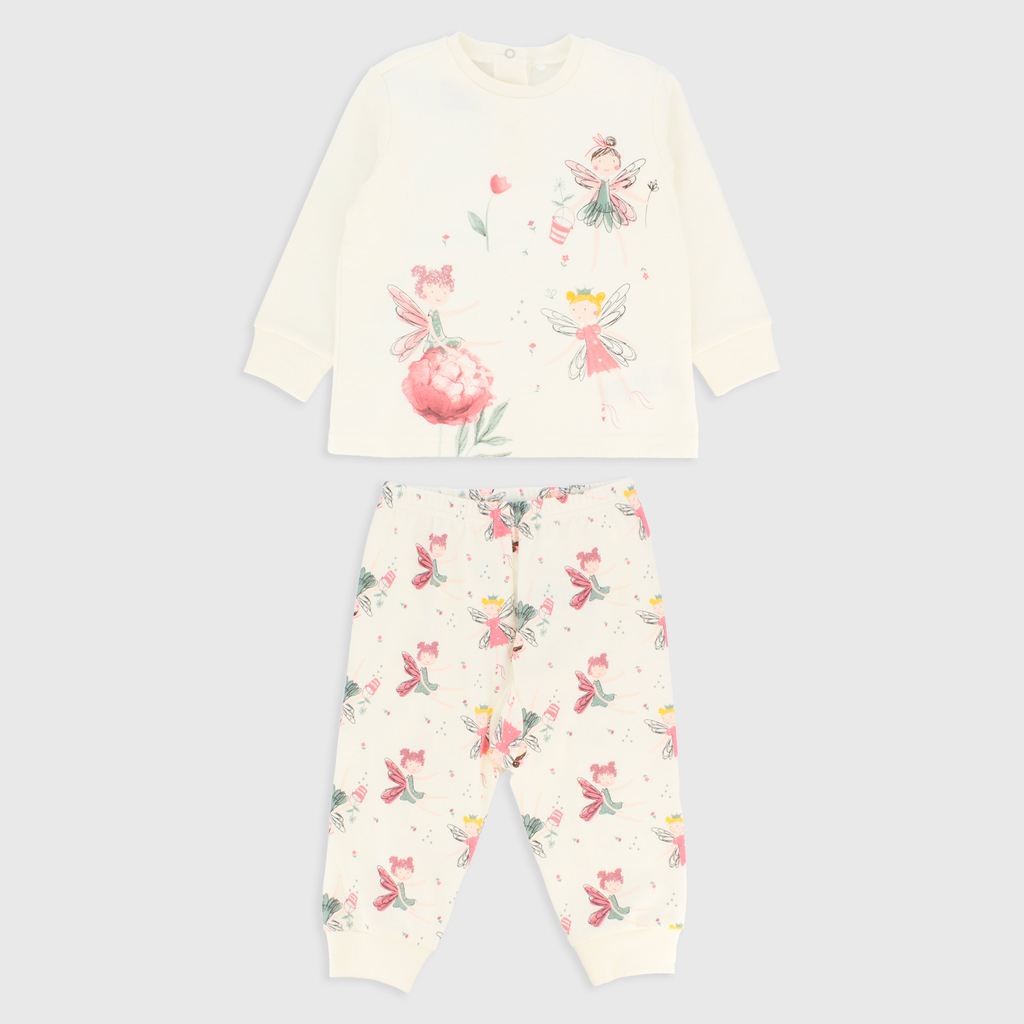 Пижамный комплект из теплого хлопка. Рубашка с круглым вырезом и длинными рукавами. Застежка на кнопки сзади и ребристые манжеты. Печать спереди. Брюки с эластичной талией и ребристым низом. Сплошной сказочный принт.