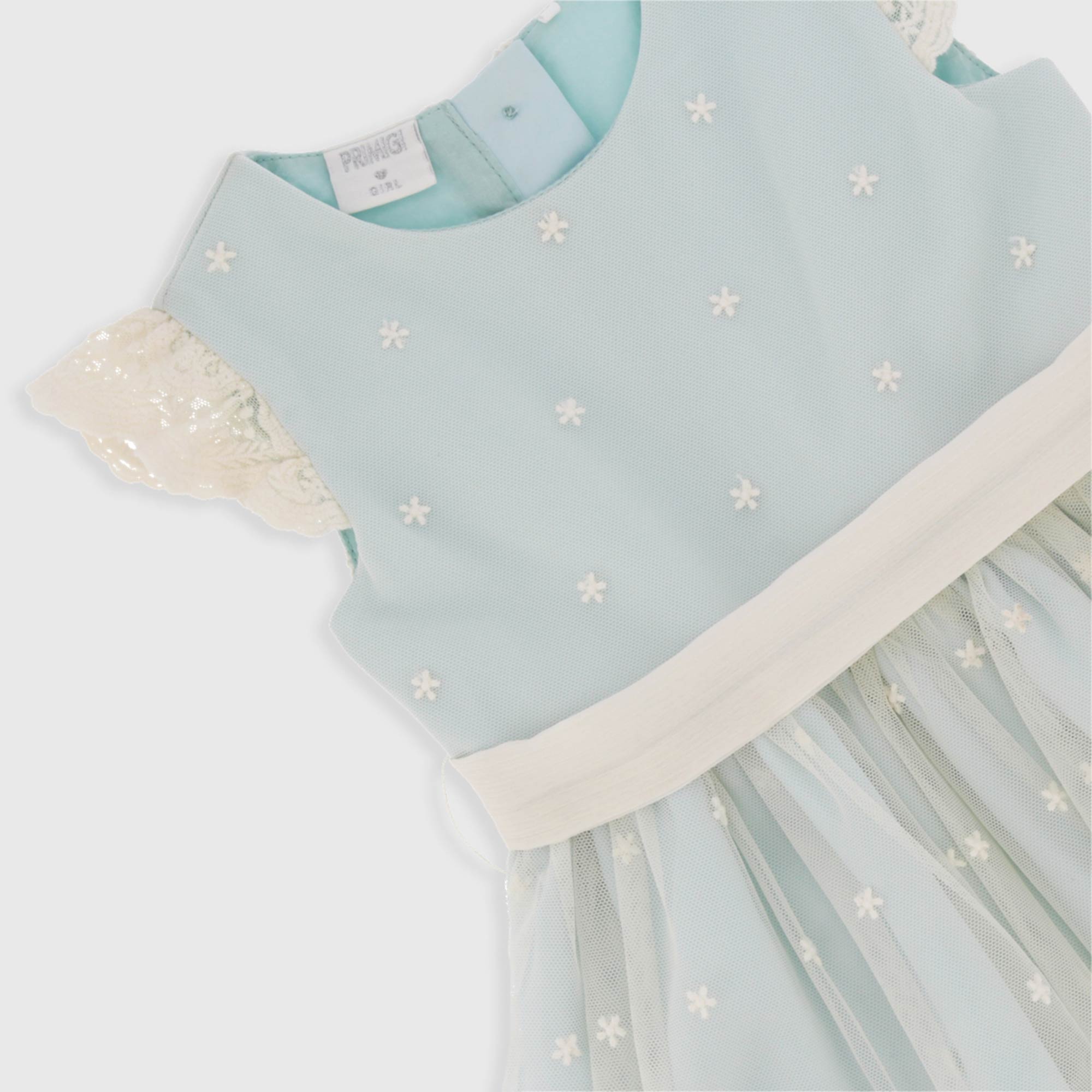 Платье из двойного атласа с вышитым тюлем, круглым вырезом, проймами с кружевными рюшами. Застежка сзади на пуговицы. Вырез на талии со складками спереди и сзади. Подкладка из хлопкового муслина. Съемный ремень из крепа.
