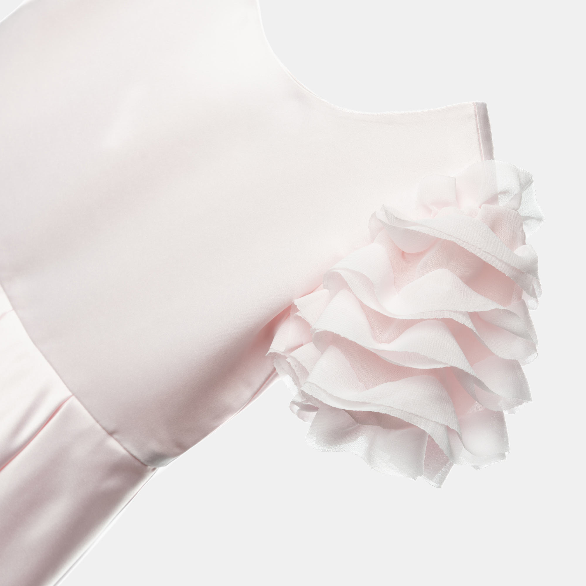 Атласное платье, круглый вырез горловины, короткие рукава с рюшами с объемным эффектом. Застежка сзади на потайную молнию. Вырез на талии со складками спереди и сзади. Подкладка и нижняя юбка из тюля.