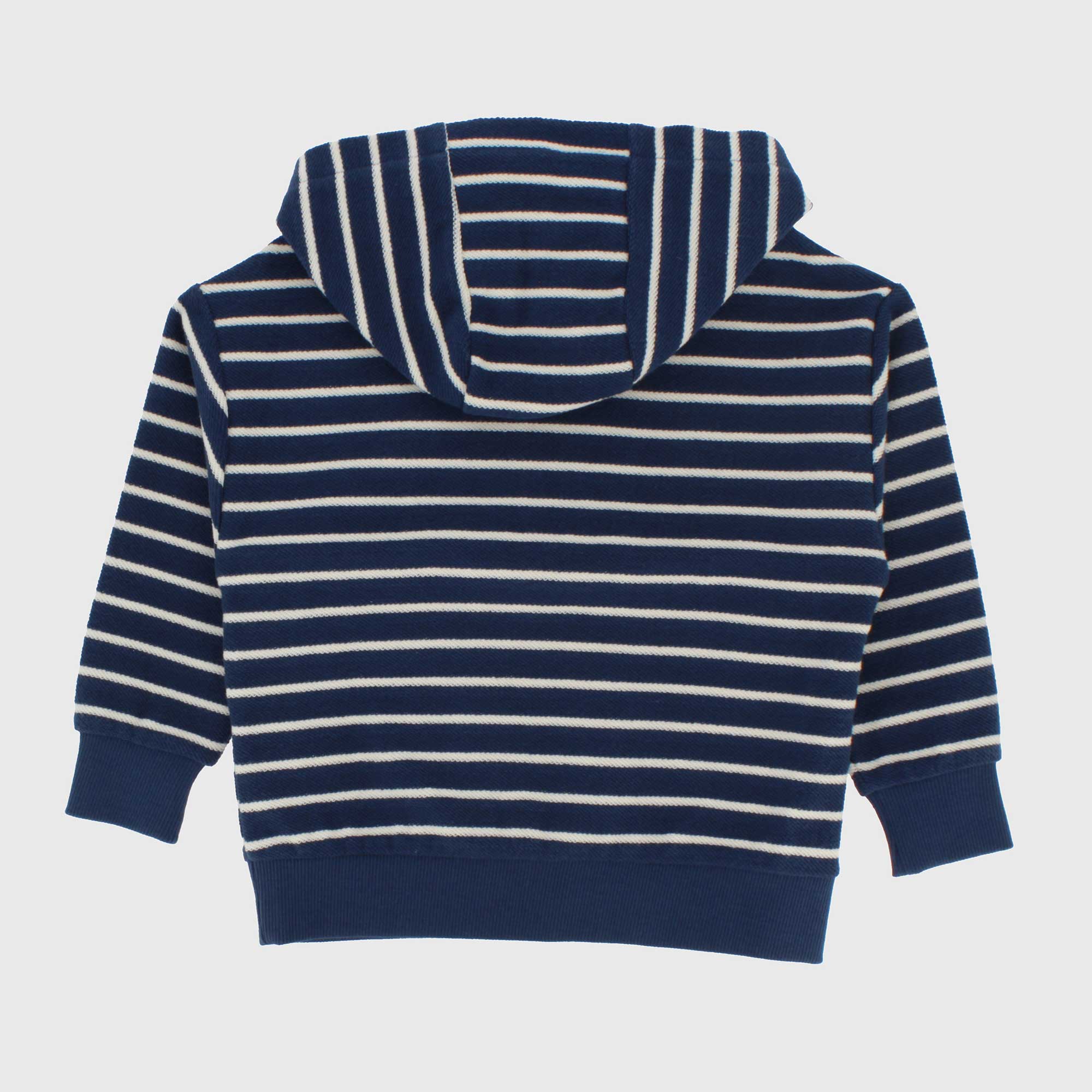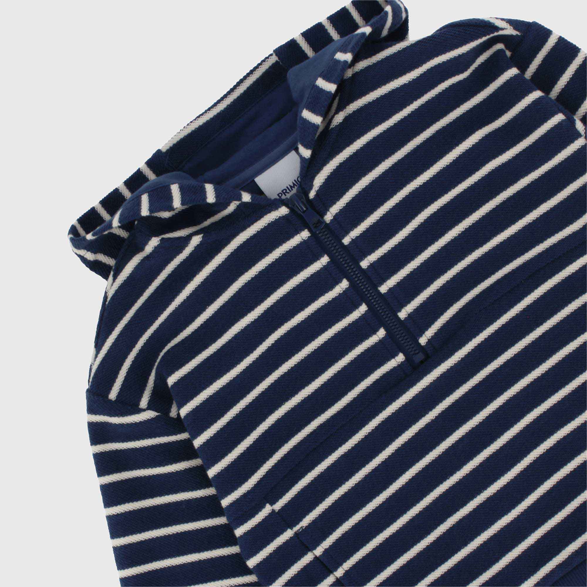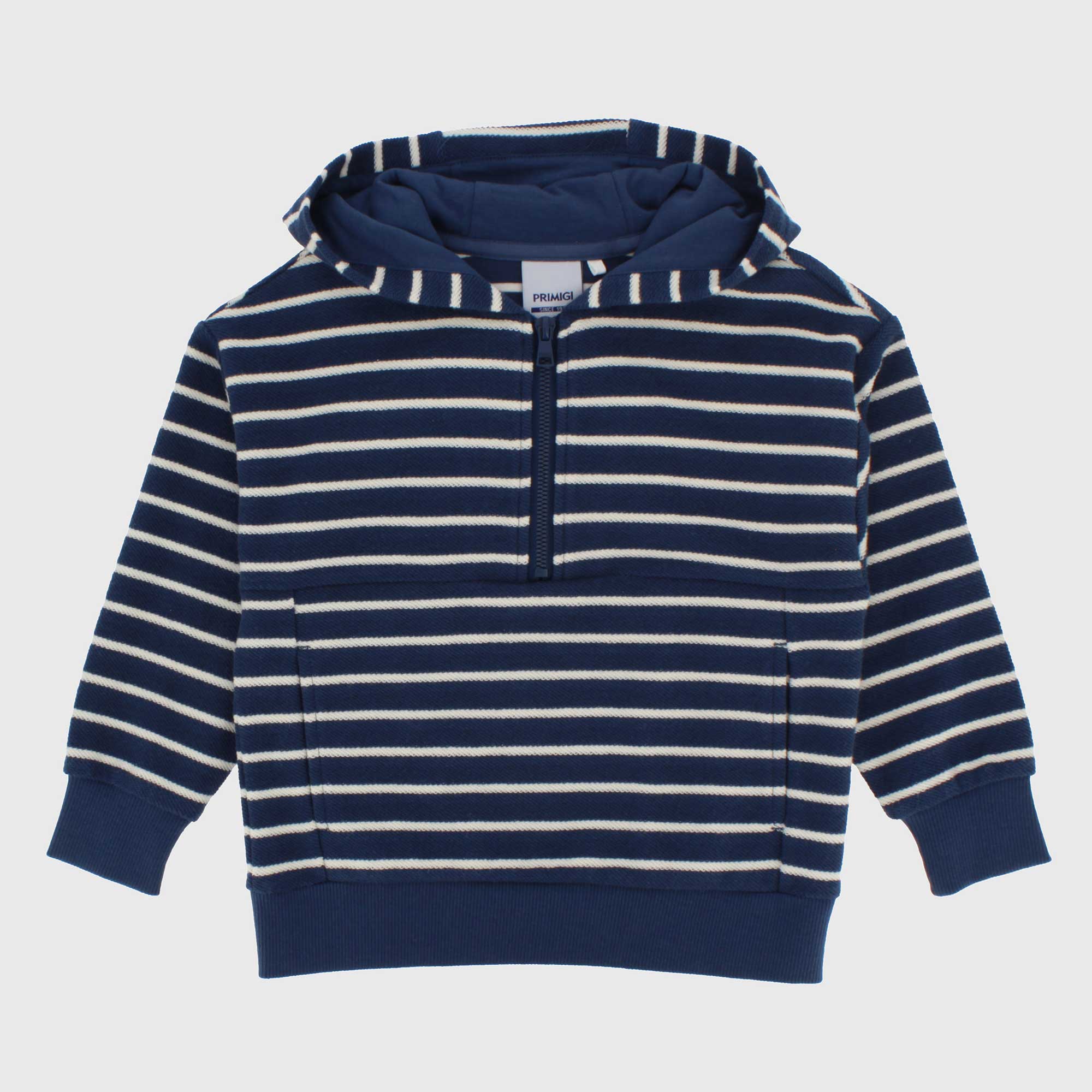 Толстовка с застежкой-молнией до половины, капюшоном, полосками, окрашенными в пряжу, и длинными рукавами. Потайной карман спереди. Ребристые манжеты и низ.