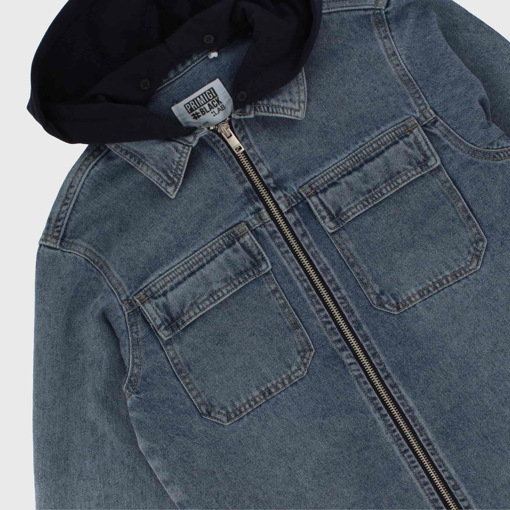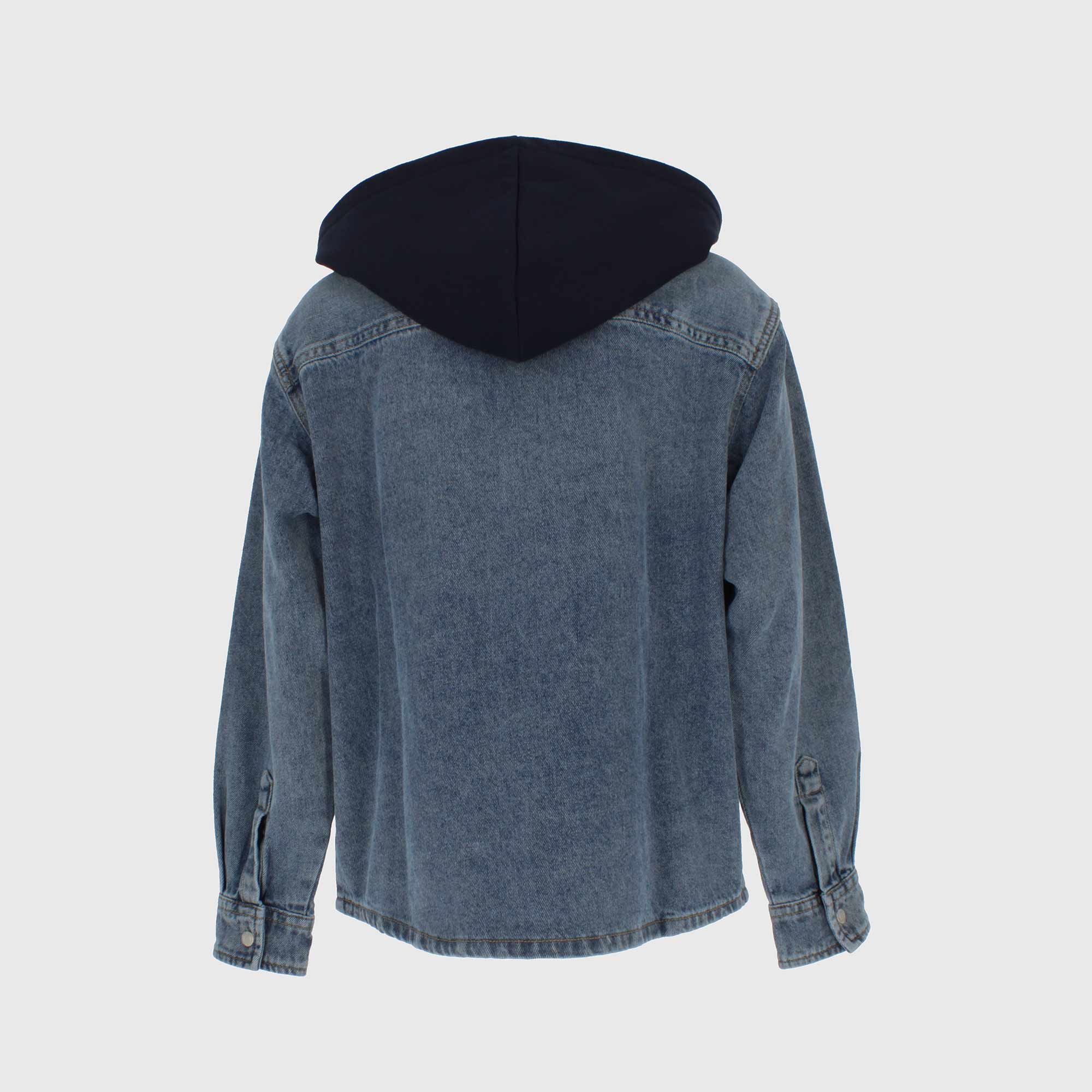 Джинсовая рубашка с флисовым капюшоном и длинными рукавами. Застежка-молния спереди. Накладные карманы с клапаном.