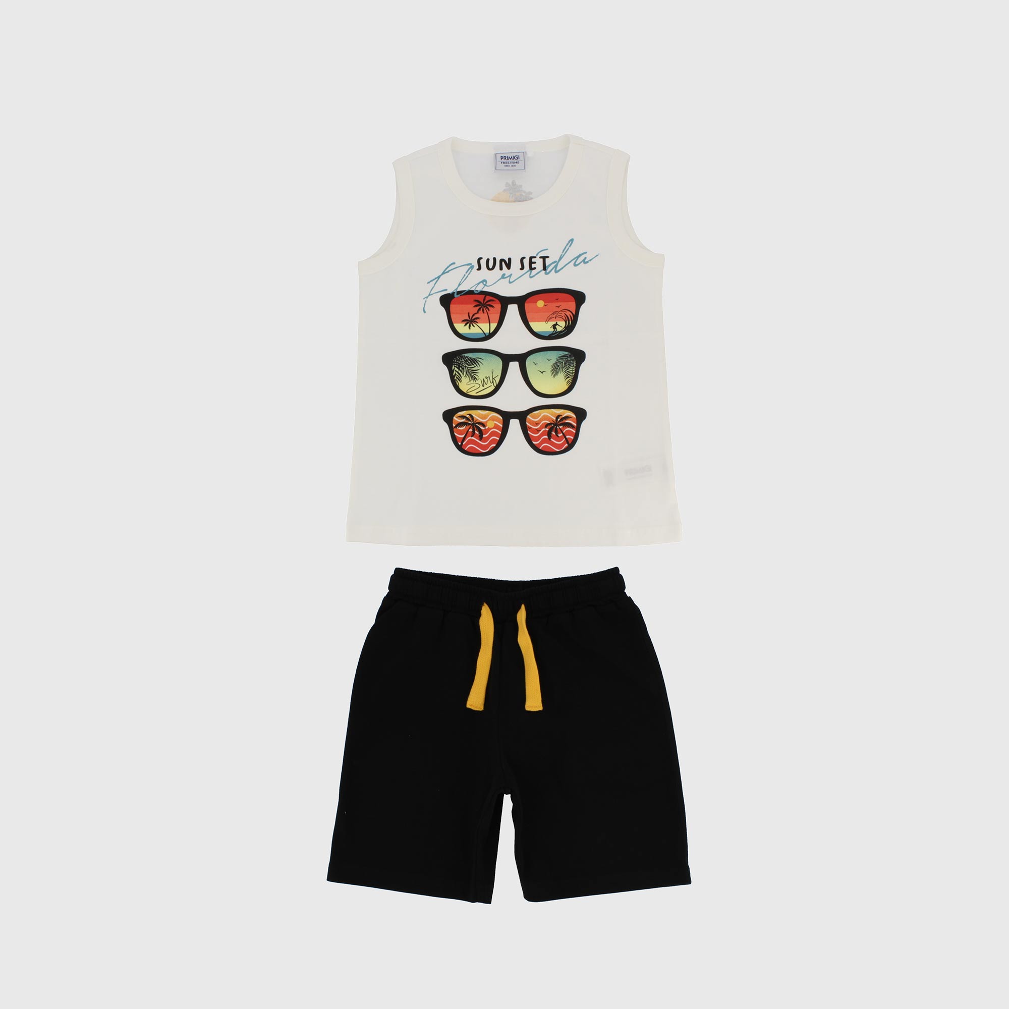 Набор состоящий из двух штук. Майка из джерси с круглым вырезом. Принт спереди и сзади. Шорты-бермуды из джерси с эластичной резинкой на талии и контрастными шнурками спереди.