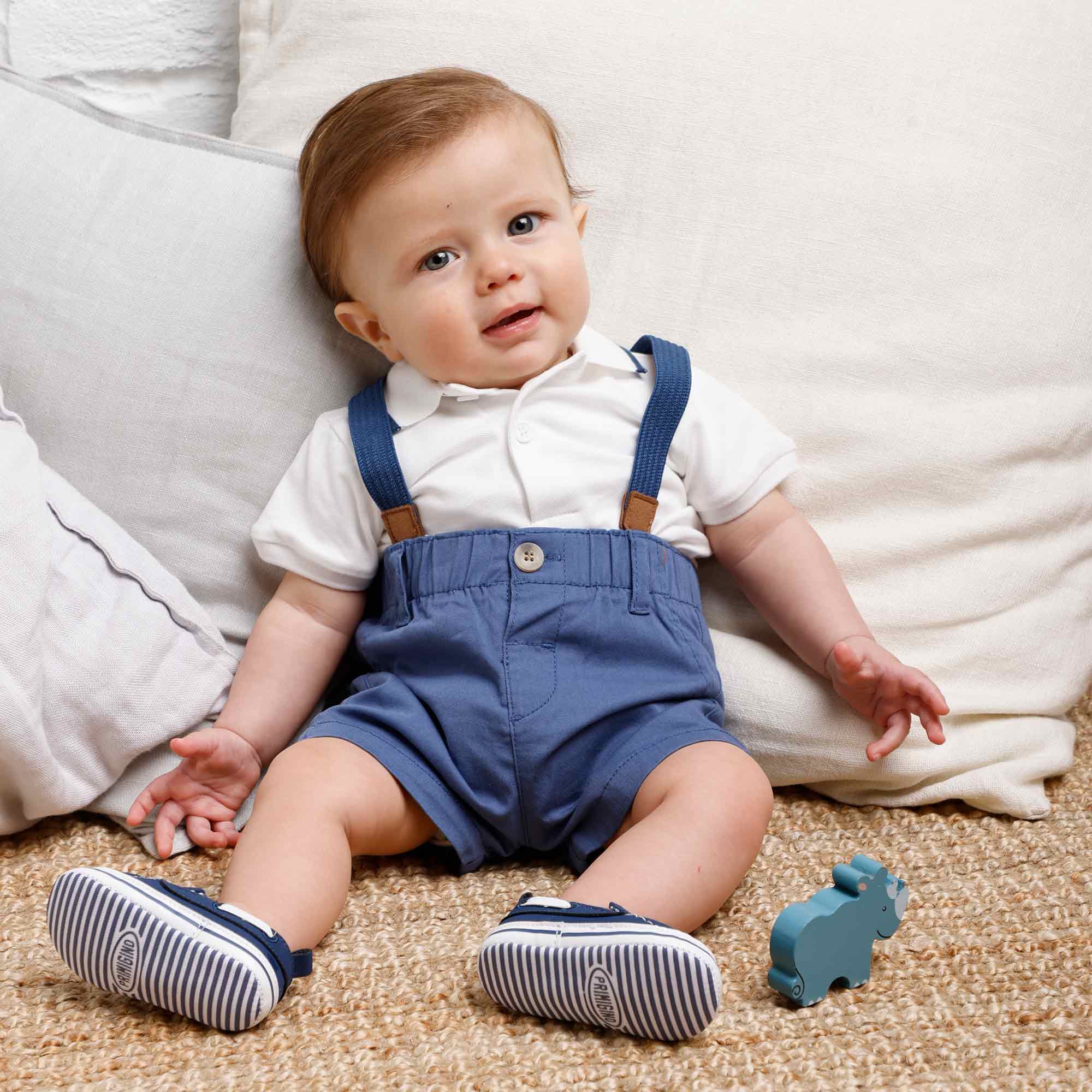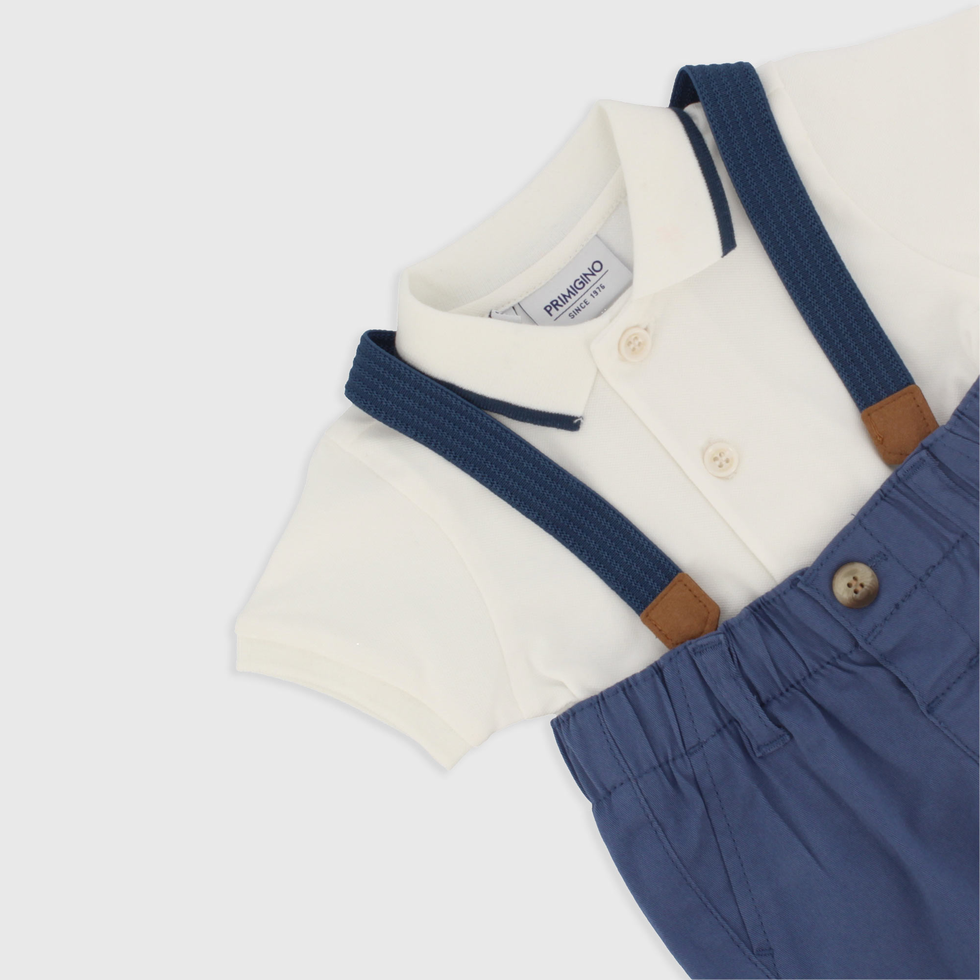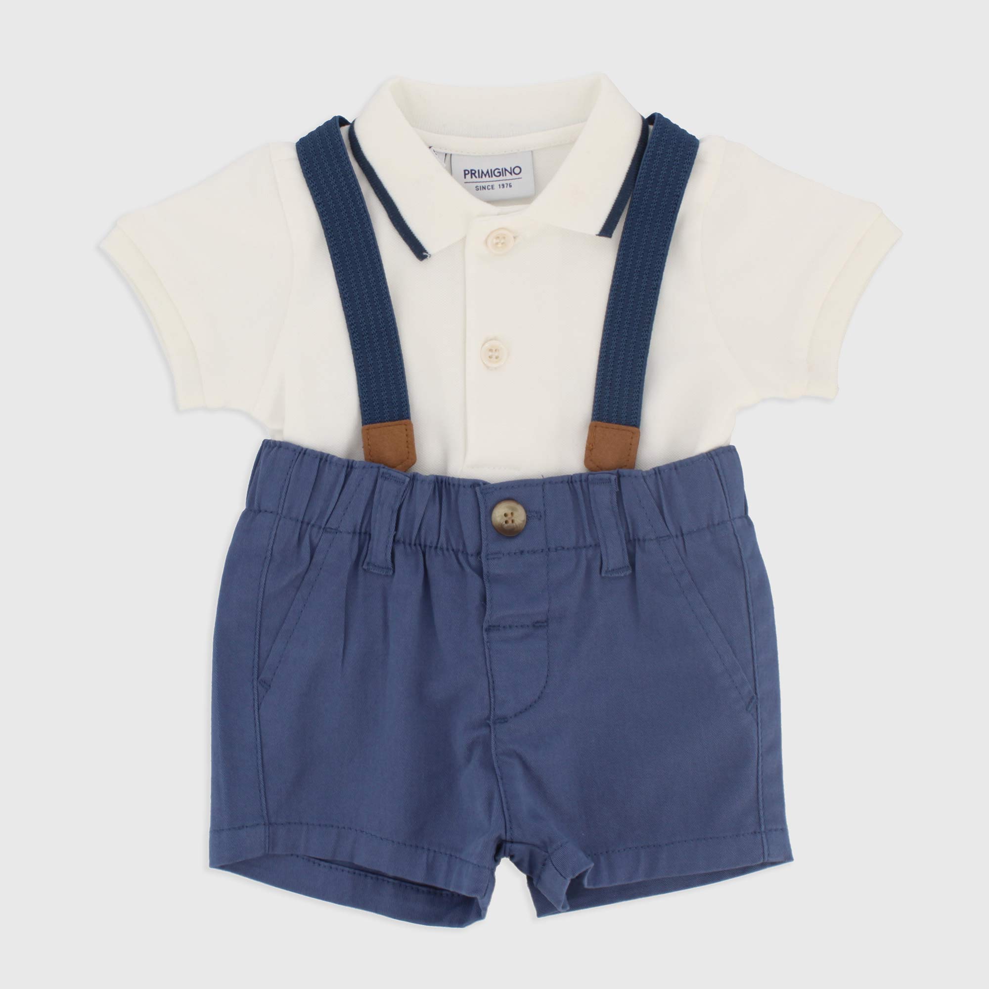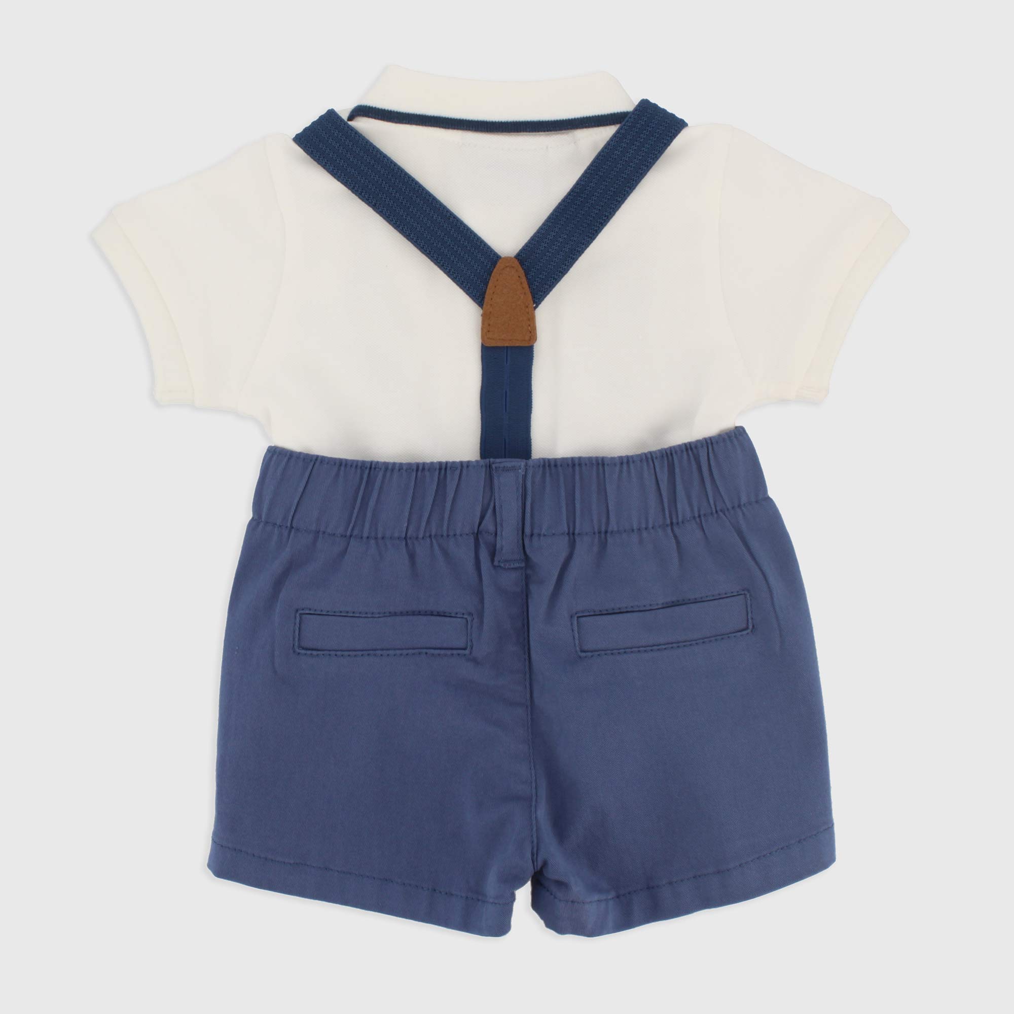 Набор состоящий из двух штук. Рубашка-поло из пике с короткими рукавами. Габардиновые шорты-бермуды со съемными бретелями. Эластичная талия и ложные карманы сзади..