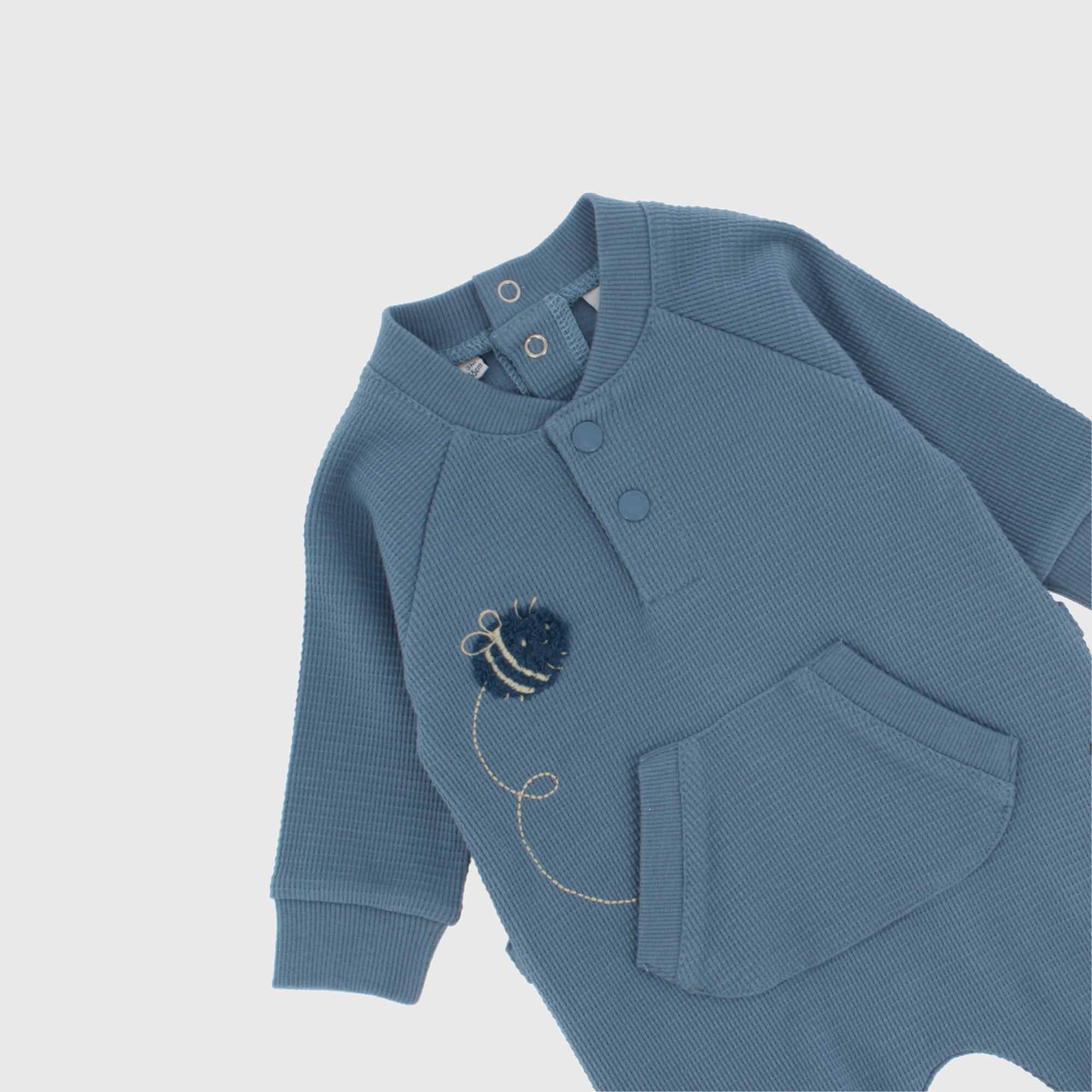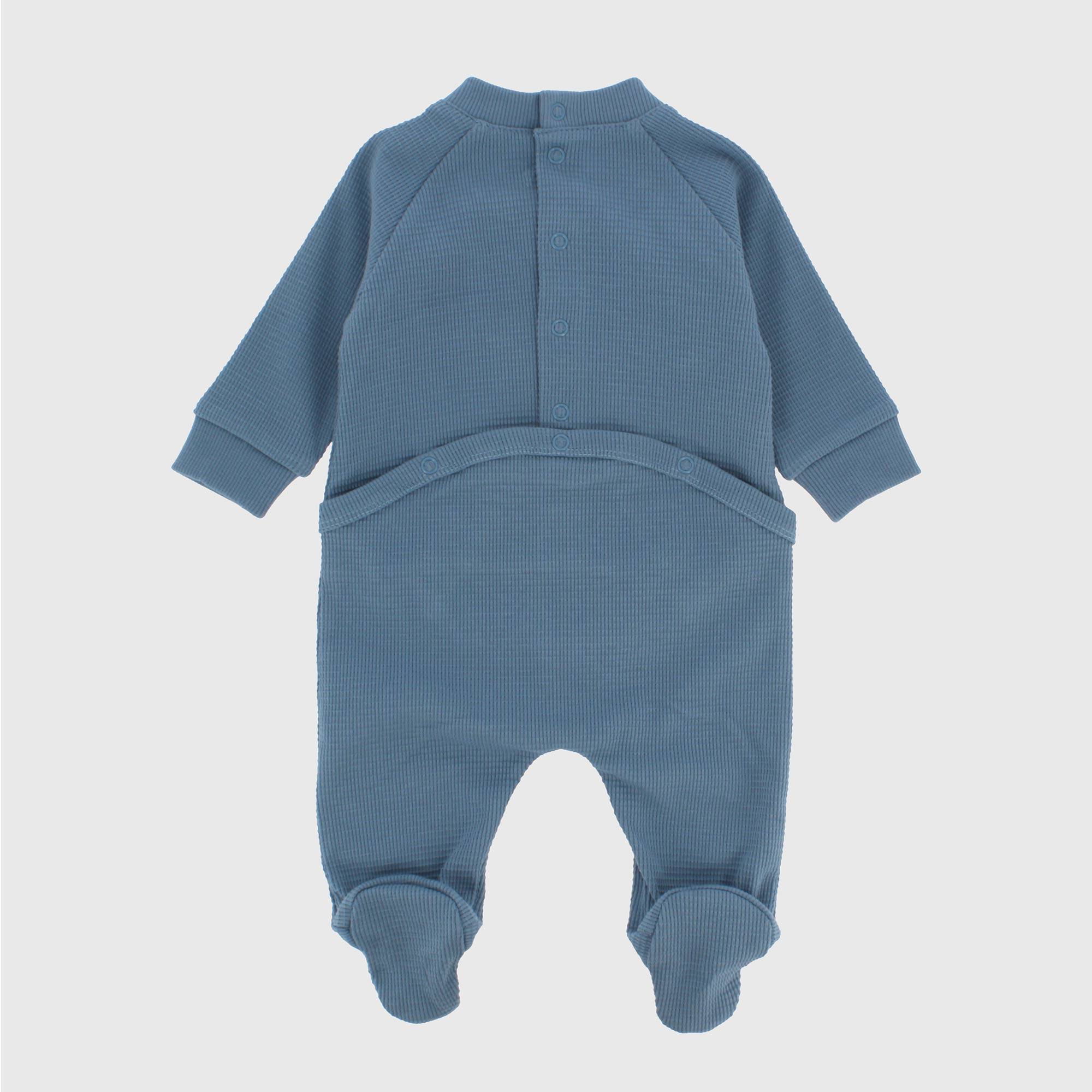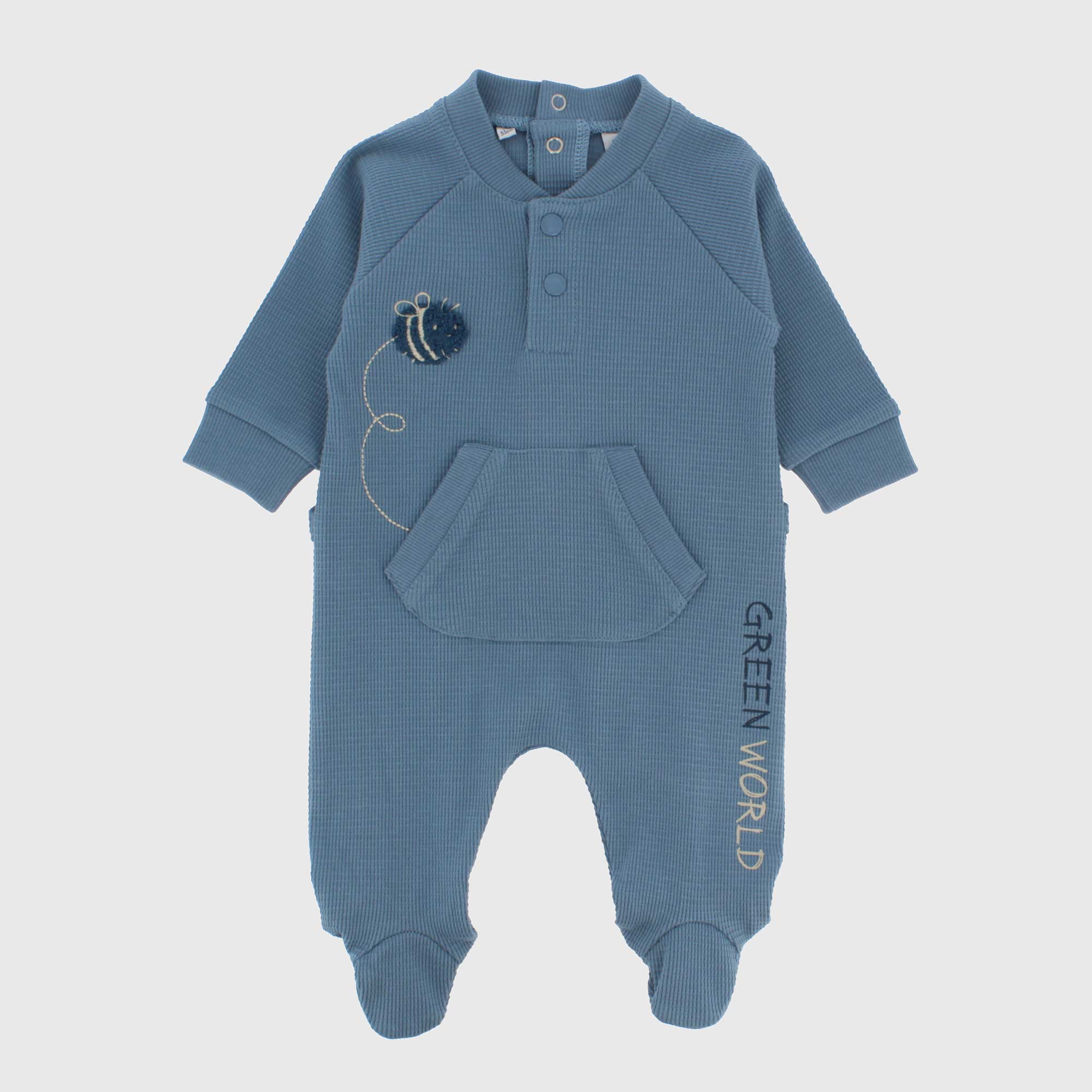 Комбинезон из сотовой ткани, круглый вырез горловины, длинные рукава. Застежка на кнопки сзади. Карман-кенгуру, вышивка с эффектом губки и принт спереди.