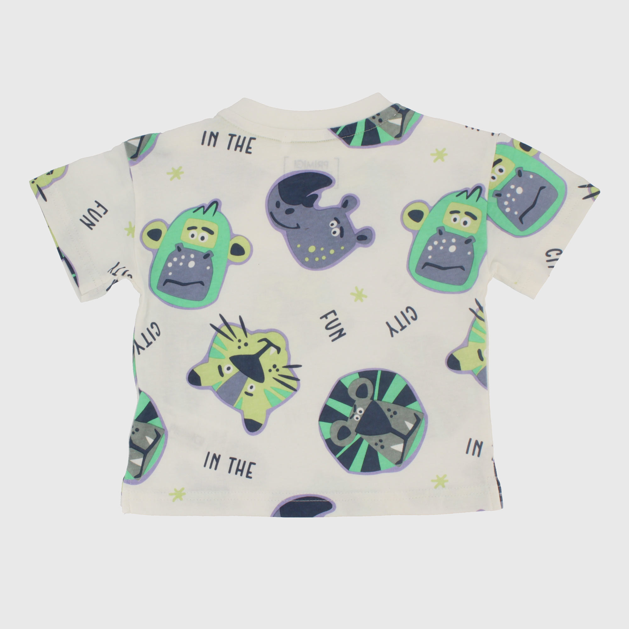 Футболка оверсайз из джерси, круглый вырез, короткие рукава. Застежка на кнопки на плече. Принт по всей поверхности и разрезы внизу.