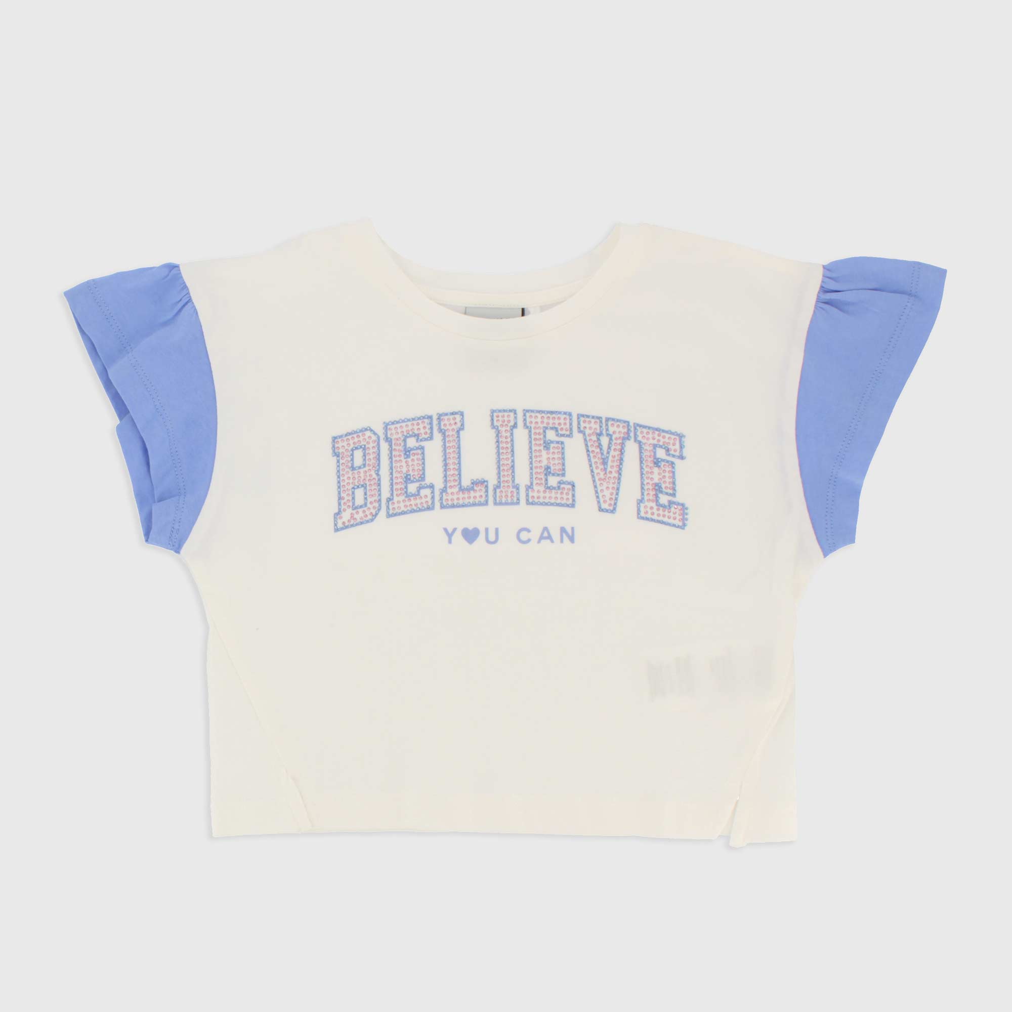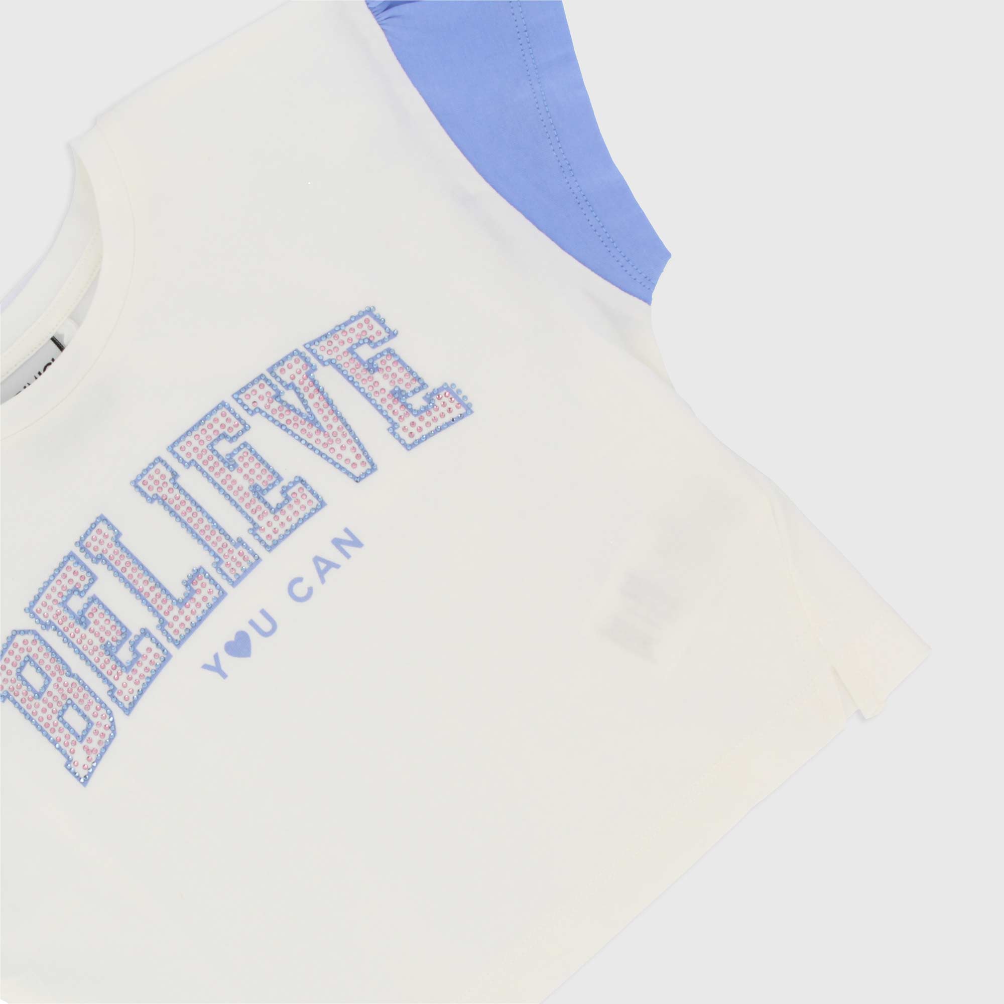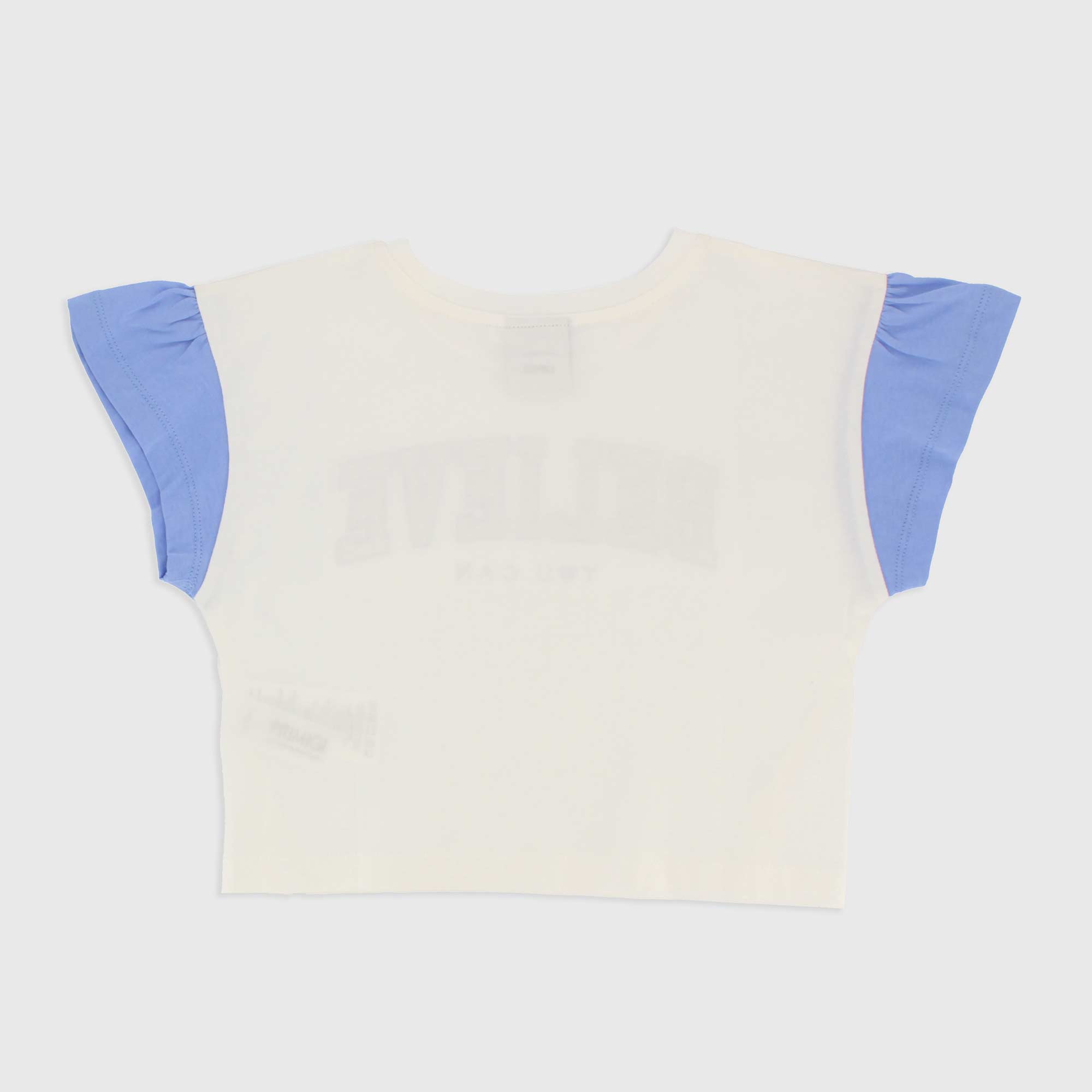 Футболка из джерси, круглый вырез, короткие рукава с рюшами. Принт спереди со стразами.