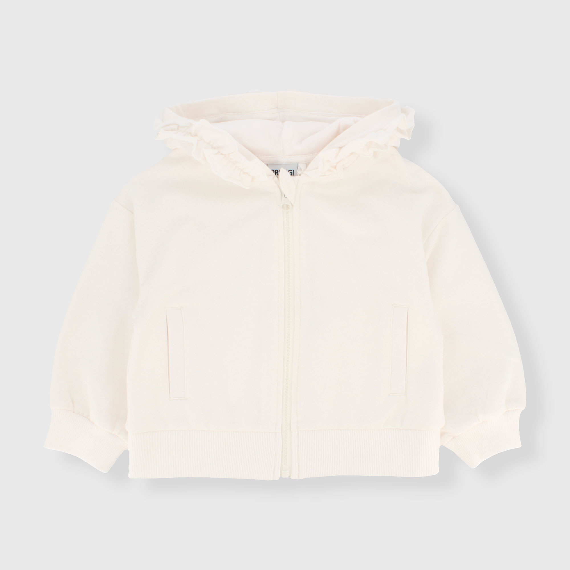 Толстовка с открытым капюшоном и длинными рукавами. Застежка-молния спереди. Воланты нанесены по краю капюшона. Прорезные карманы. Ребристые манжеты и низ.