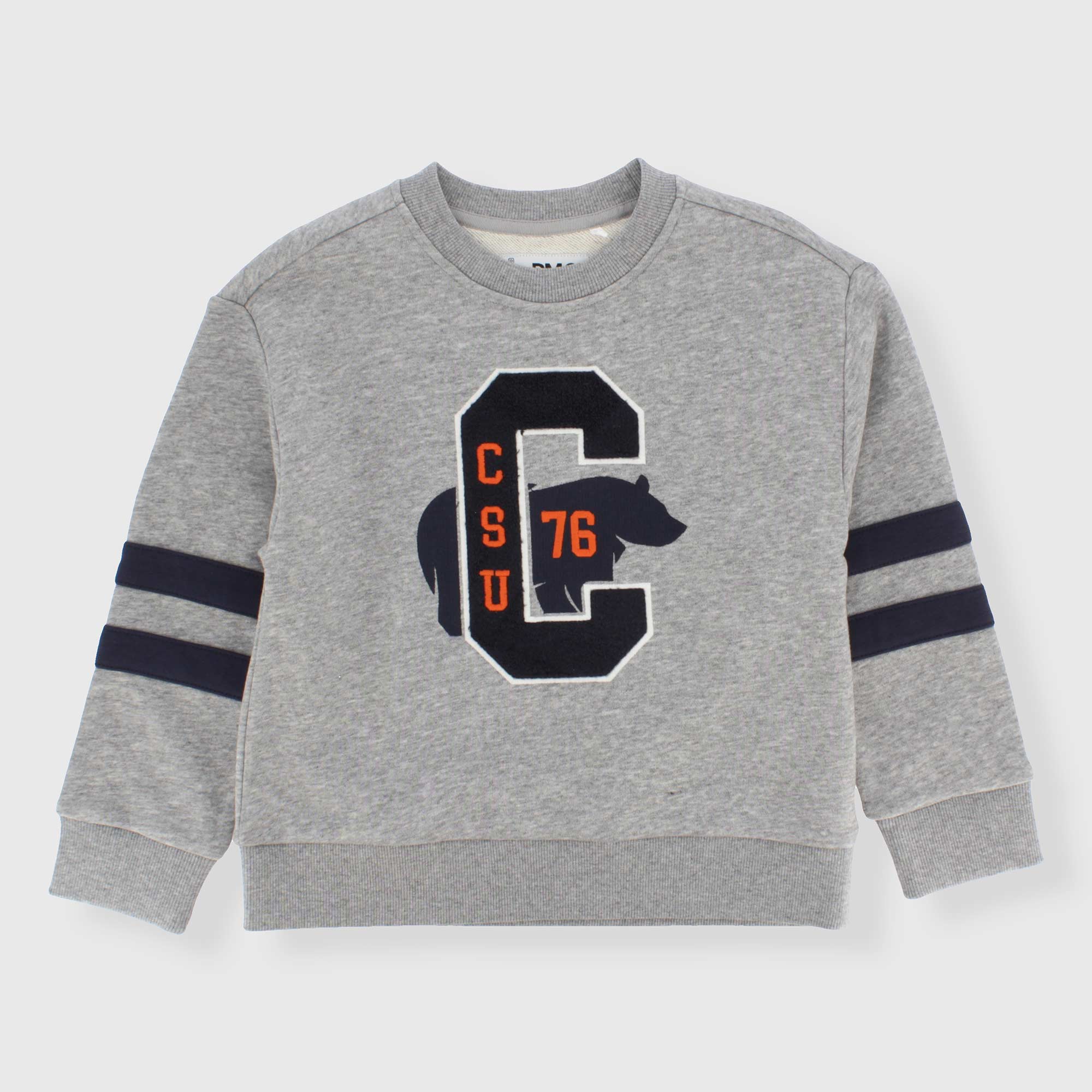 Толстовка с круглым вырезом, длинные рукава. Нашивки и вышивка спереди. На рукавах нанесены контрастные ленты. Ребристый воротник, манжеты и низ.