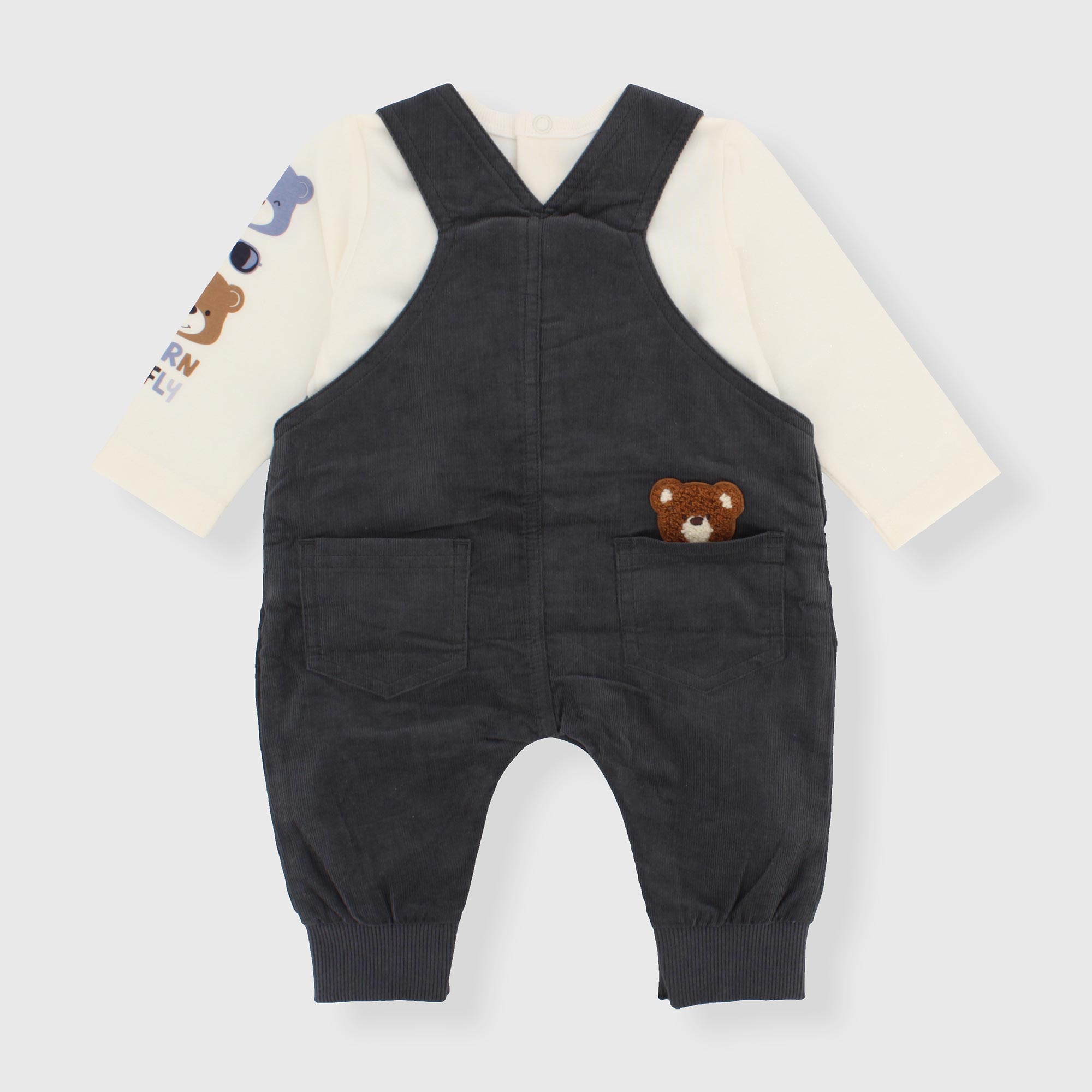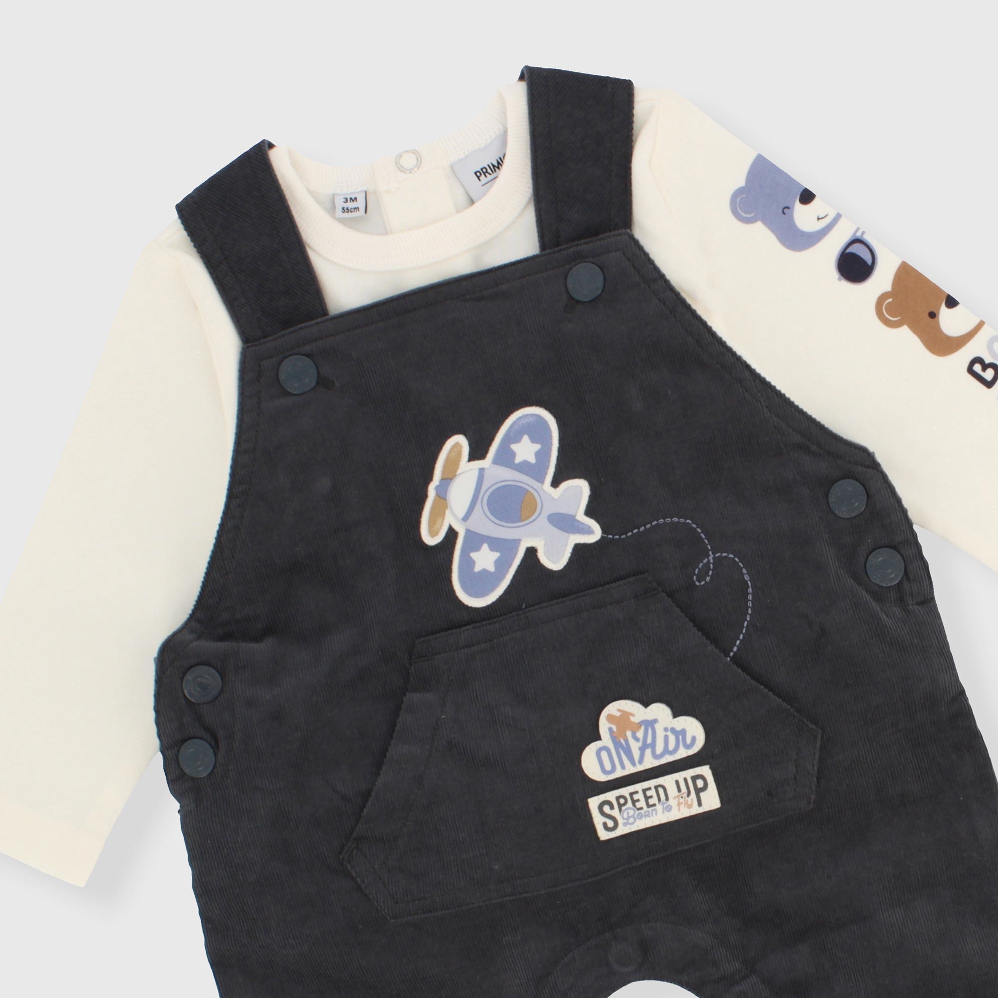 Набор состоящий из двух штук. Футболка, круглый вырез, длинные рукава. Застежка на кнопки сзади. Печать на руке. Вельветовый комбинезон. Застежка на пуговицы спереди и сбоку. Нашивка с тематикой «Авиатор» спереди. Передний карман-кенгуру. Накладные карманы сзади с нашивкой в виде плюшевого мишки махровой вышивкой. Внутренняя подкладка из трикотажа.