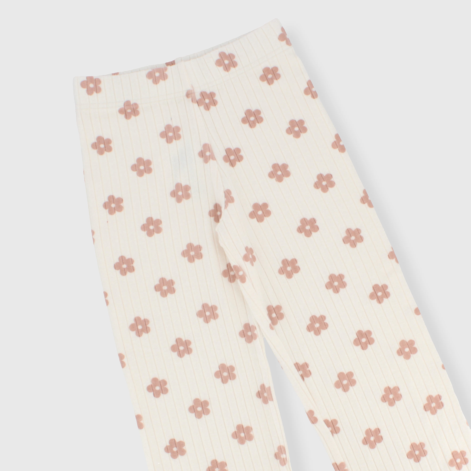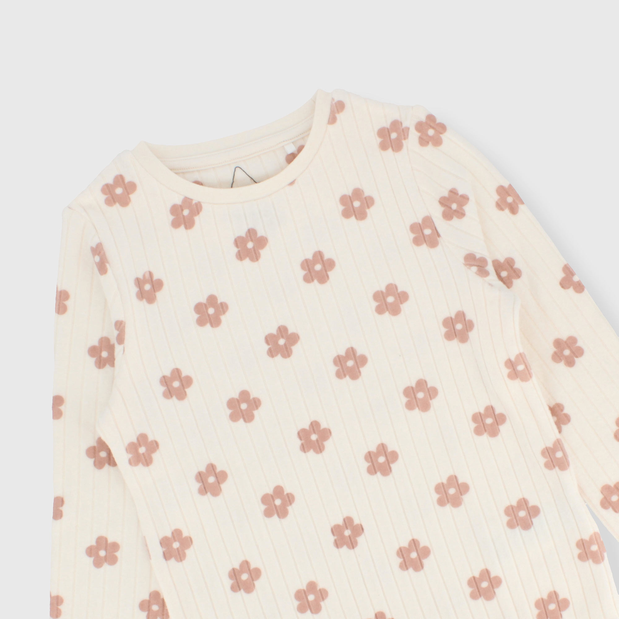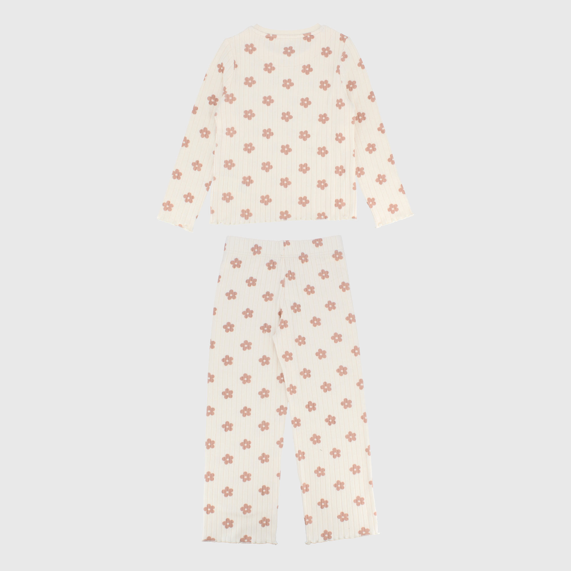 Теплый пижамный комплект в рубчик с цветочным принтом по всей поверхности. Свитер с круглым вырезом и длинными рукавами. Брюки с эластичной талией.