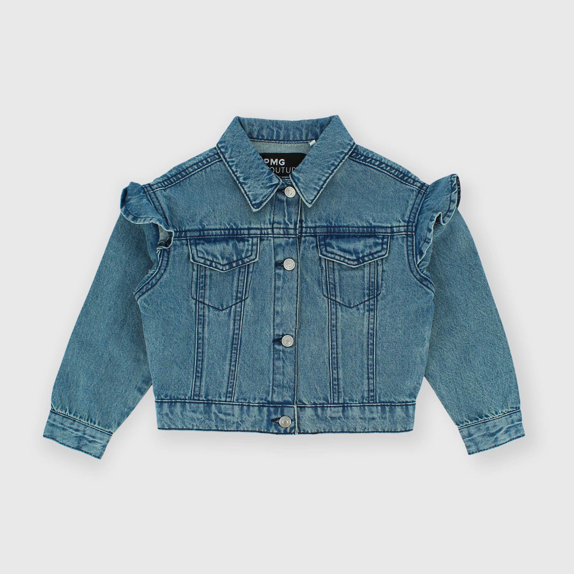Яркая джинсовая куртка с воротником и длинными рукавами. Застежка спереди на пуговицы. Накладные карманы с клапаном спереди. Оборки на плечах. Эластичный низ сзади.
