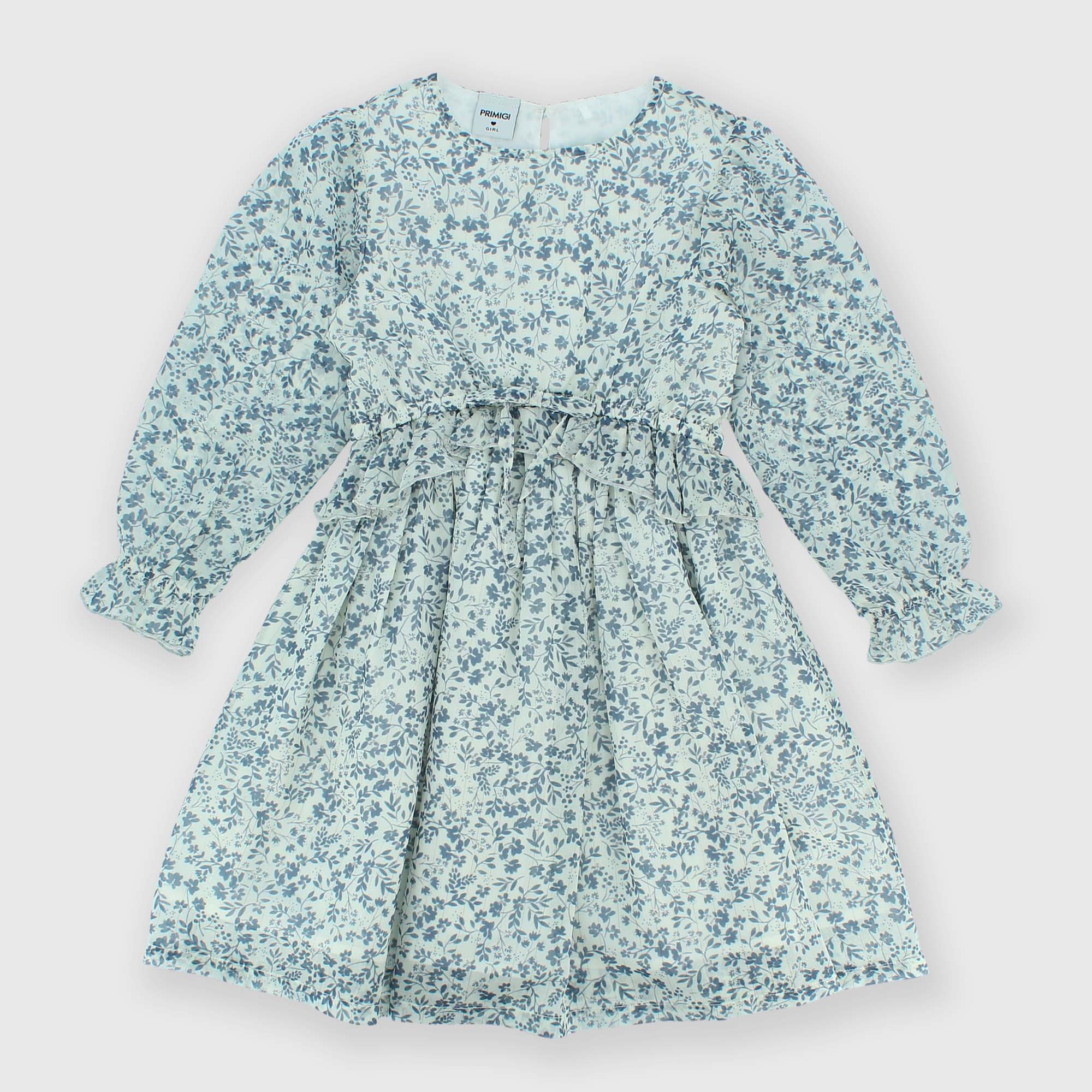 Шифоновое платье с цветочным принтом, круглым вырезом и длинными рукавами. Застежка-капелька на двух пуговицах сзади. Эластичная талия с накладным бантом и рюшами. Заканчивается кукольной строчкой. Внутренняя подкладка.