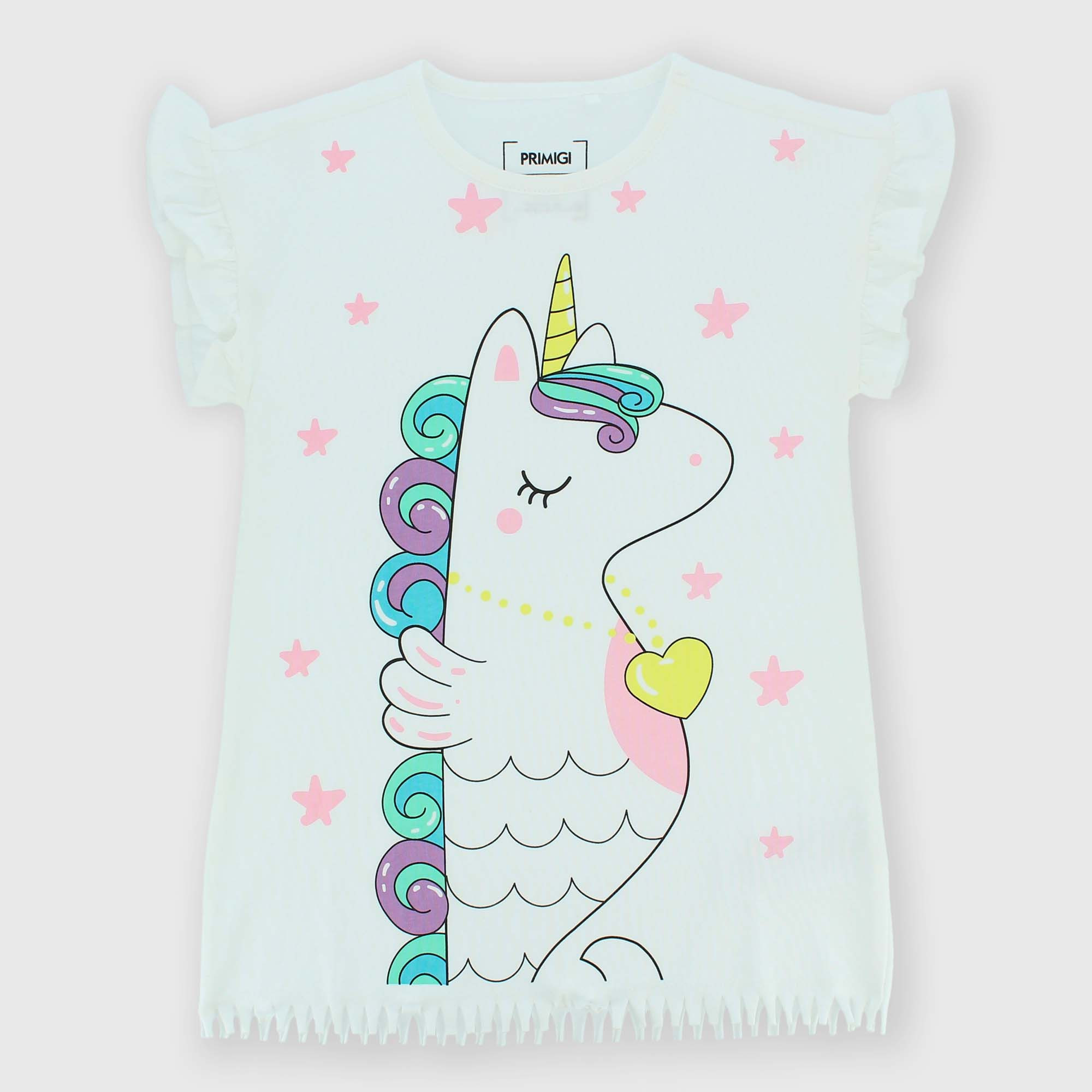 Накидка из джерси, круглый вырез, короткие рукава с рюшами. Принт единорога спереди. Низ с небольшой бахромой.
