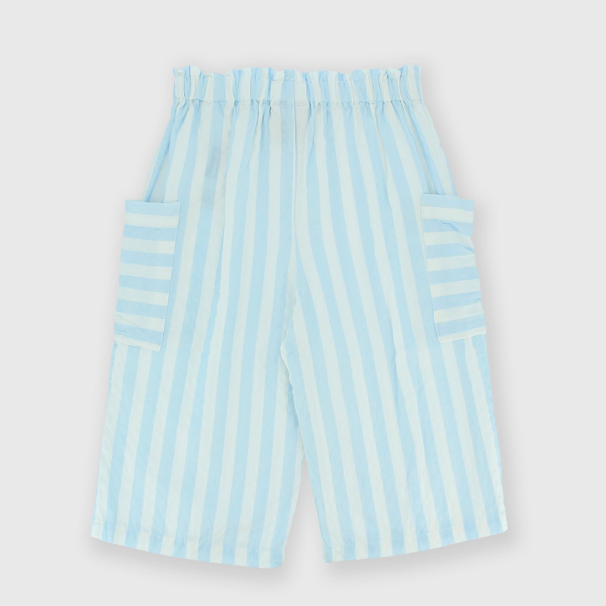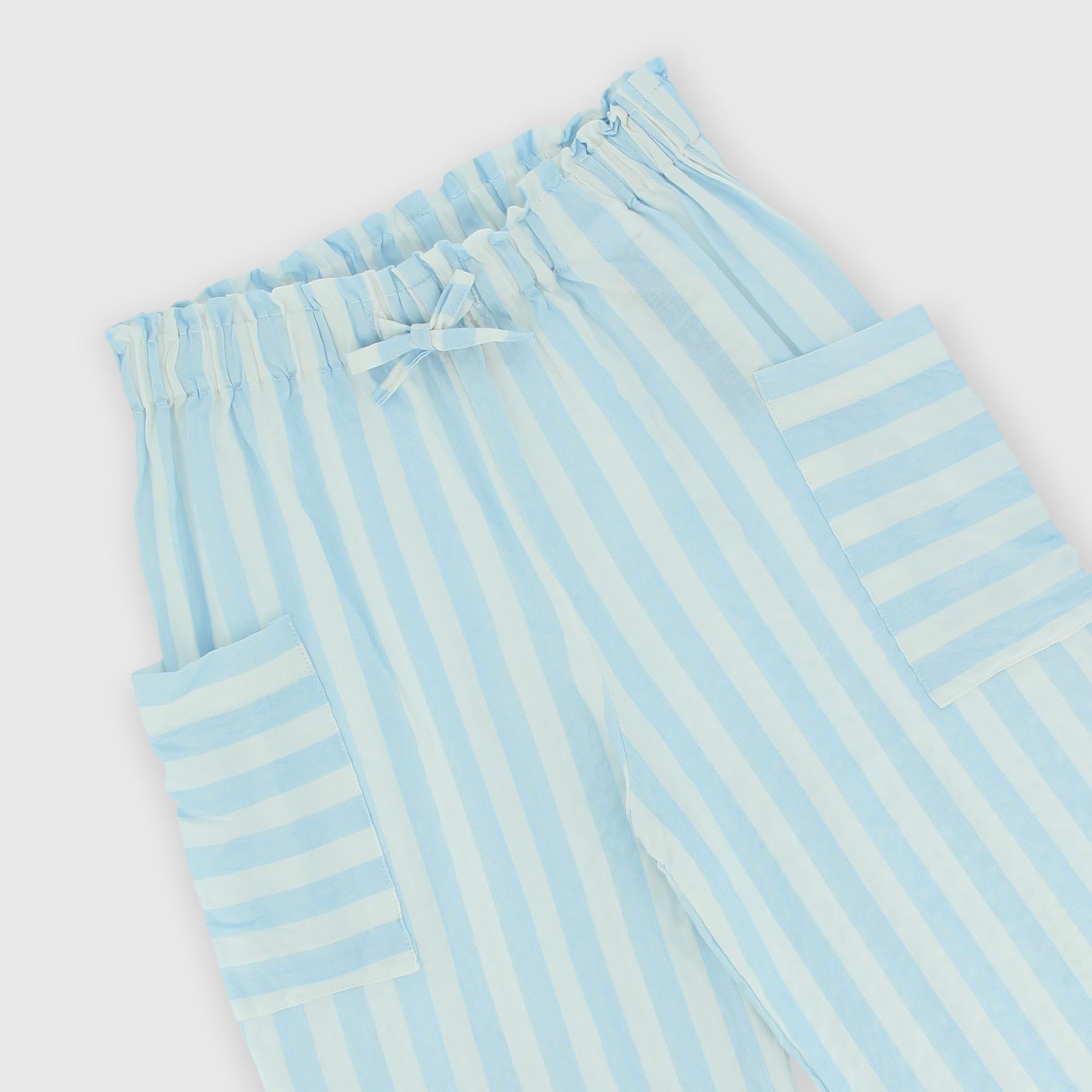 Широкие брюки в полоску, окрашенные в пряжу, с эластичной талией и бантом. Накладные карманы по бокам.