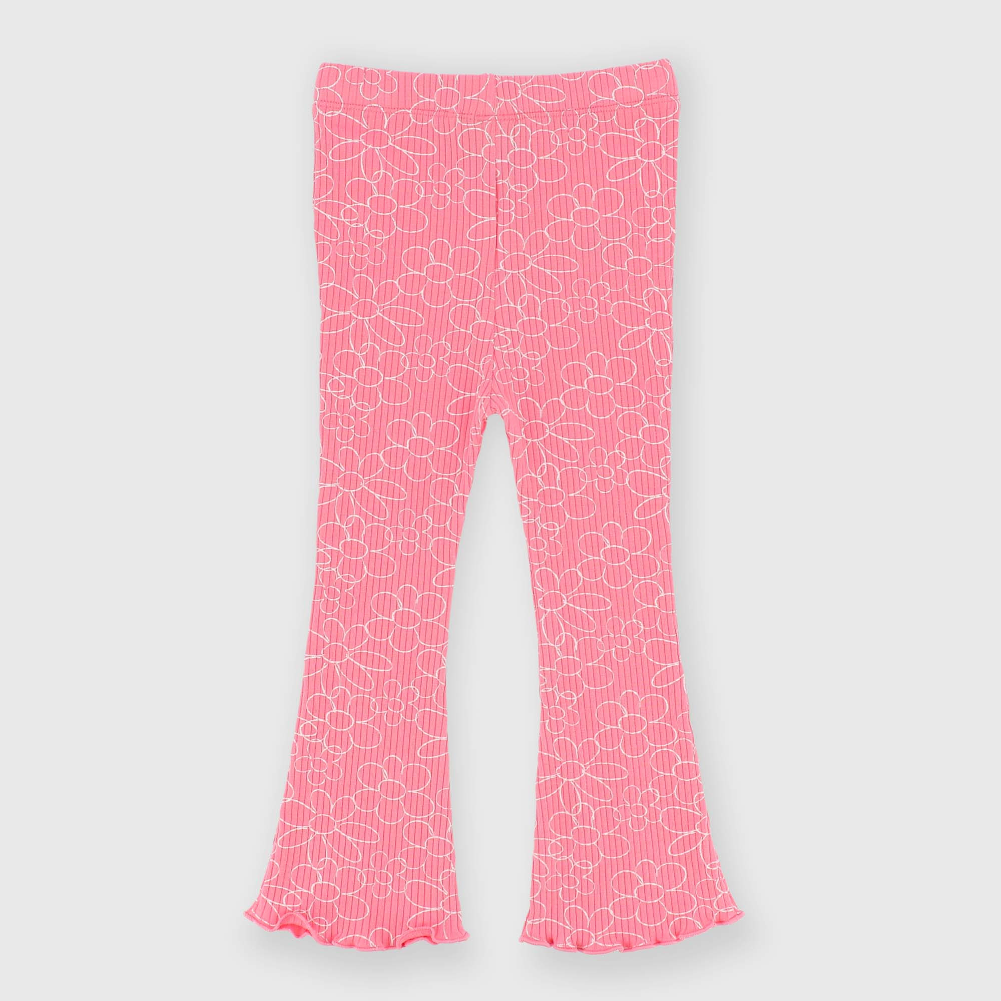 Леггинсы в форме колокольчика в рубчик с эластичной талией. Принт с цветами по всей поверхности. Заканчивается кукольной строчкой.