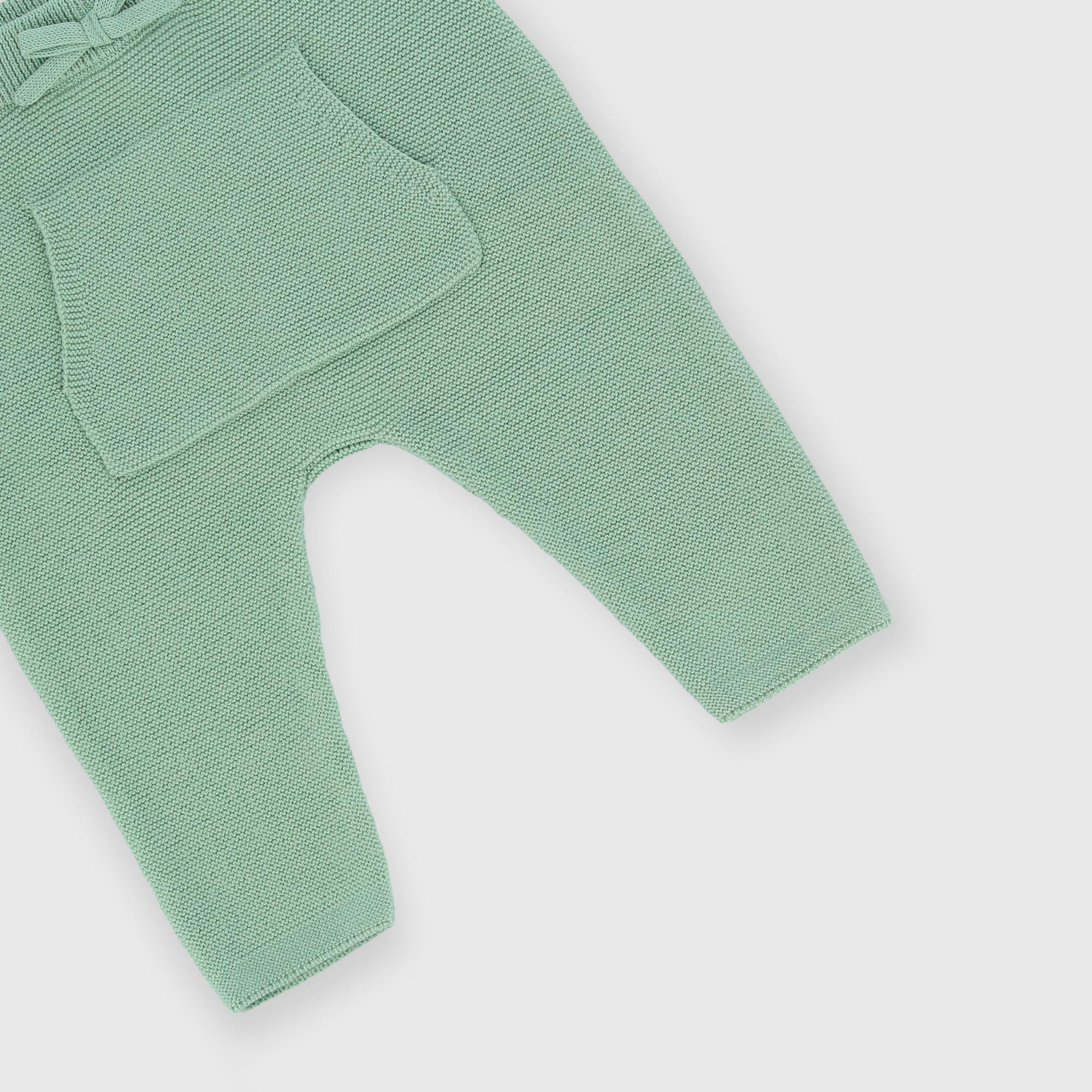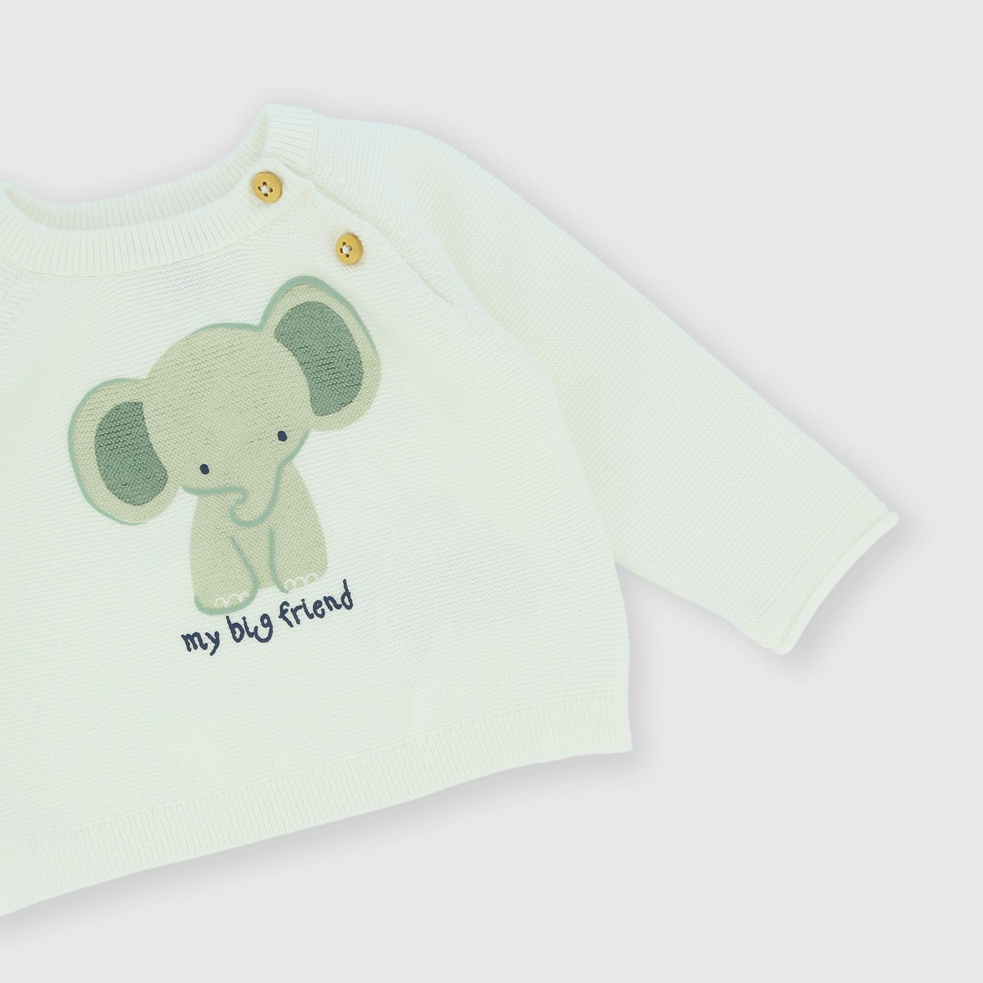 Комплект из двух частей из мягкого хлопкового трикотажа. Пуловер с длинными рукавами и изображением слоника спереди. Застегивается на плечо. Брюки с эластичной талией и карманом-кенгуру.