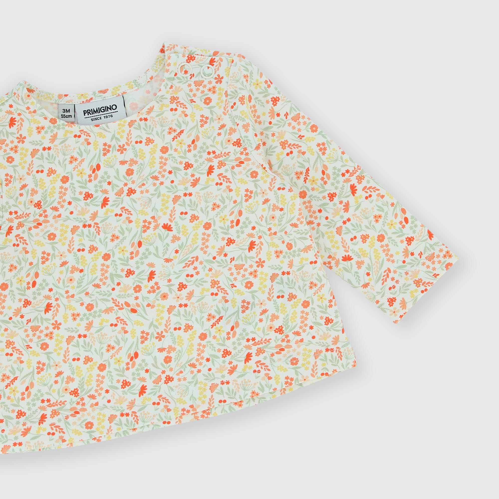 Набор из трёх предметов. Футболка из джерси с круглым вырезом и длинными рукавами. Застежка на кнопки на плече. Цветочный принт по всей поверхности. Мягкая хлопковая куртка с застежкой спереди. Ажурный эффект исполнения и волан по низу. Леггинсы с эластичной талией.