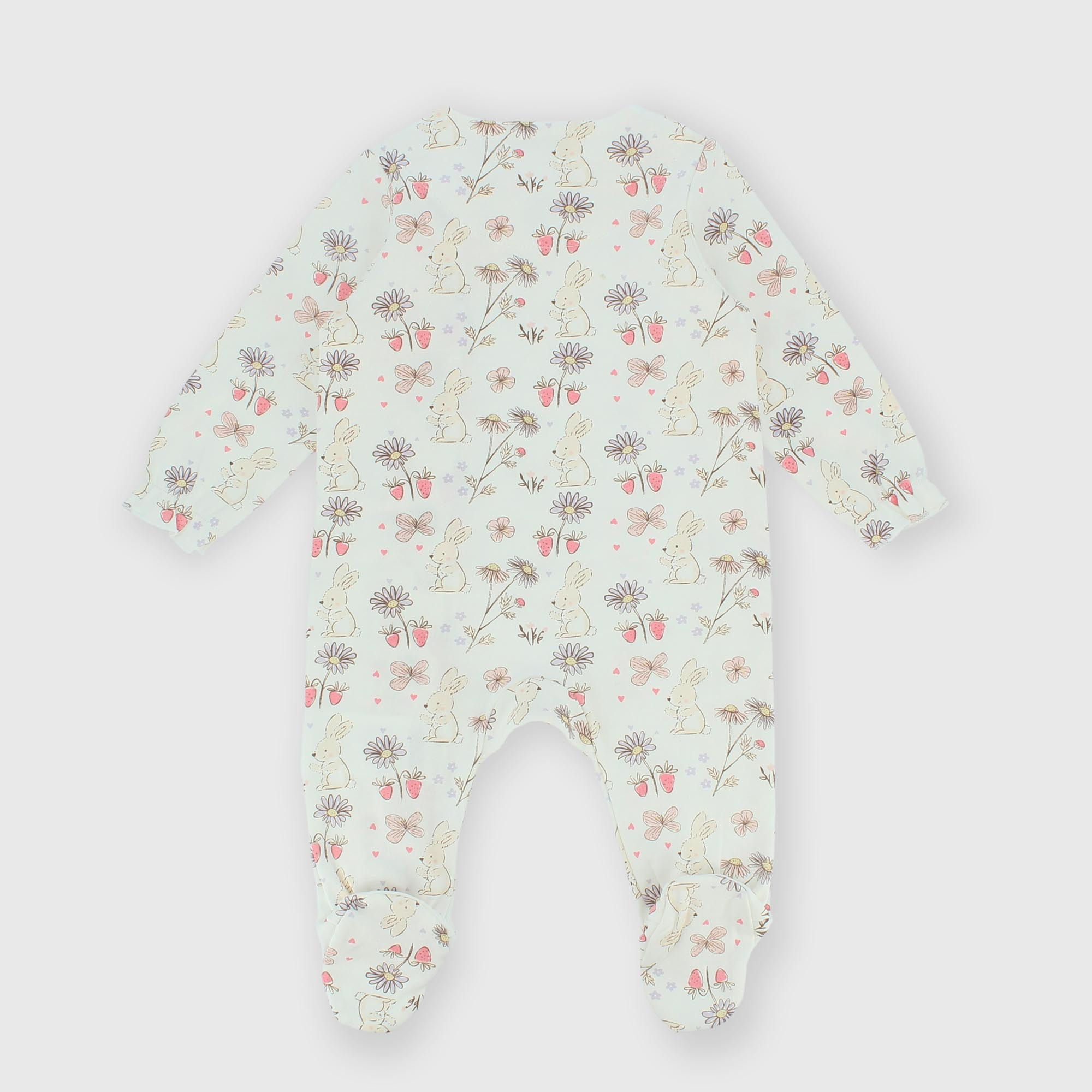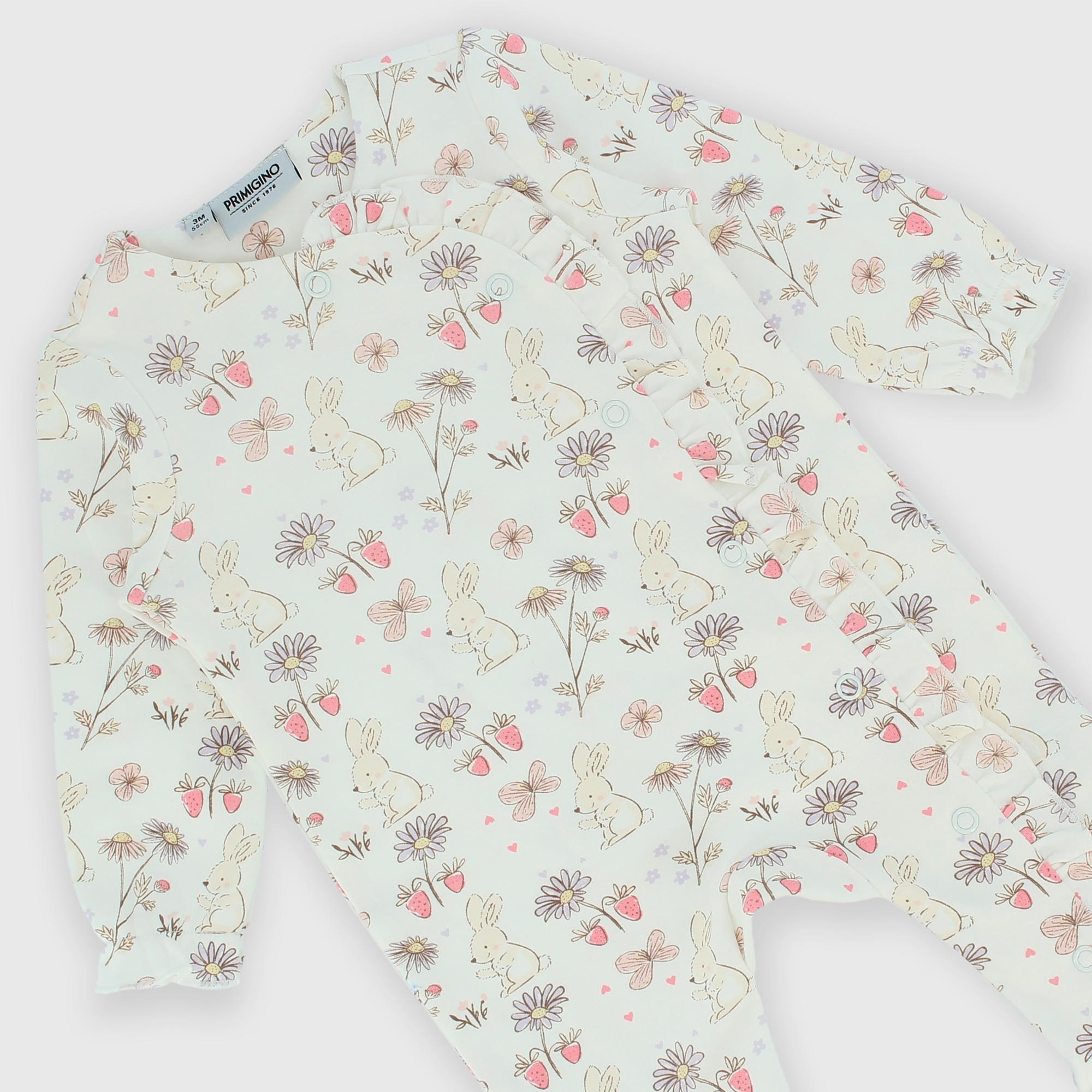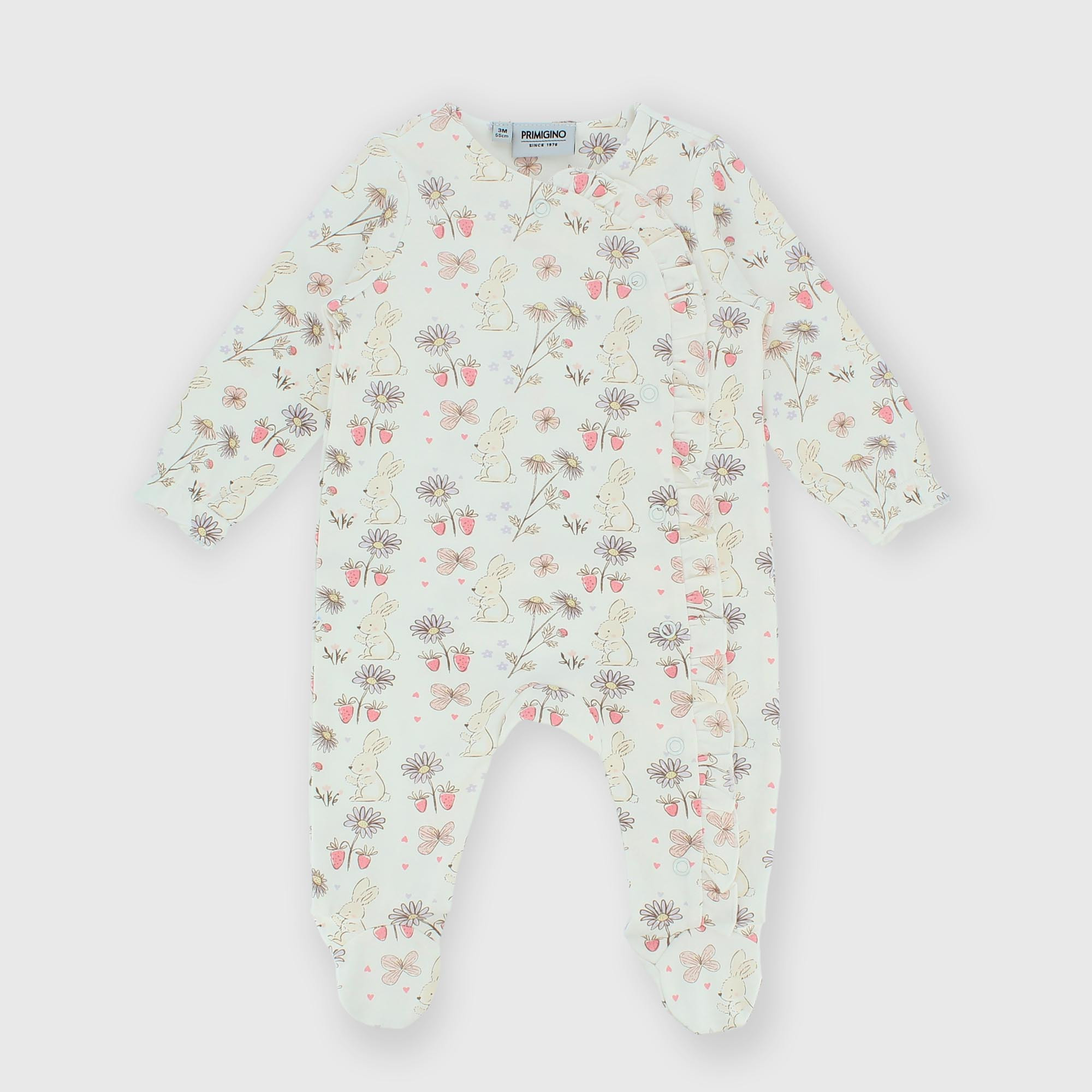 Комбинезон интерлок с круглым вырезом и длинными рукавами. Застежка кимоно на автоматические кнопки. Сплошной принт. Оборки спереди.