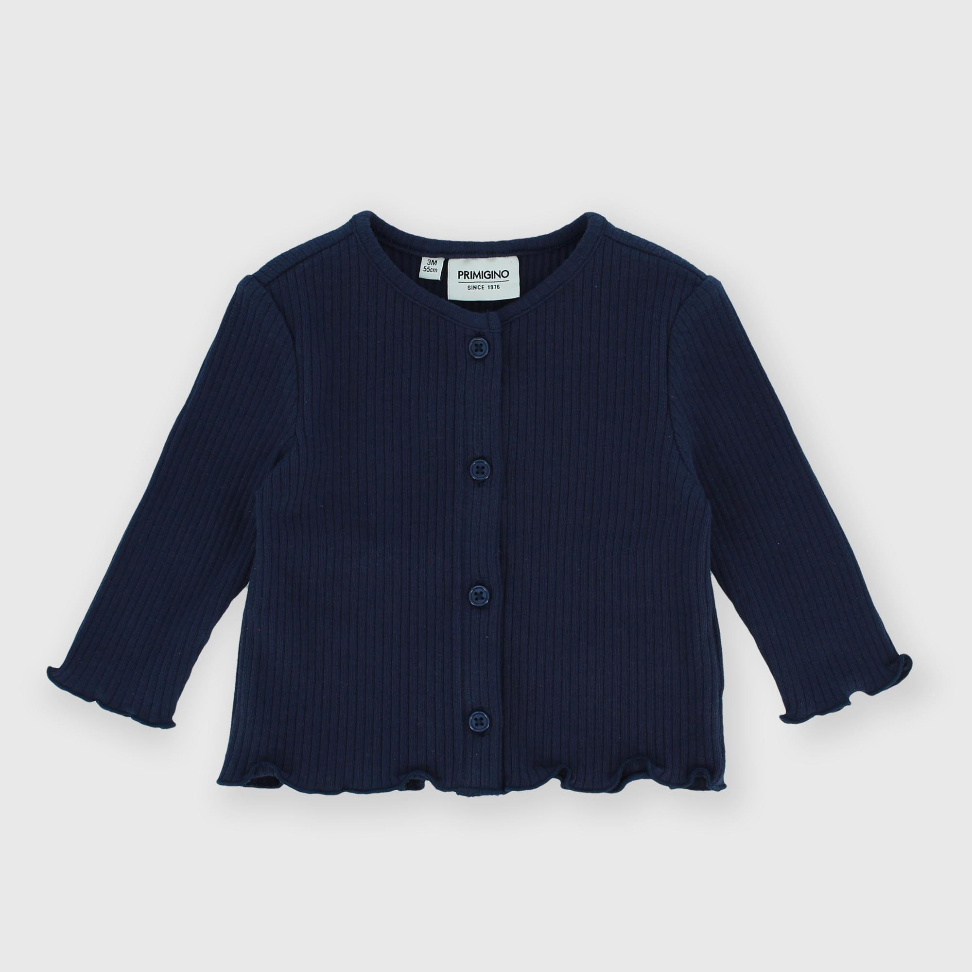 Кардиган в рубчик, круглый вырез. Застежка на пуговицы спереди. Заканчивается кукольной строчкой.
