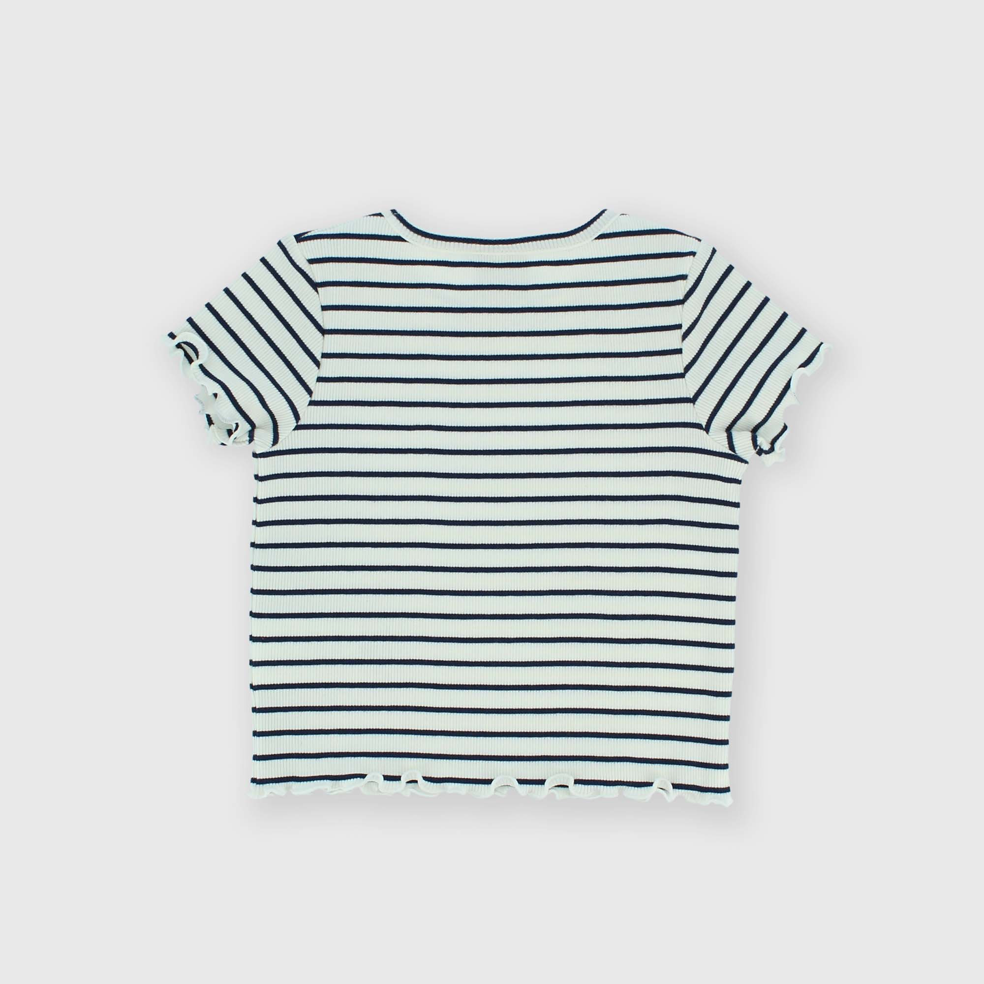 Полосатая футболка в рубчик, окрашенная в пряжу, с круглым вырезом и короткими рукавами. Заканчивается кукольной строчкой.