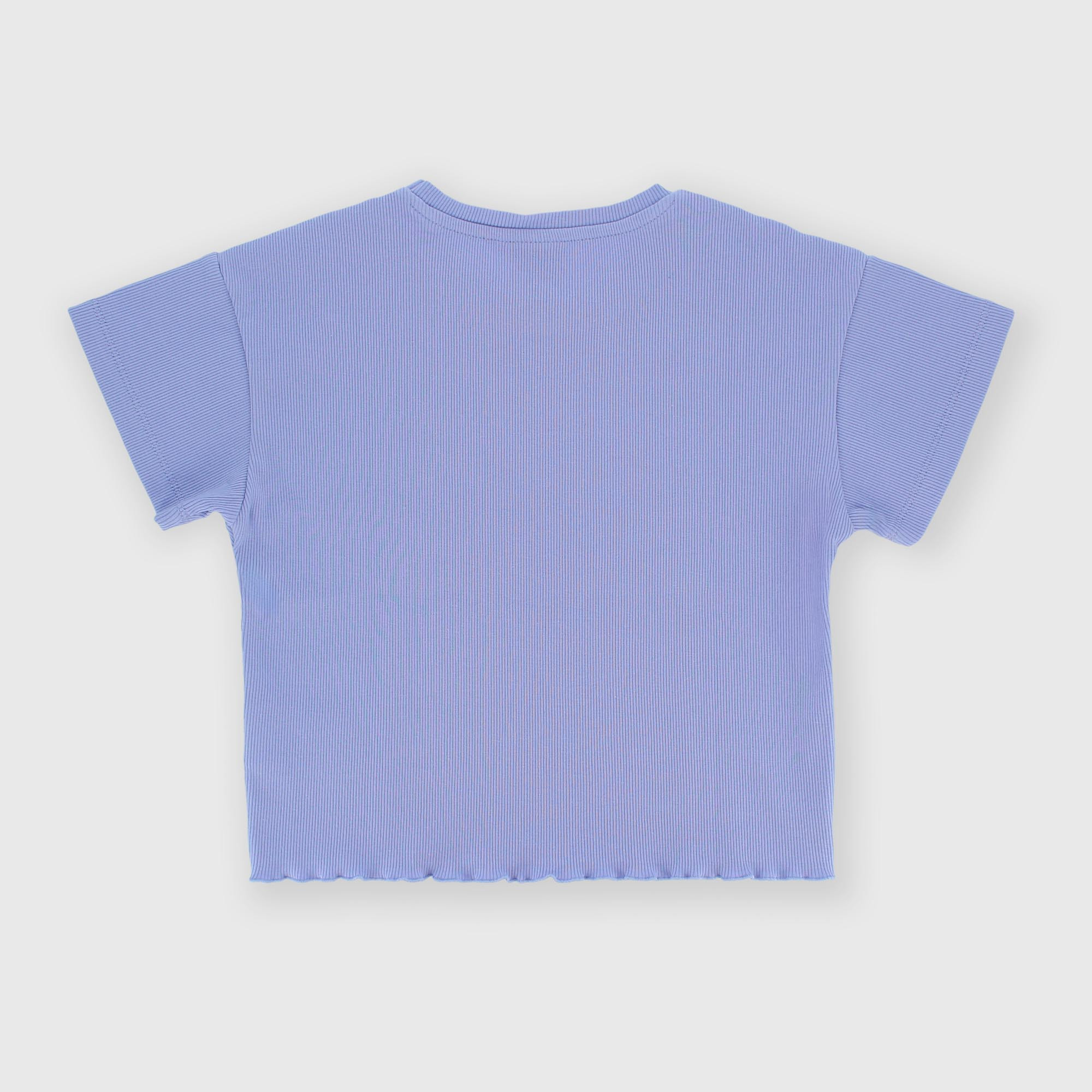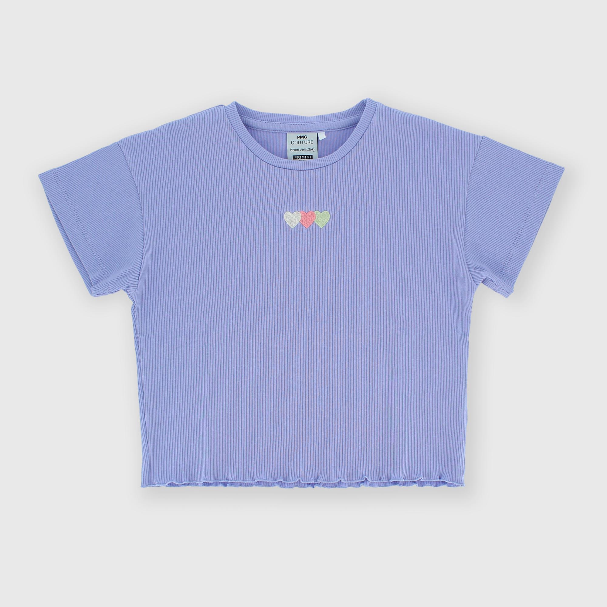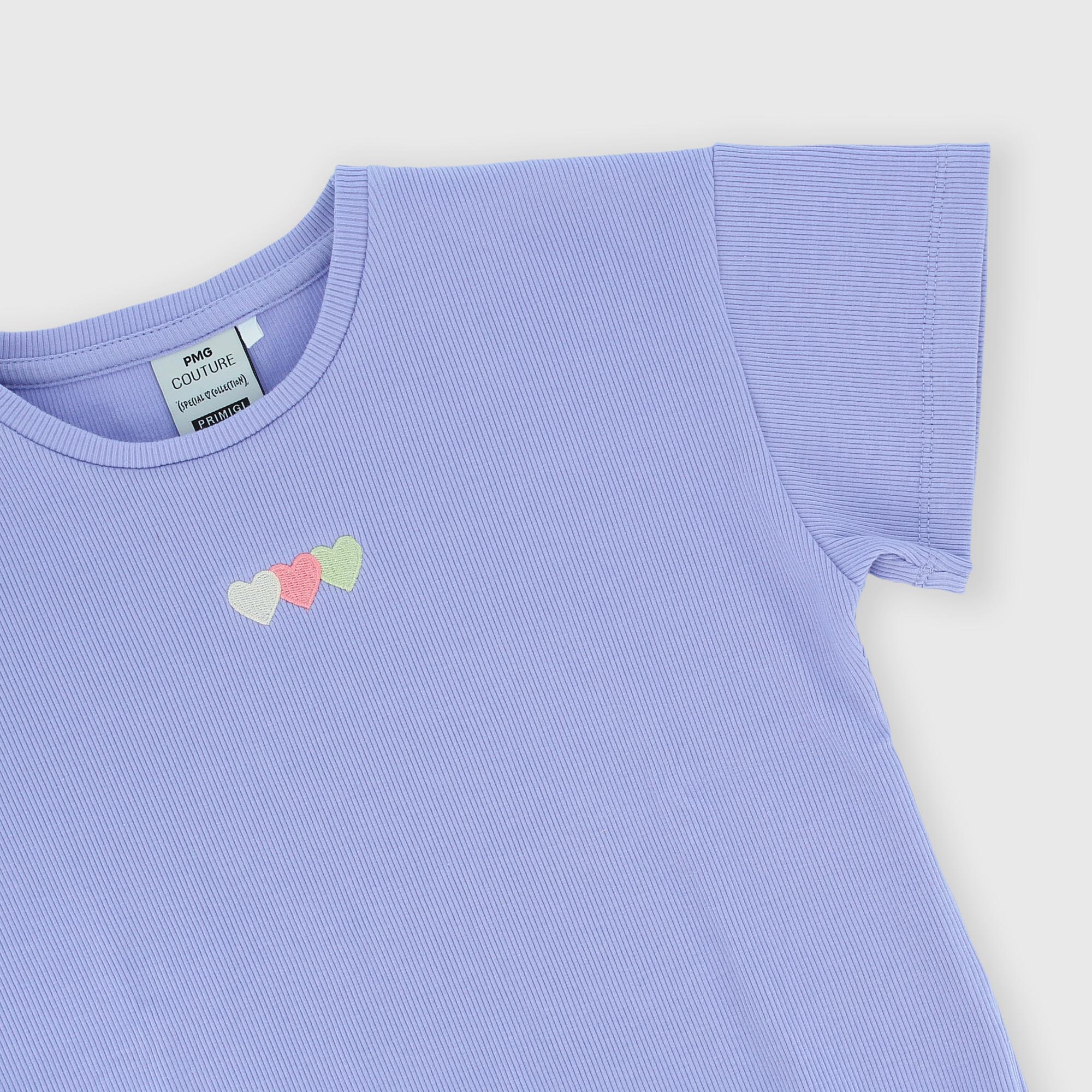 Футболка в рубчик, круглый вырез, короткие рукава. Спереди вышиты сердечки. Заканчивается кукольной строчкой.