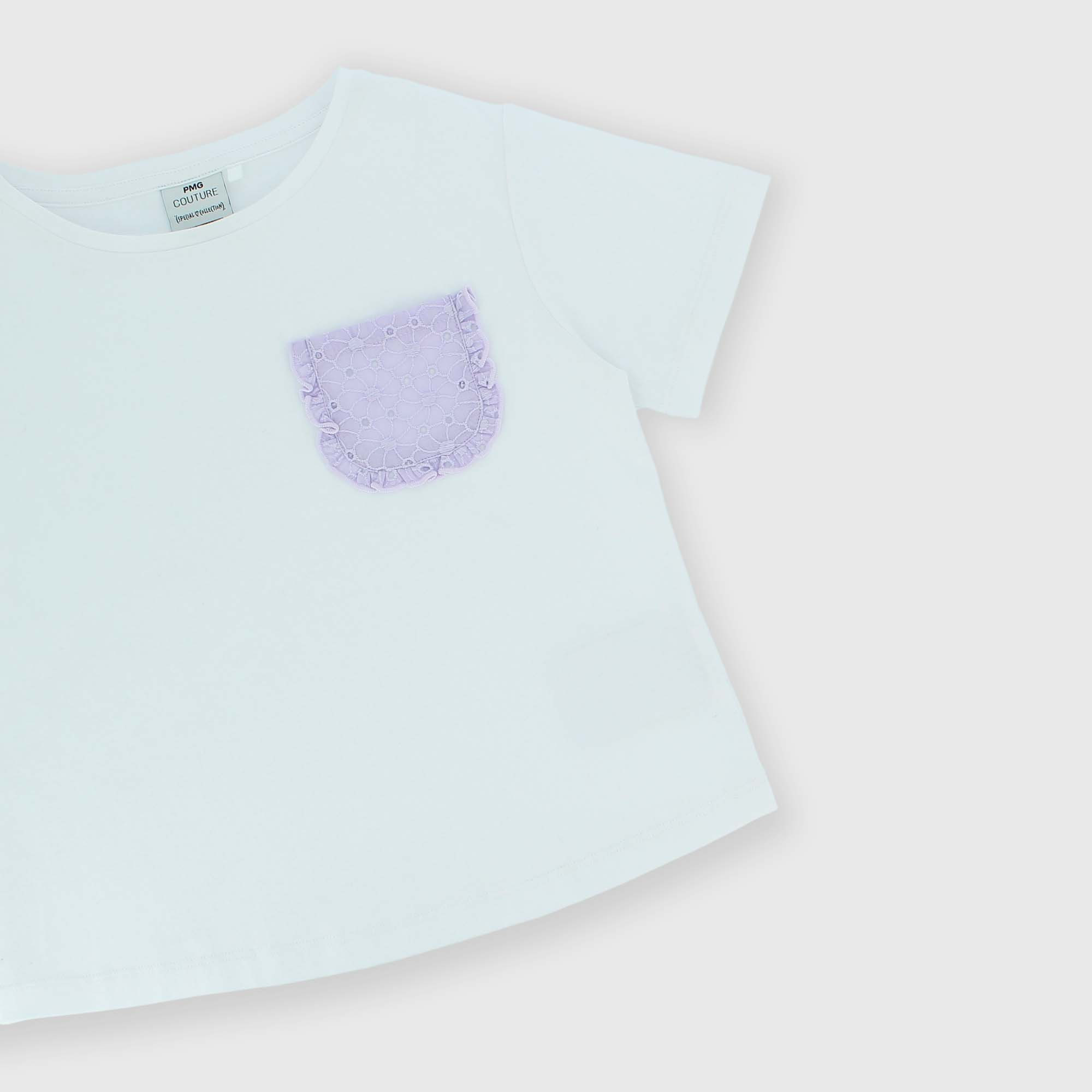 Футболка из джерси, круглый вырез, короткие рукава. Контрастный нагрудный карман с рюшами вокруг.