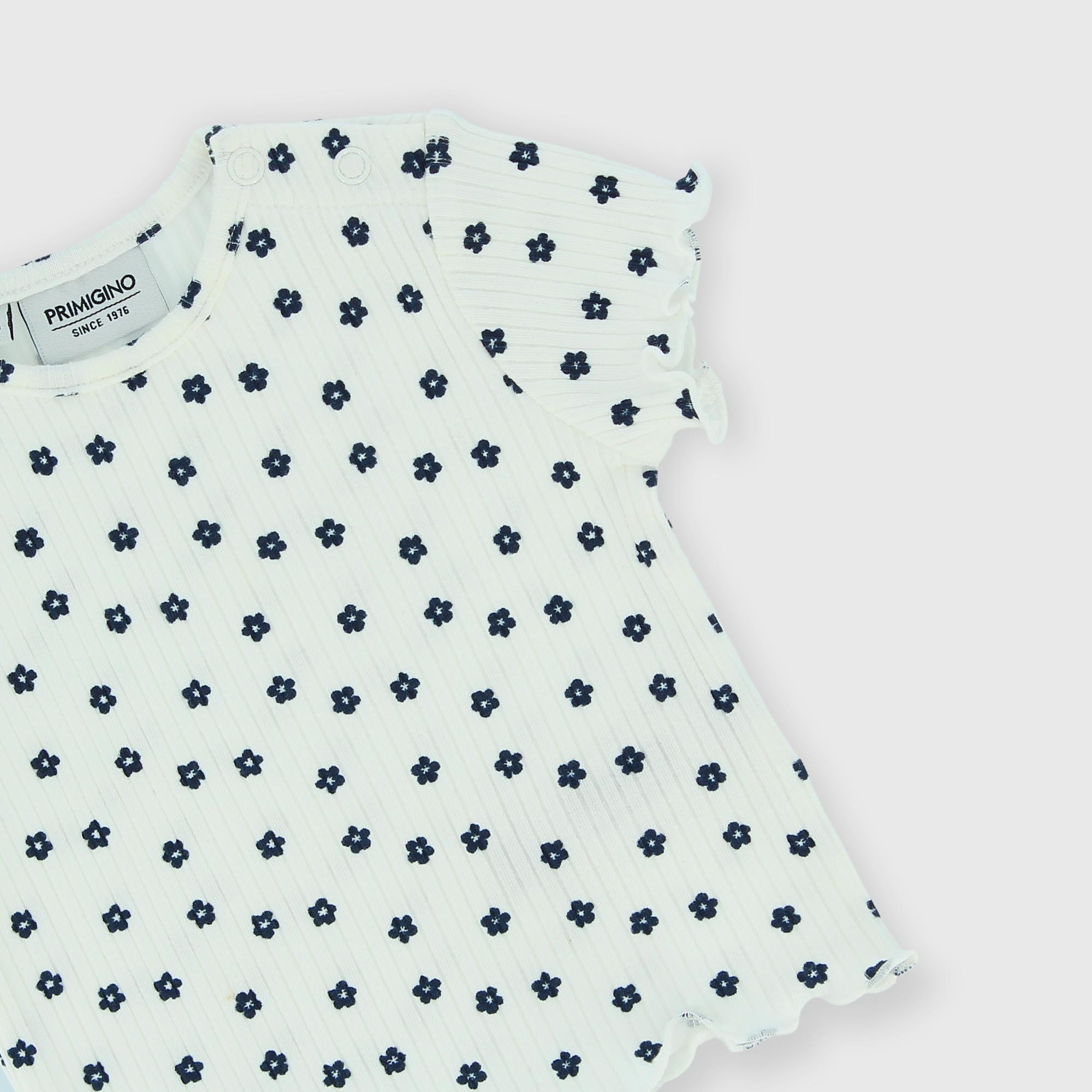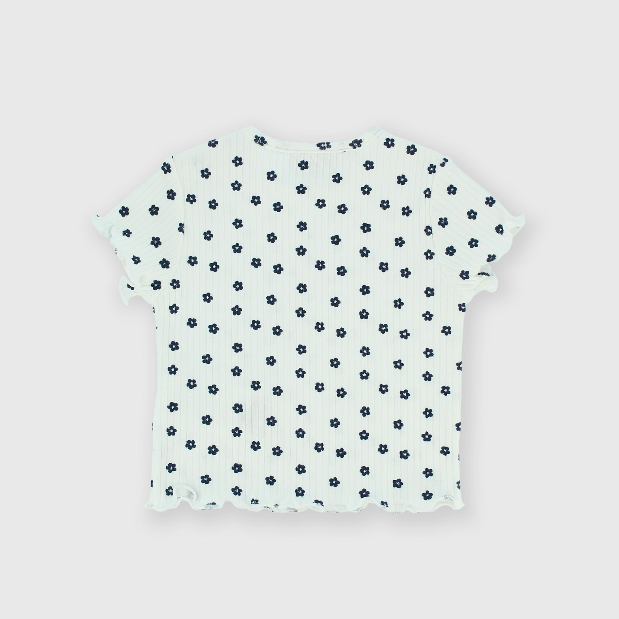 Футболка в рубчик, с круглым вырезом, с короткими рукавами. Застежка на кнопки на плече. Цветочный принт по всей поверхности. Заканчивается кукольной строчкой.