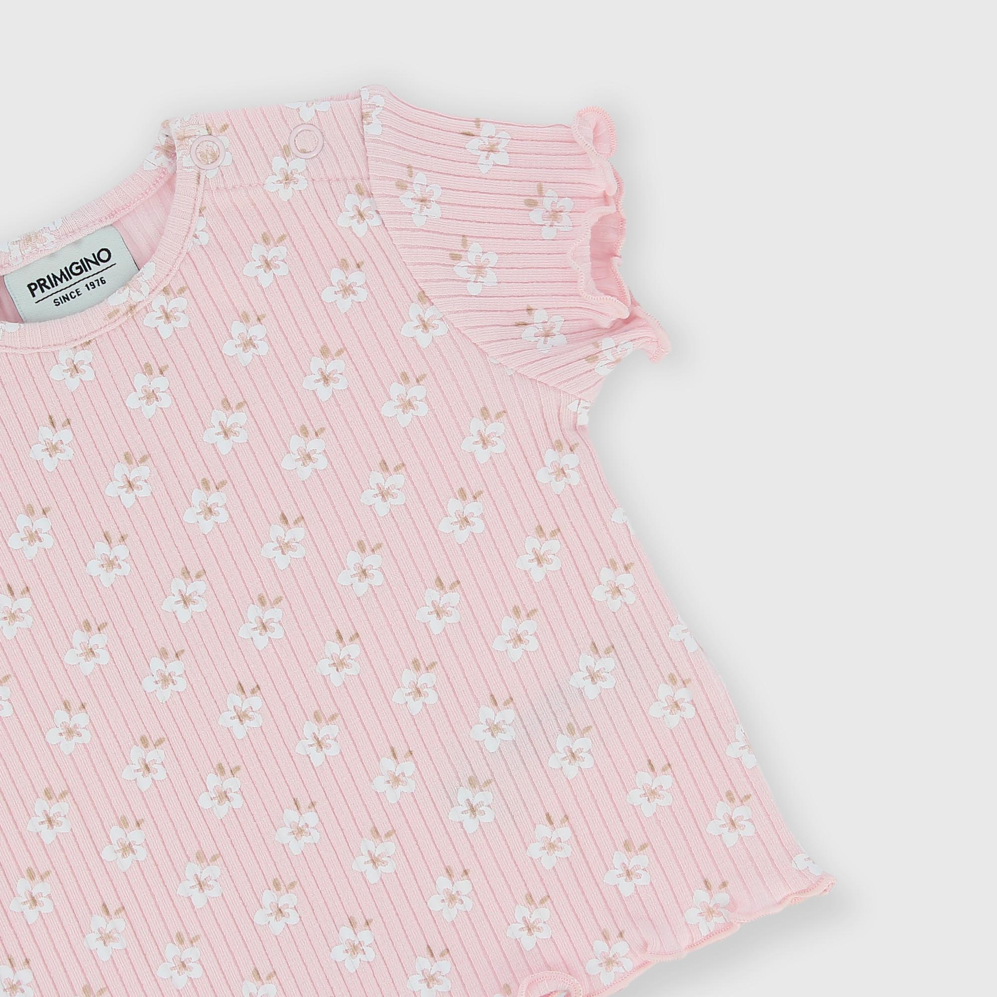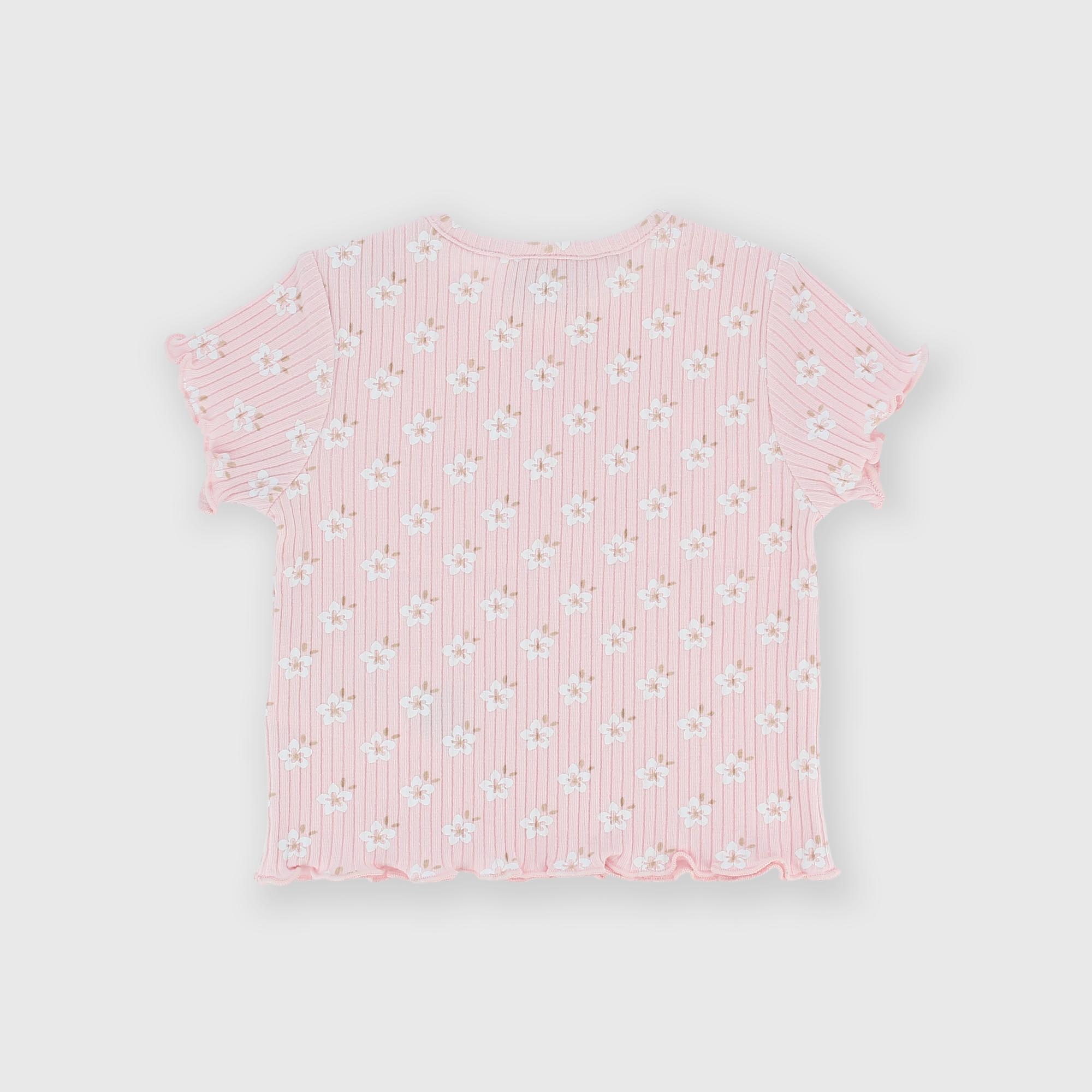 Футболка в рубчик, с круглым вырезом, с короткими рукавами. Застежка на кнопки на плече. Цветочный принт по всей поверхности. Заканчивается кукольной строчкой.