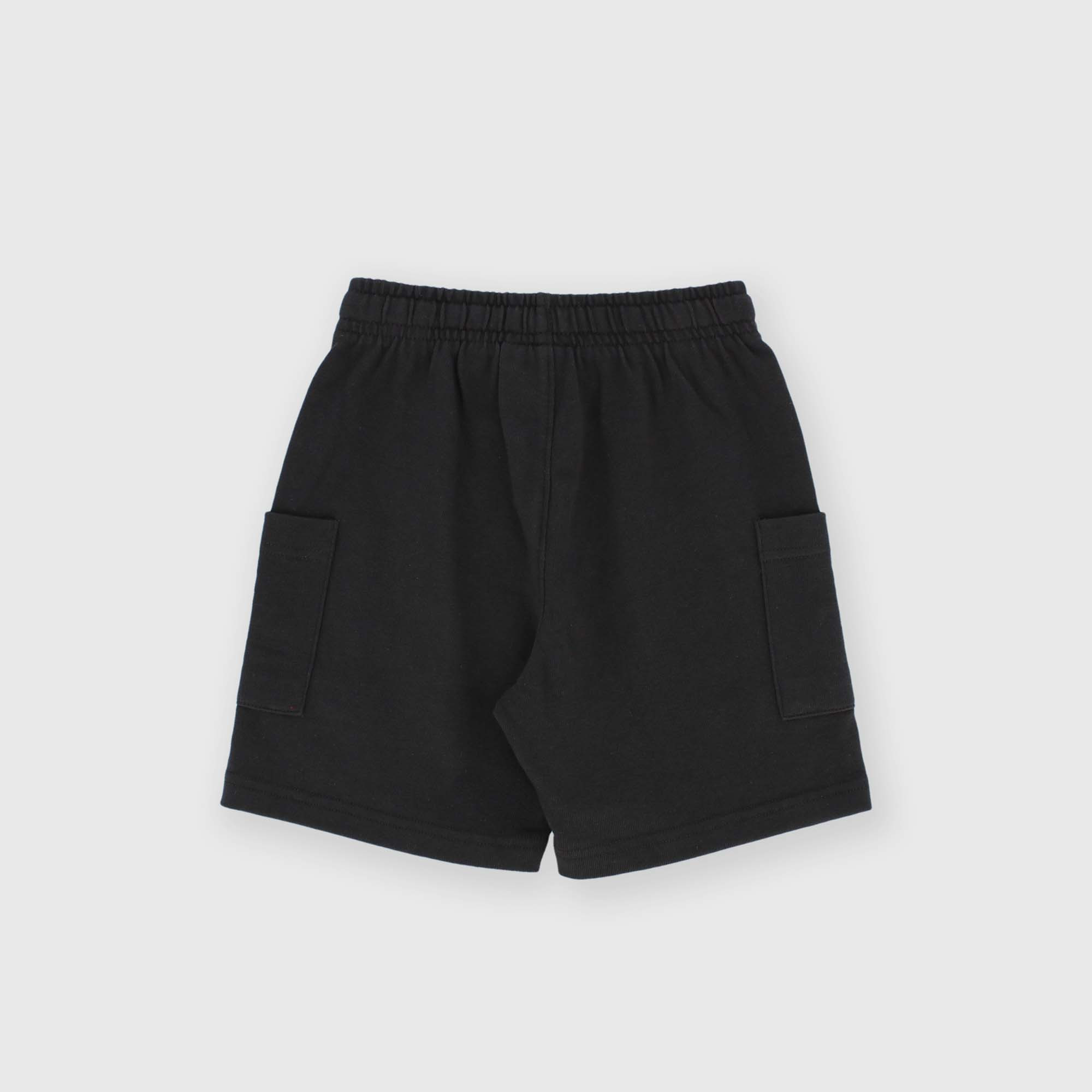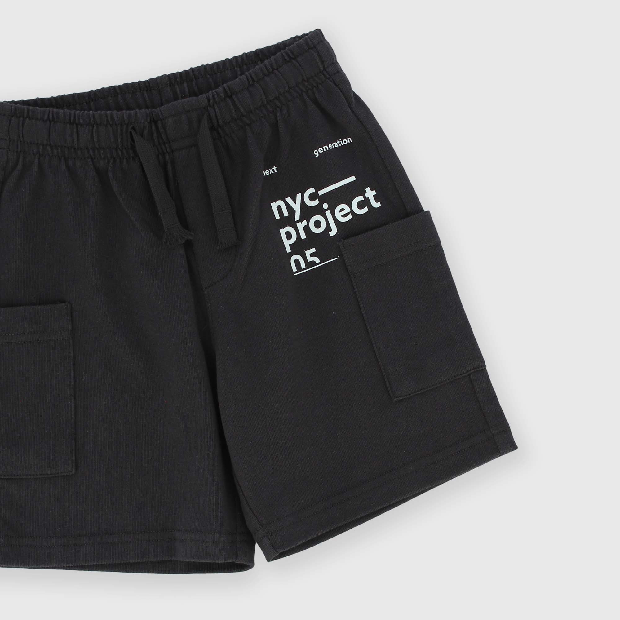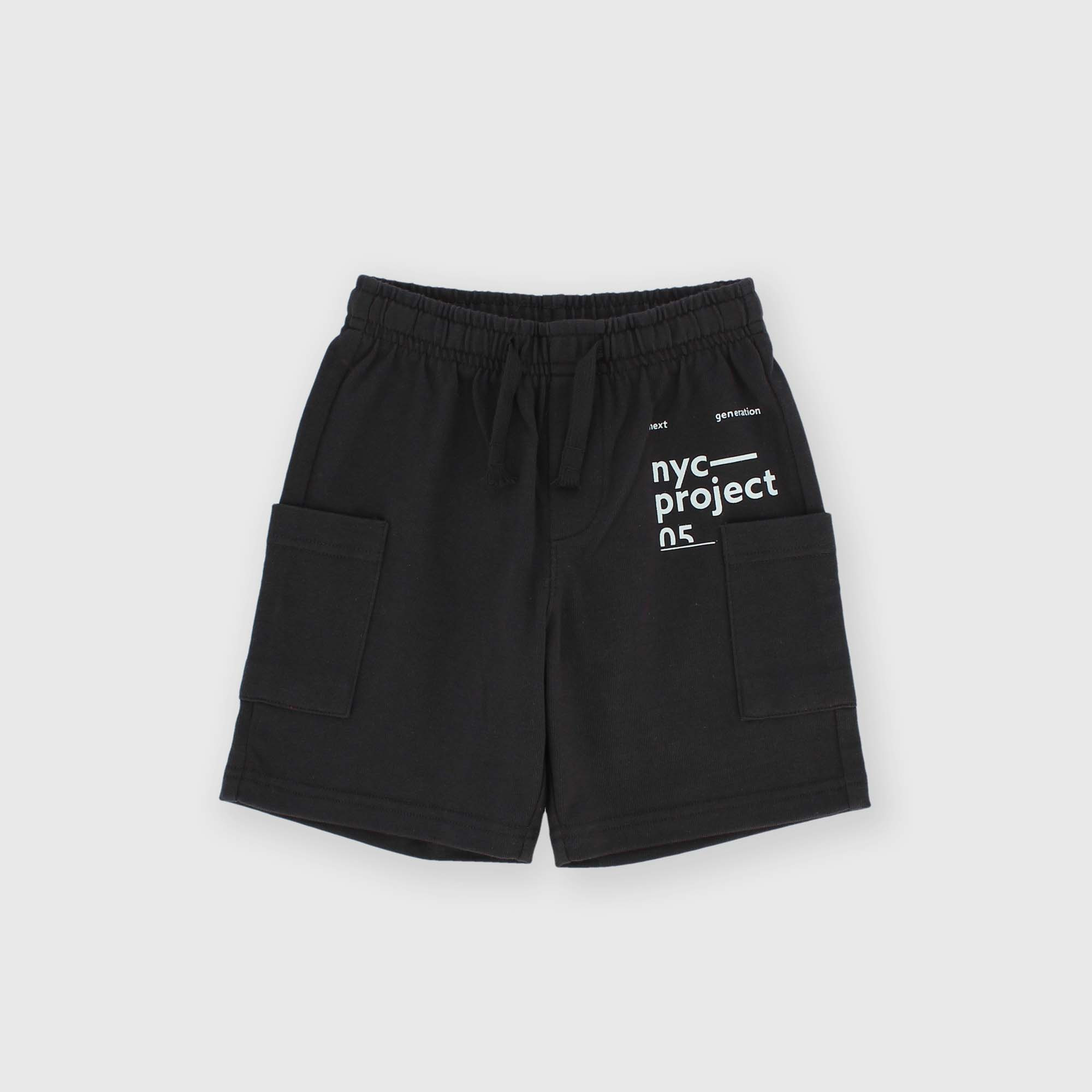 Шорты-бермуды из плотного трикотажа с эластичной талией и шнурками спереди. Боковые накладные карманы и принт с надписью спереди.