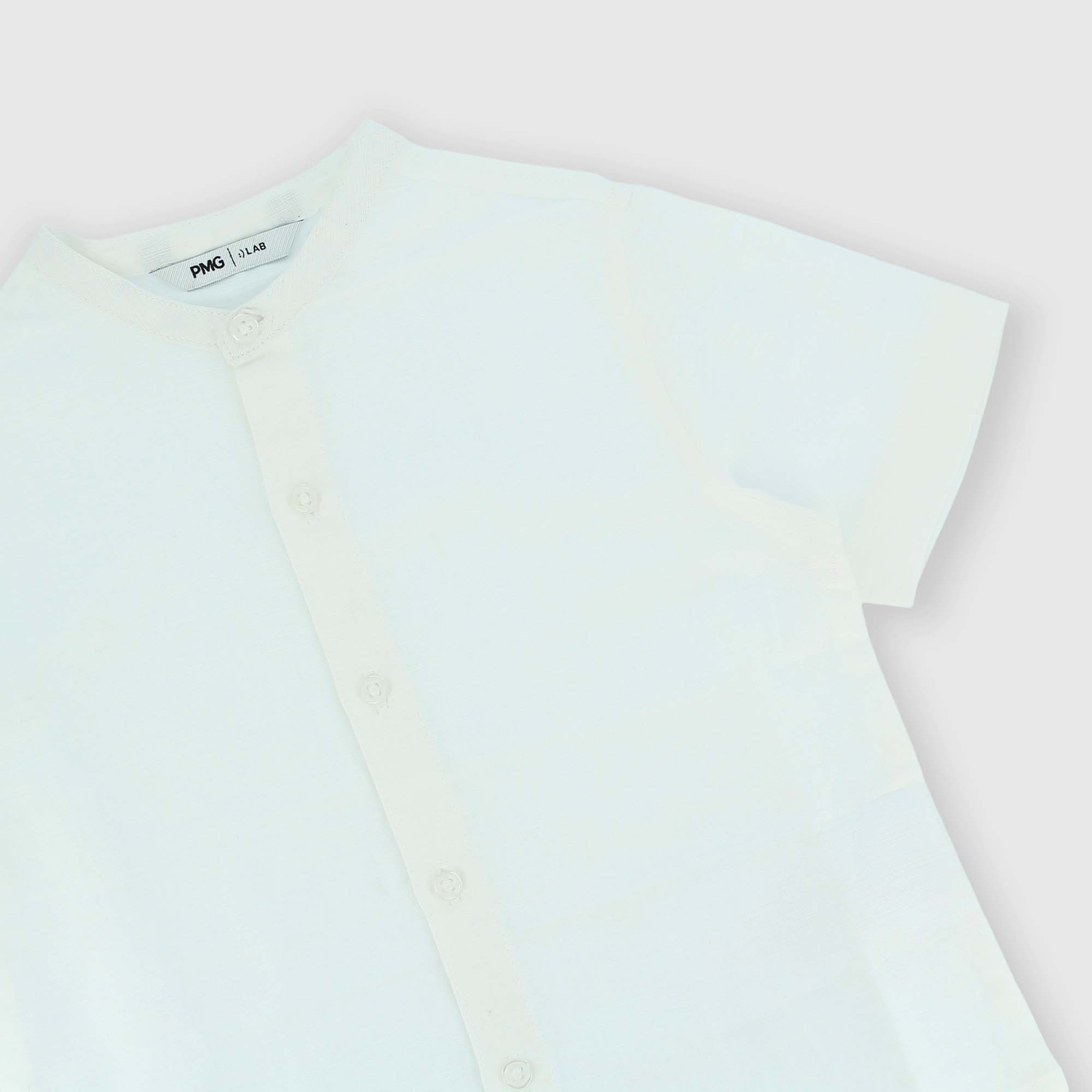Рубашка из хлопка и льна, воротник-стойка, короткие рукава. Застежка на пуговицы спереди.