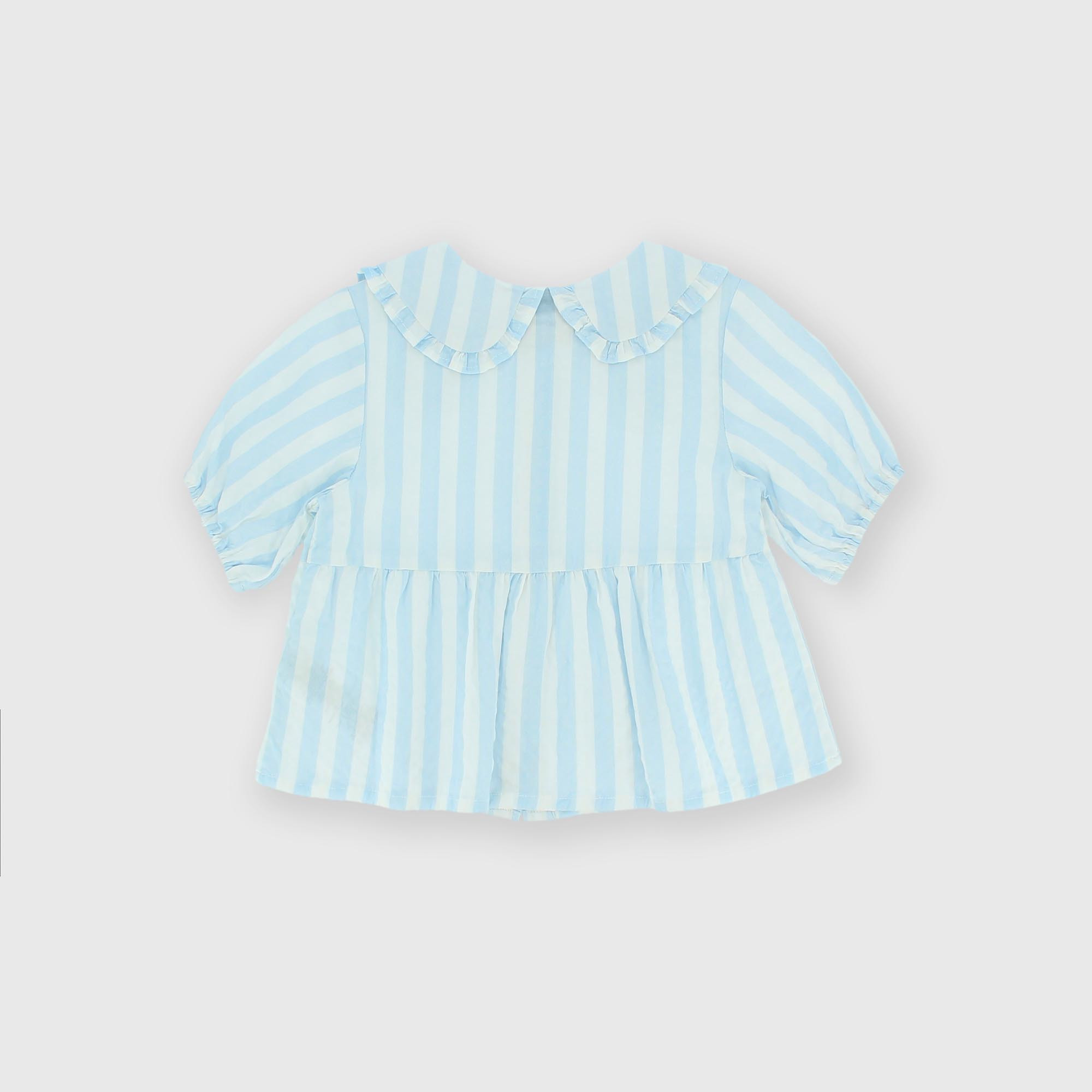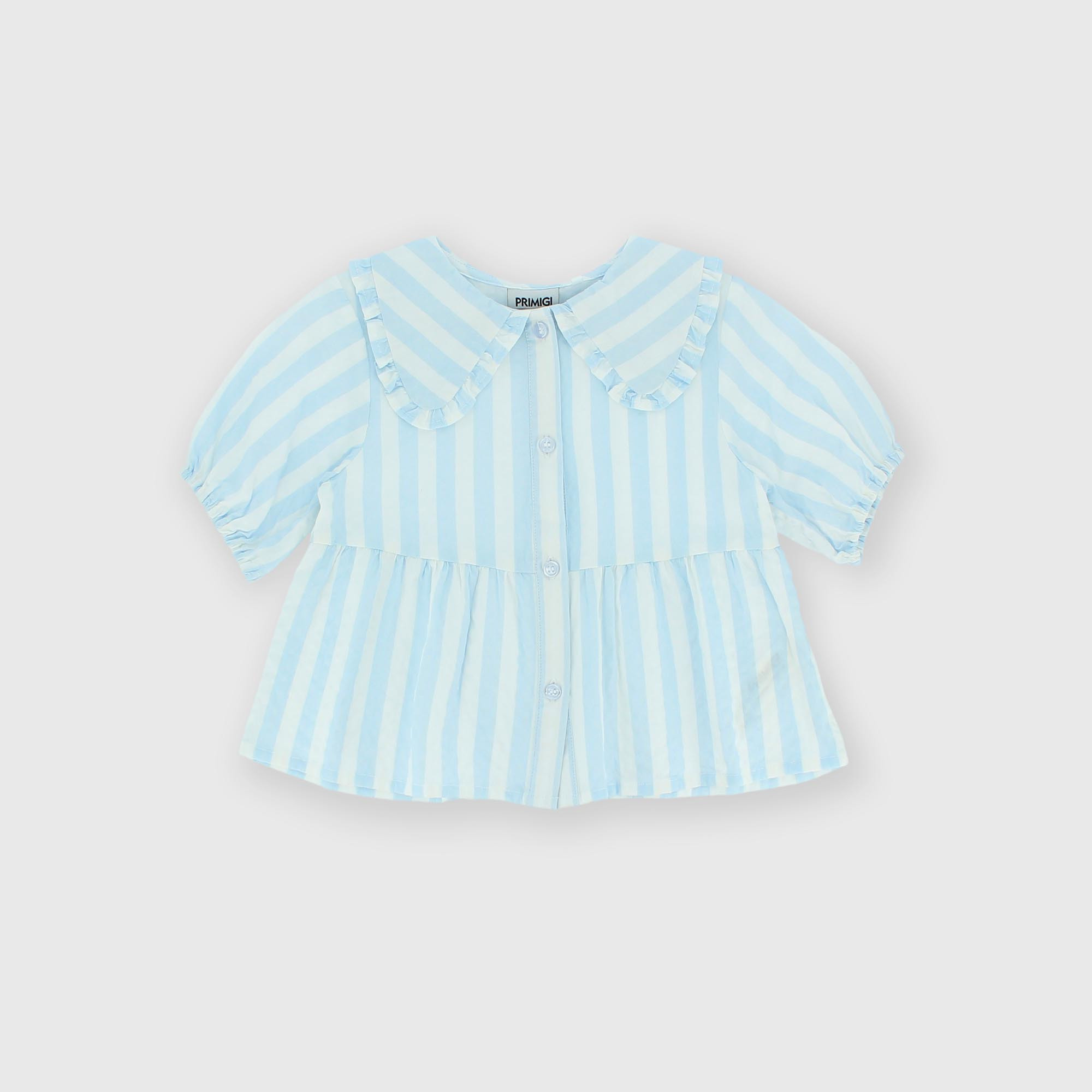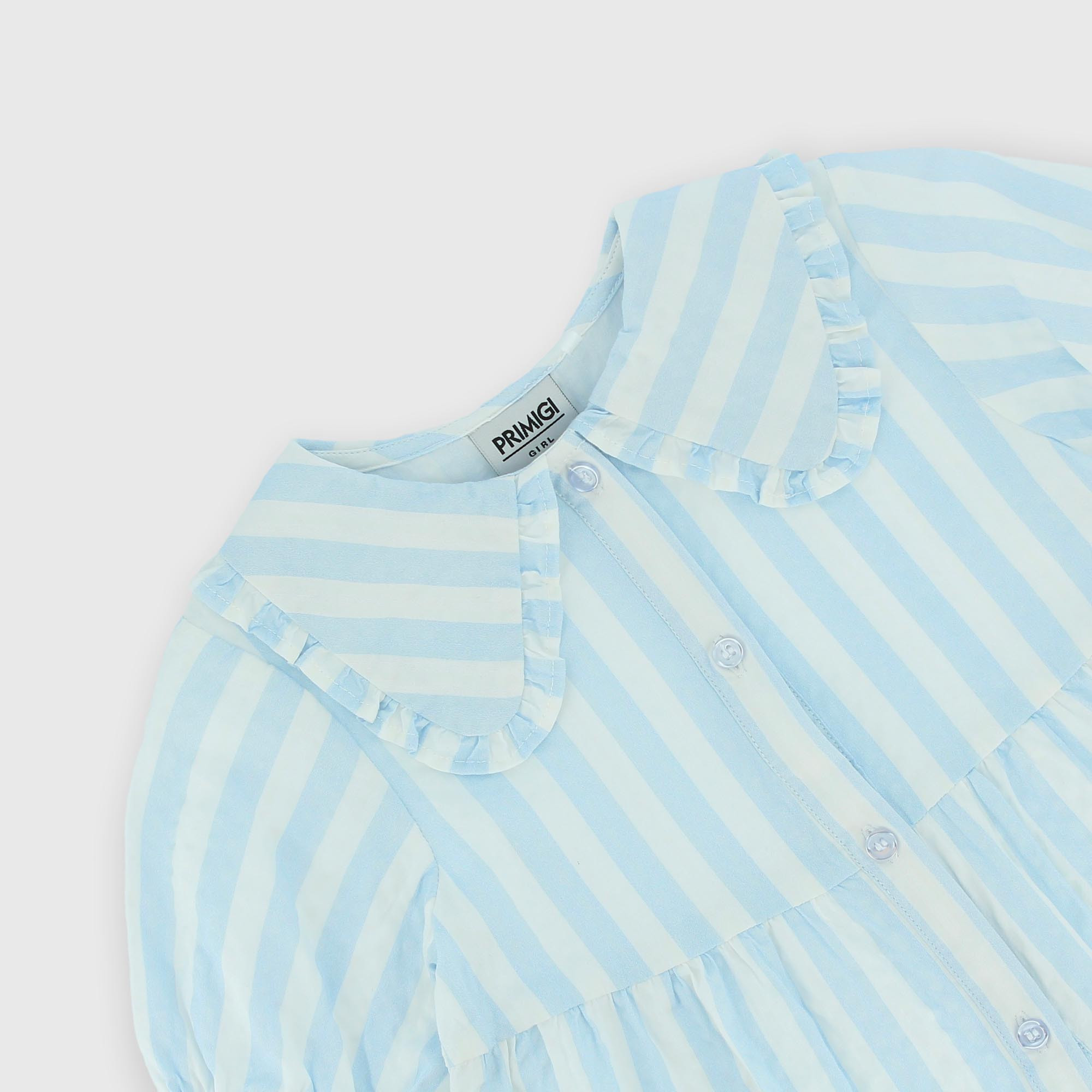 Полосатая рубашка, окрашенная в пряжу, с широким воротником и короткими рукавами-фонариками. Застежка спереди.