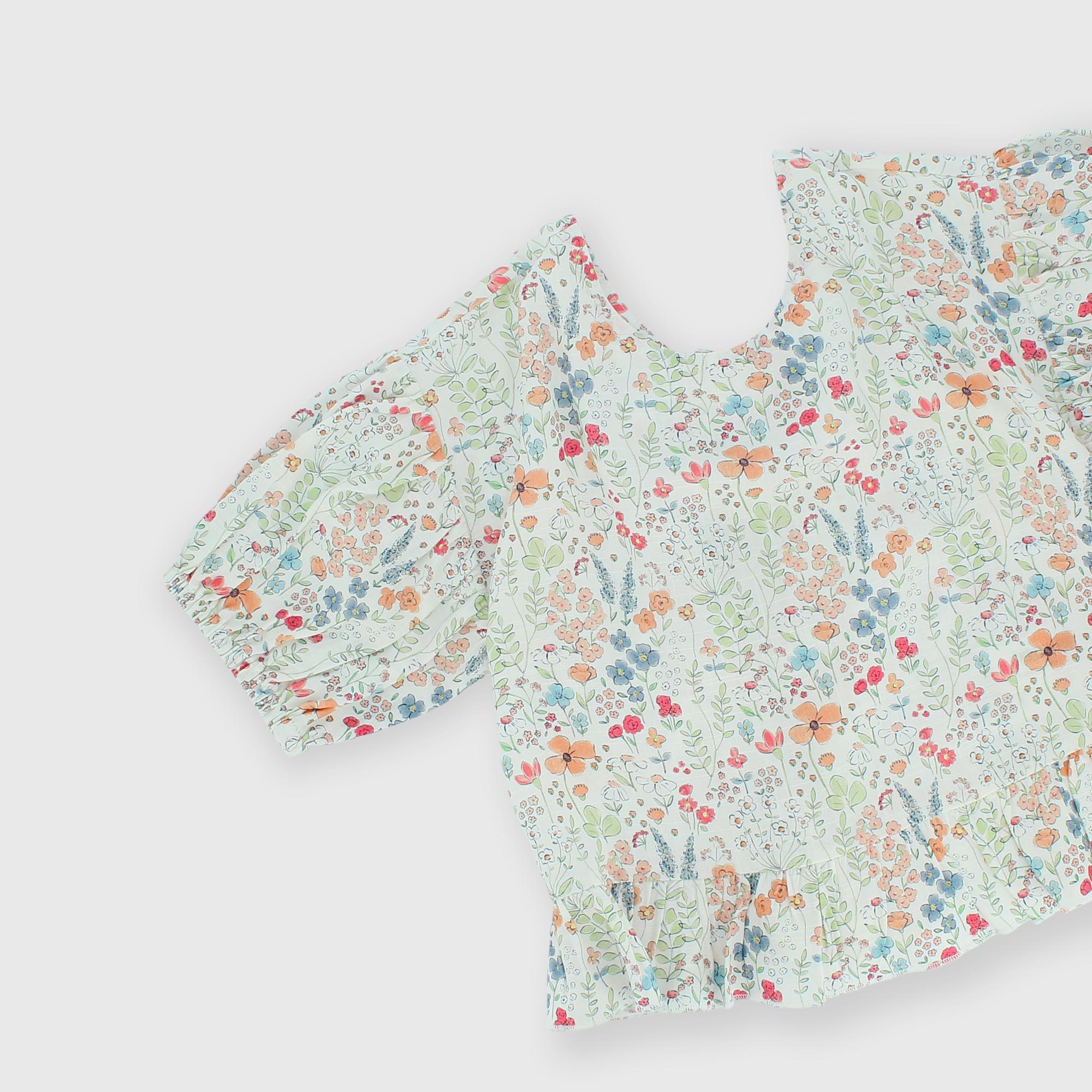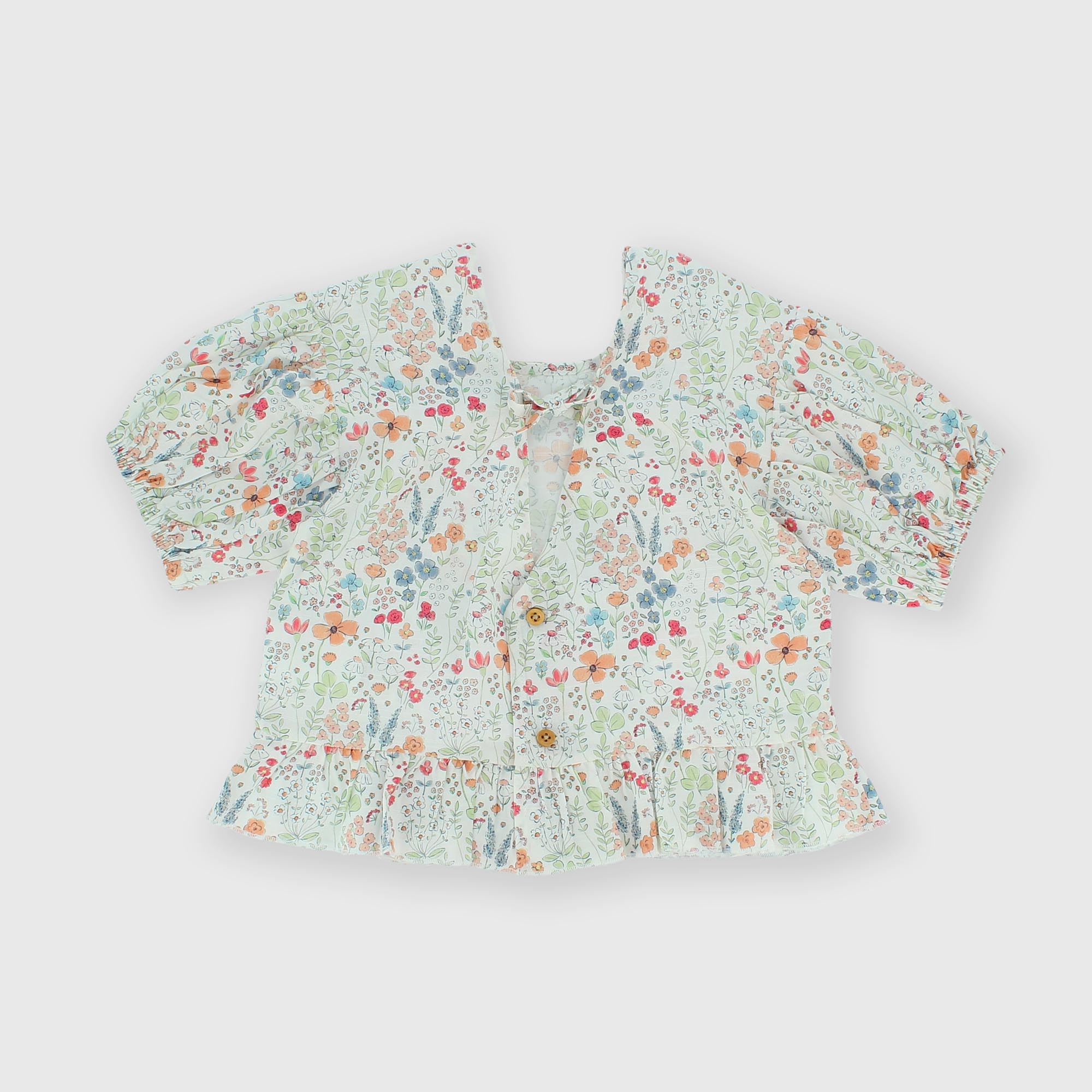 Вискозная блузка с круглым вырезом и короткими рукавами-фонариками. Застежка на пуговицы сзади и шнурки. Прыжок внизу. Принт по всей поверхности с мелкими цветочками.