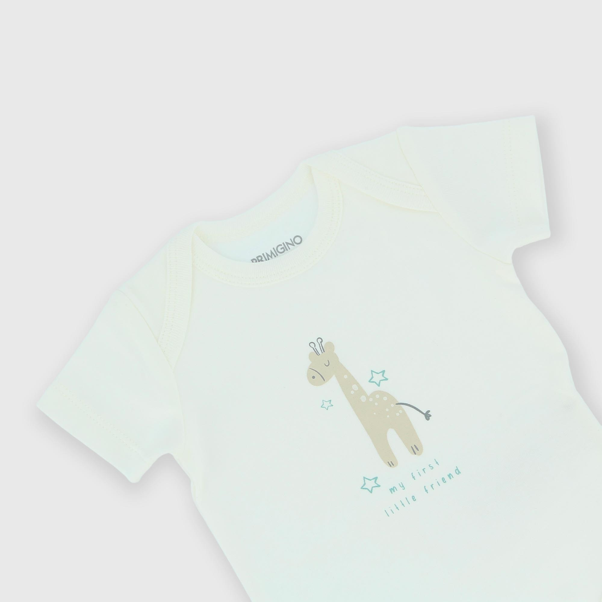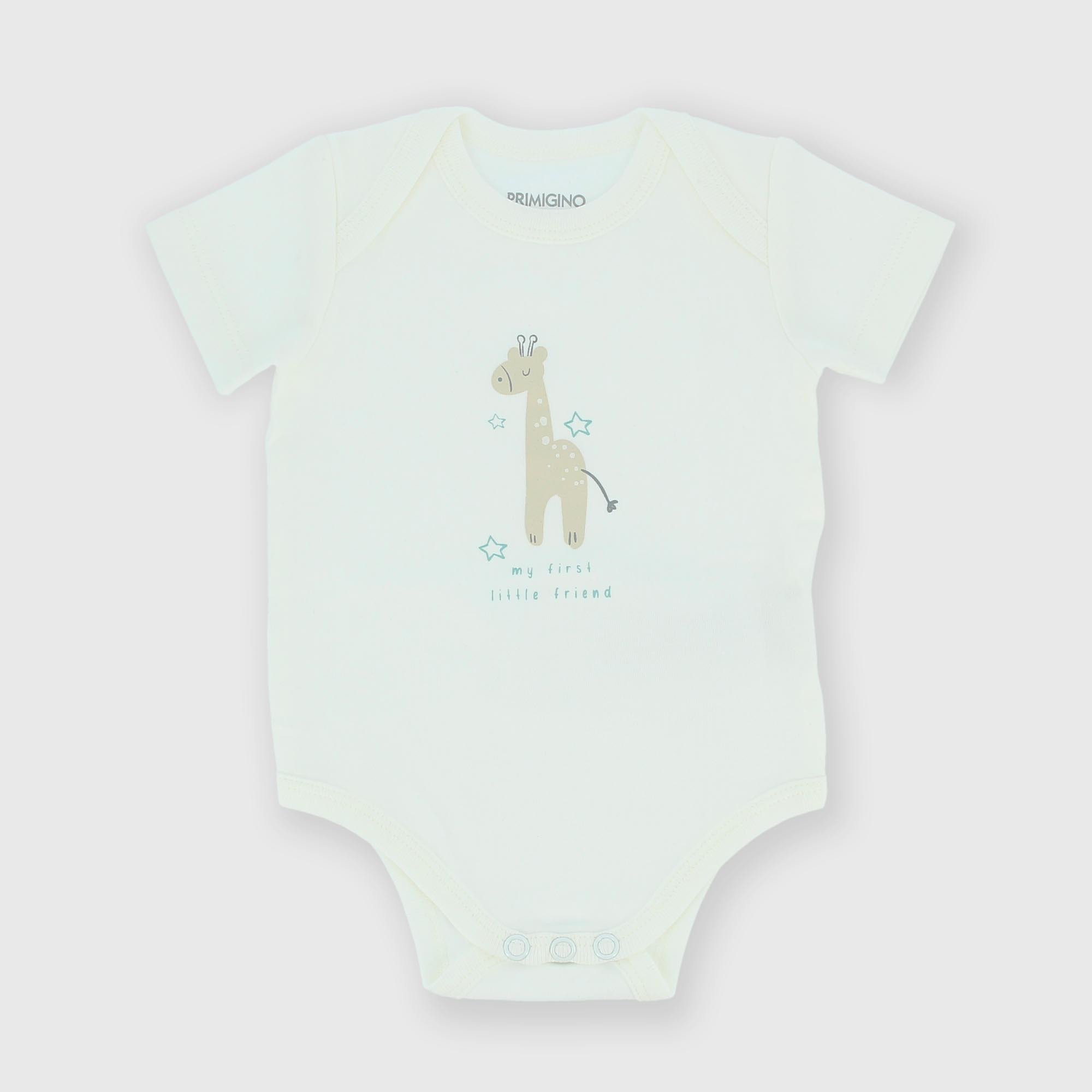Боди интерлок с круглым вырезом и короткими рукавами. Застежка на кнопки внизу. Принт спереди.