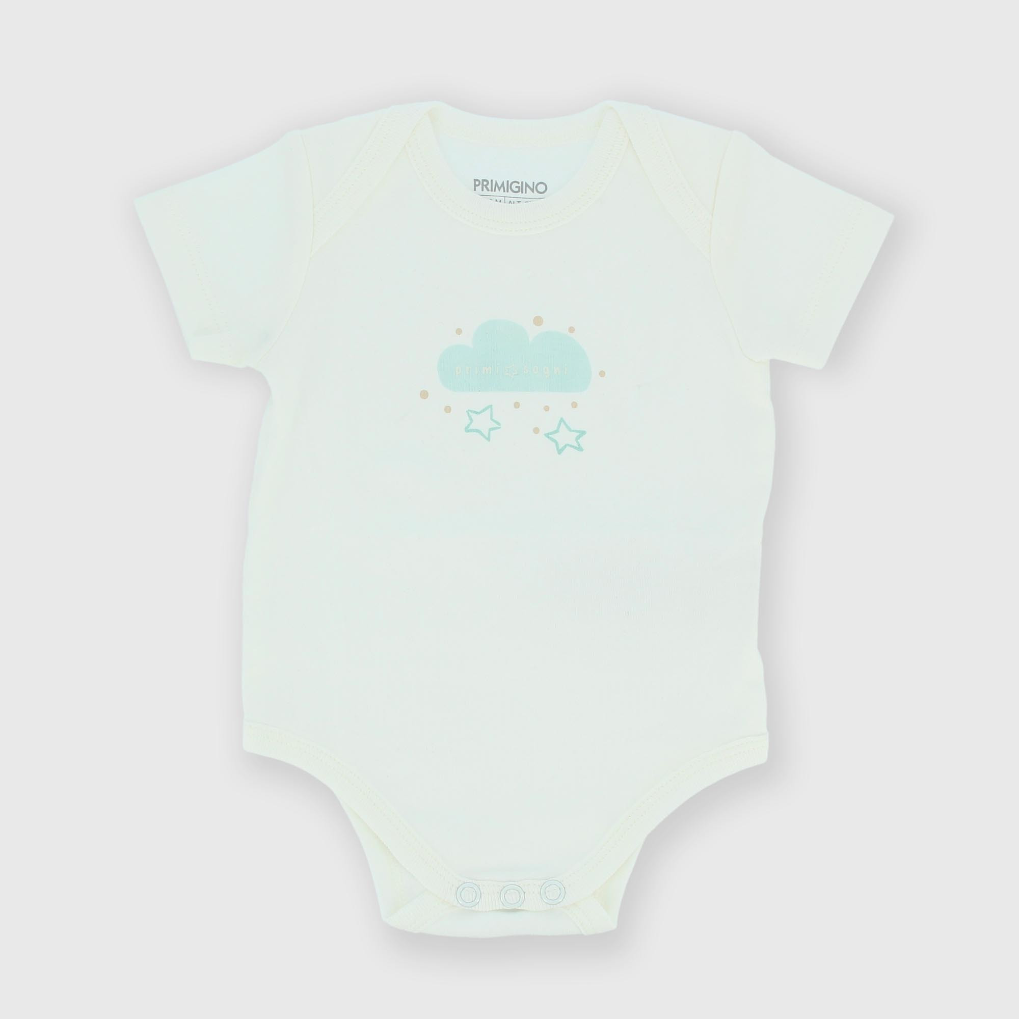 Боди интерлок с круглым вырезом и короткими рукавами. Застежка на кнопки внизу. Принт спереди.