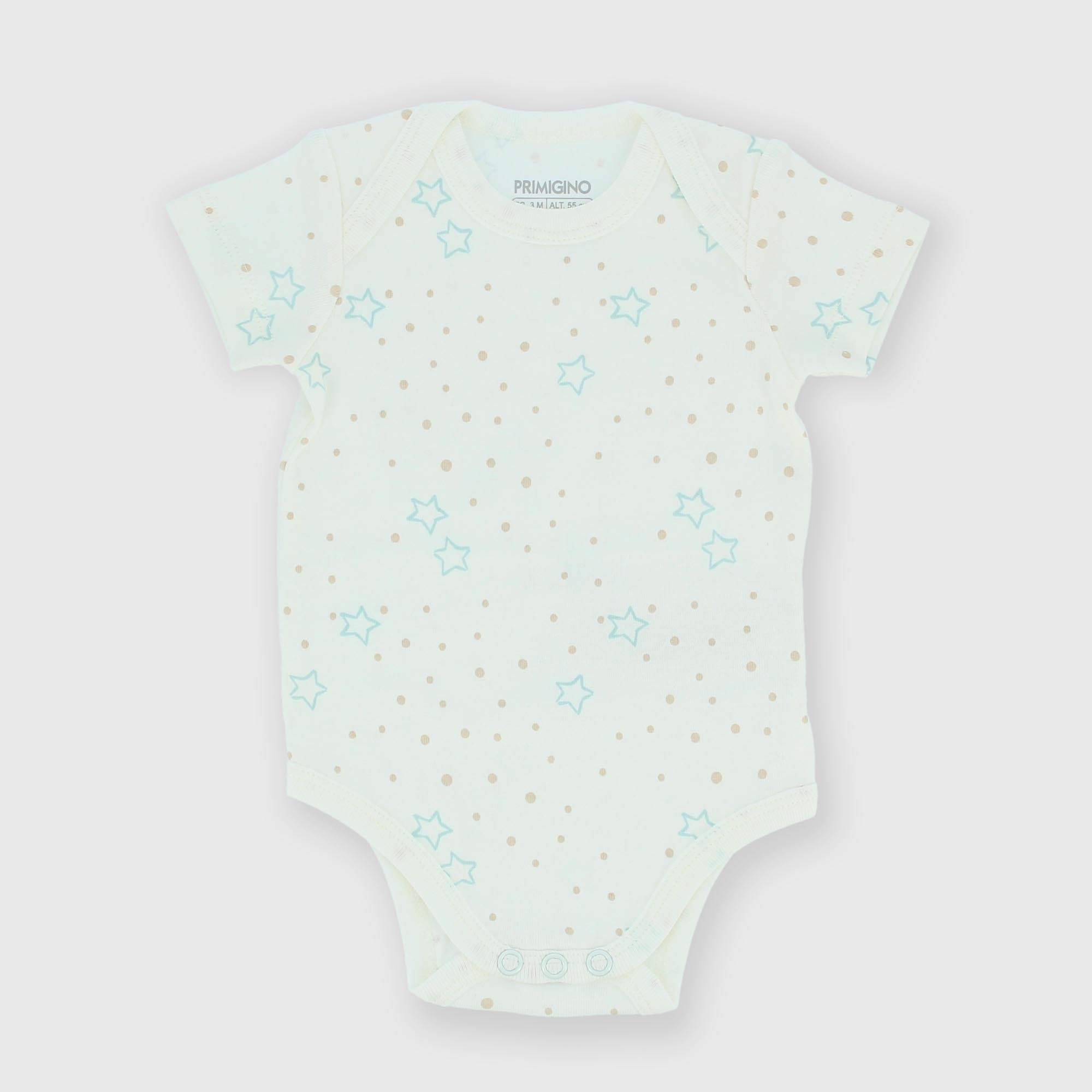 Боди в рубчик с круглым вырезом и короткими рукавами. Застежка на кнопки внизу. Сплошной принт.