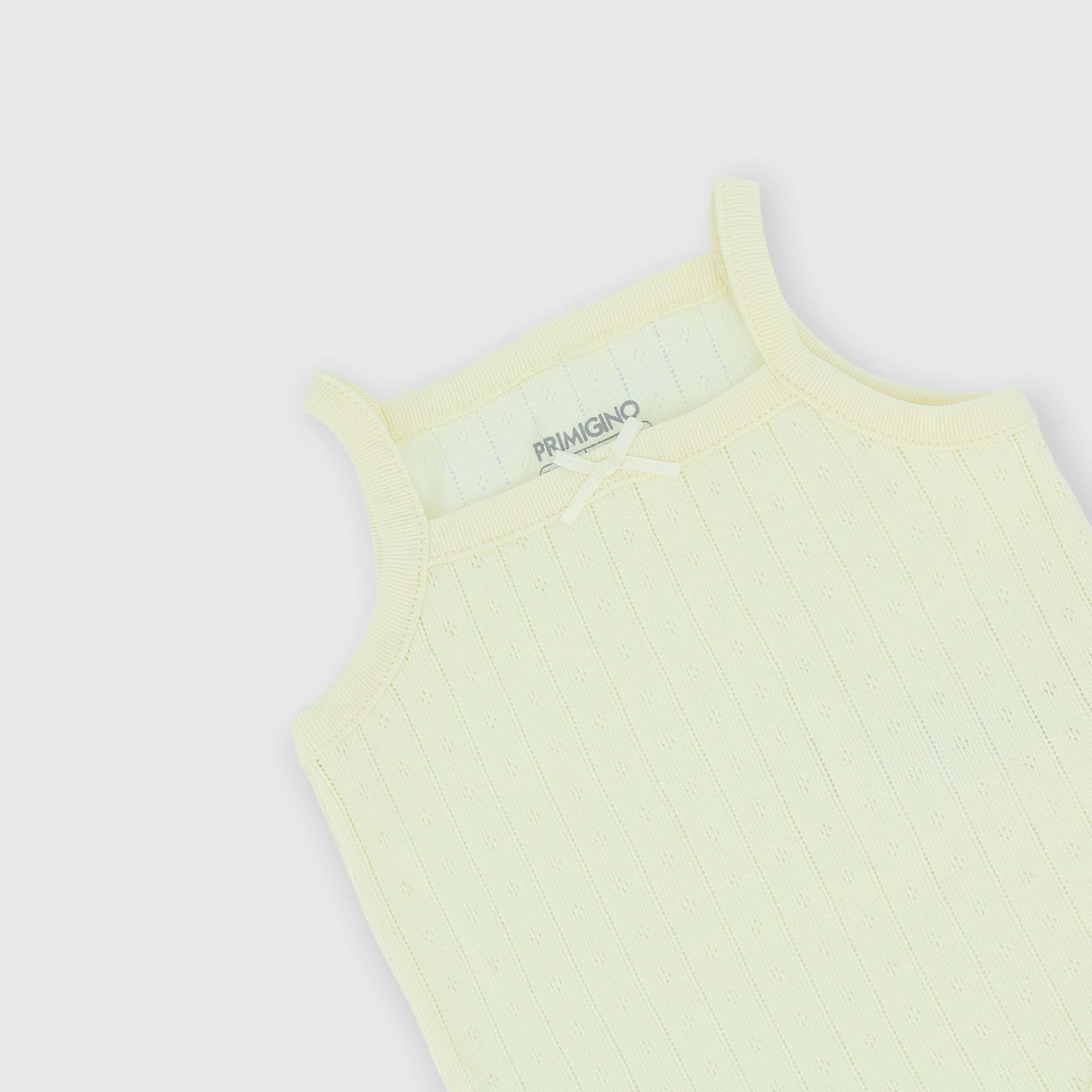 Боди в рубчик, квадратный вырез, на бретелях. Застежка на кнопки внизу. Спереди нанесен бантик.