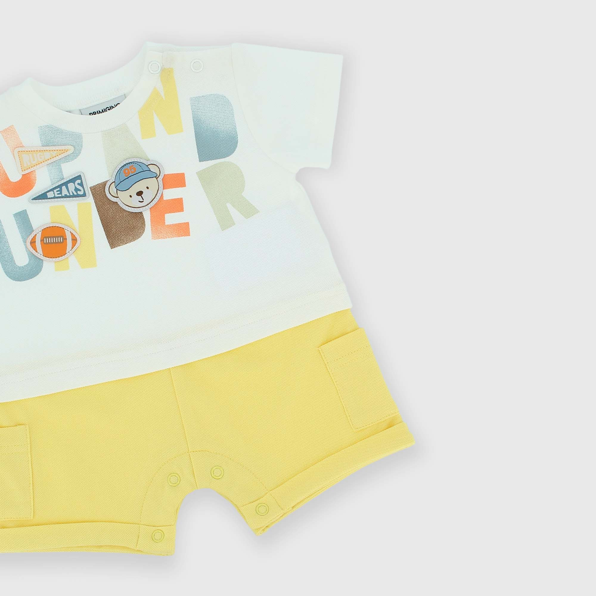 Комбинезон из пике, круглый вырез, короткие рукава. Застежка на кнопки на плечах и в промежности. Принт с нашивкой спереди. Однотонные шорты с накладными карманами по бокам.