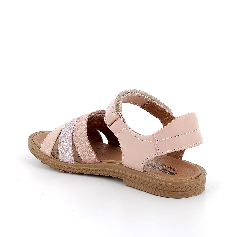 Особенность этих босоножек для девочек в том, что каждый из трёх регулируемых ремешков спереди выполнен из разного материала. Они минималистичны и оригинальны одновременно. Подошва имеет классический вид и украшена узором из тесьмы. Кожаная стелька дышащая и гигиеничная.