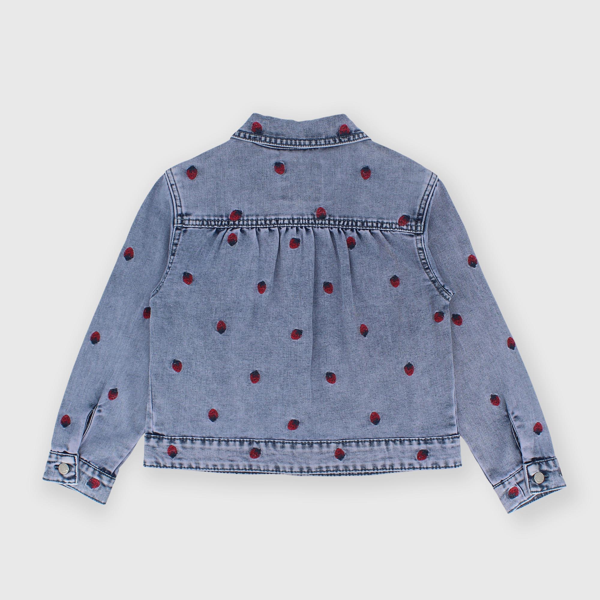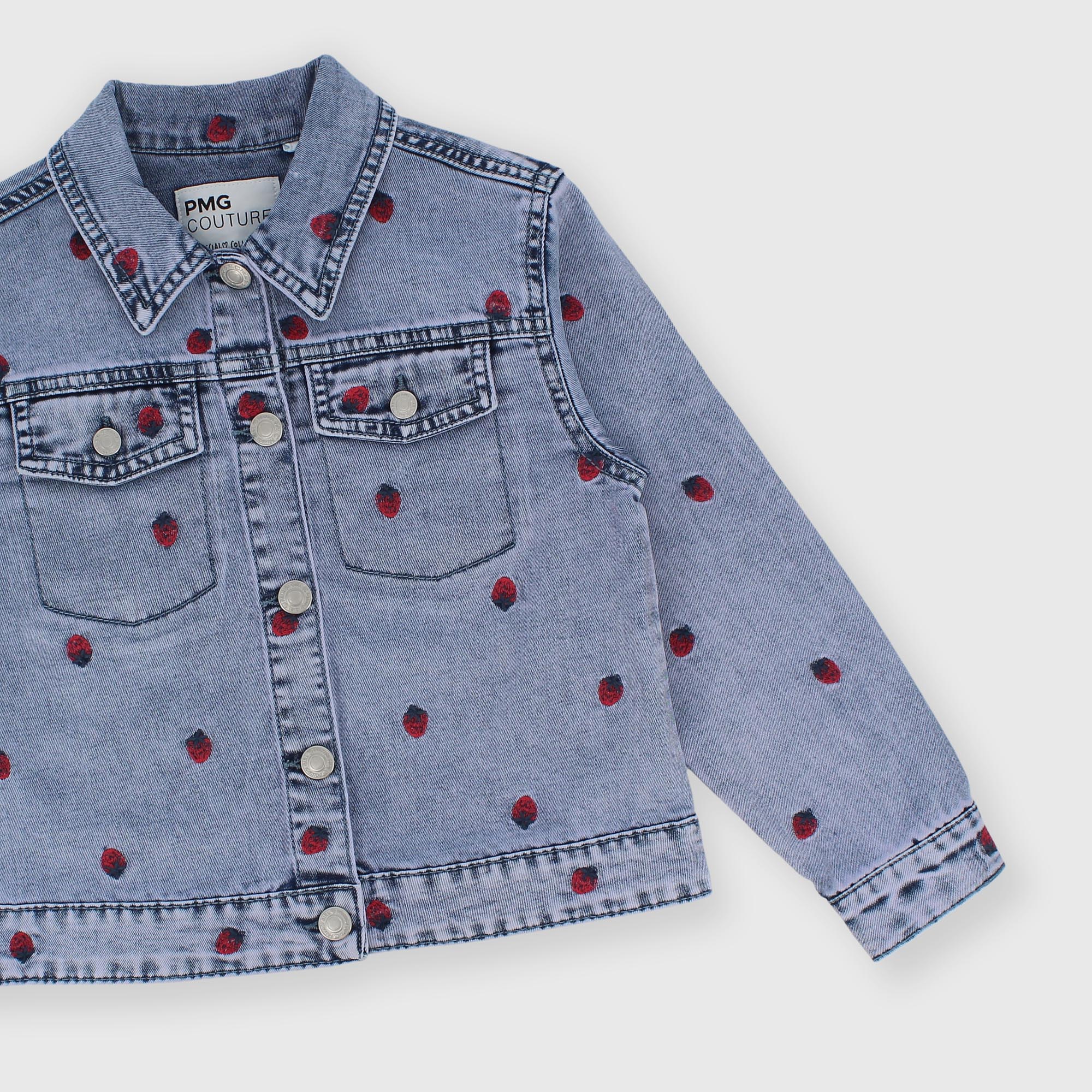 Джинсовая куртка с длинными рукавами и воротником. Застёжка на пуговицы спереди. Накладные карманы с клапанами спереди. Вышитые клубнички.