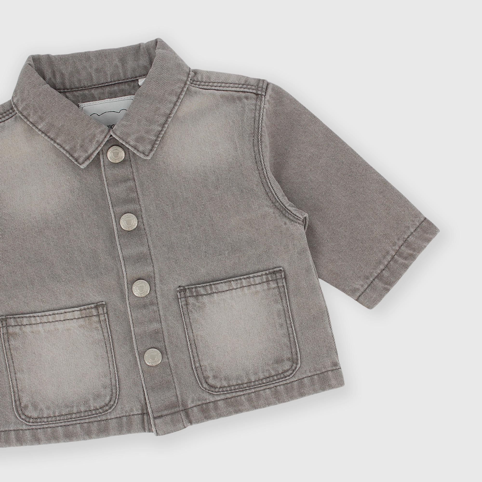 Джинсовая рубашка с длинными рукавами и воротником. Застёжка на кнопки спереди. Накладные карманы спереди.