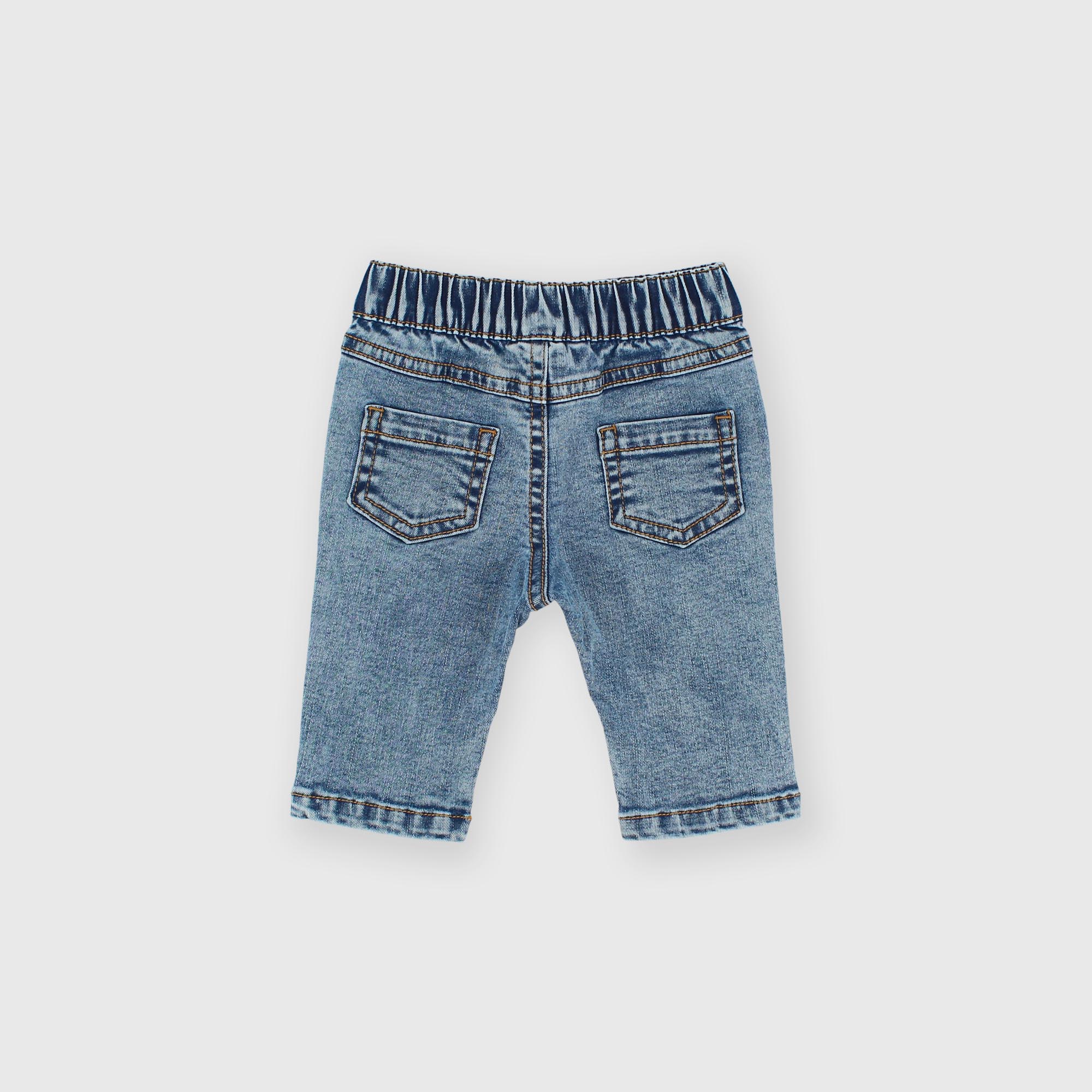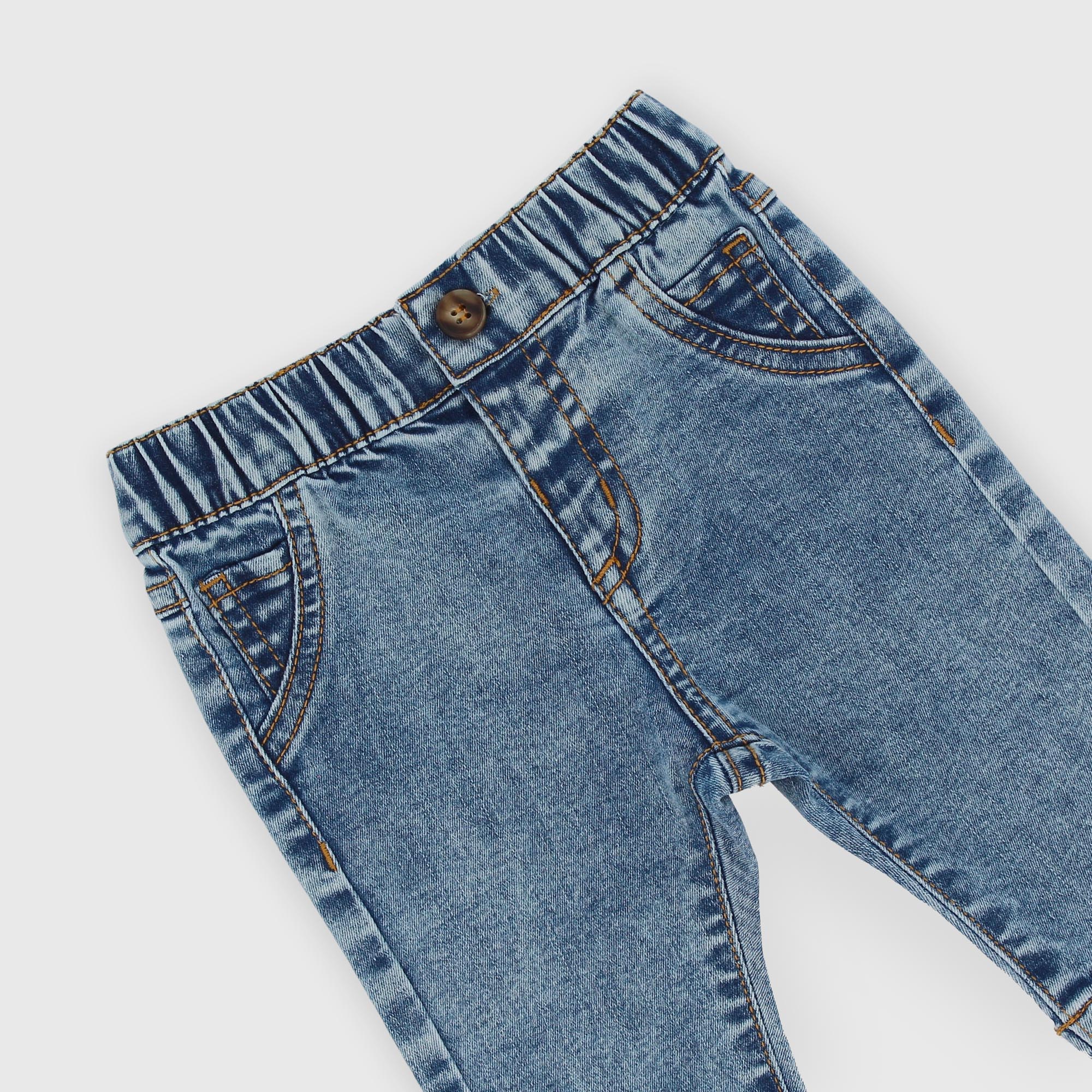 Трикотажные джинсовые брюки с эластичным поясом. Застёжка на пуговицы. Пять карманов.