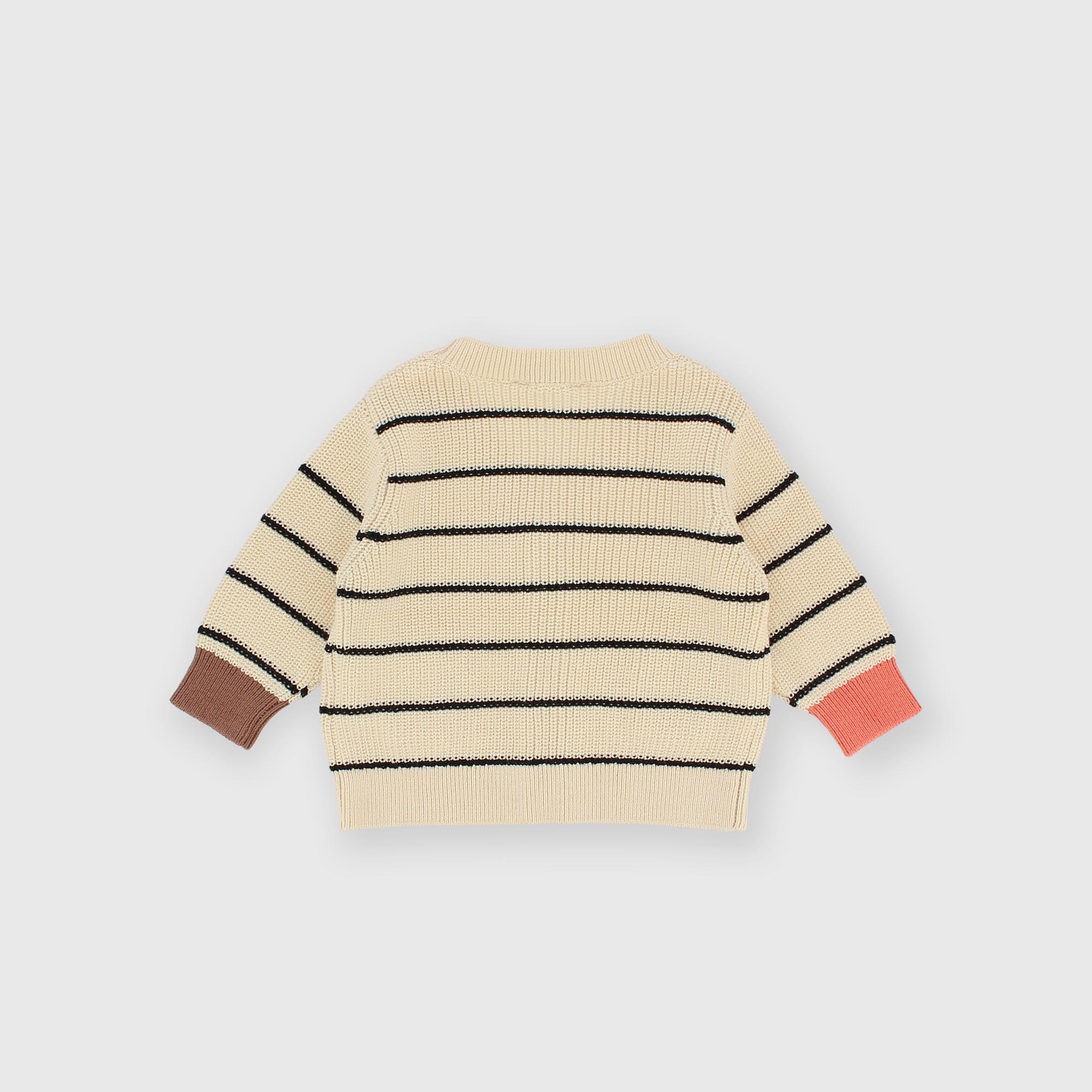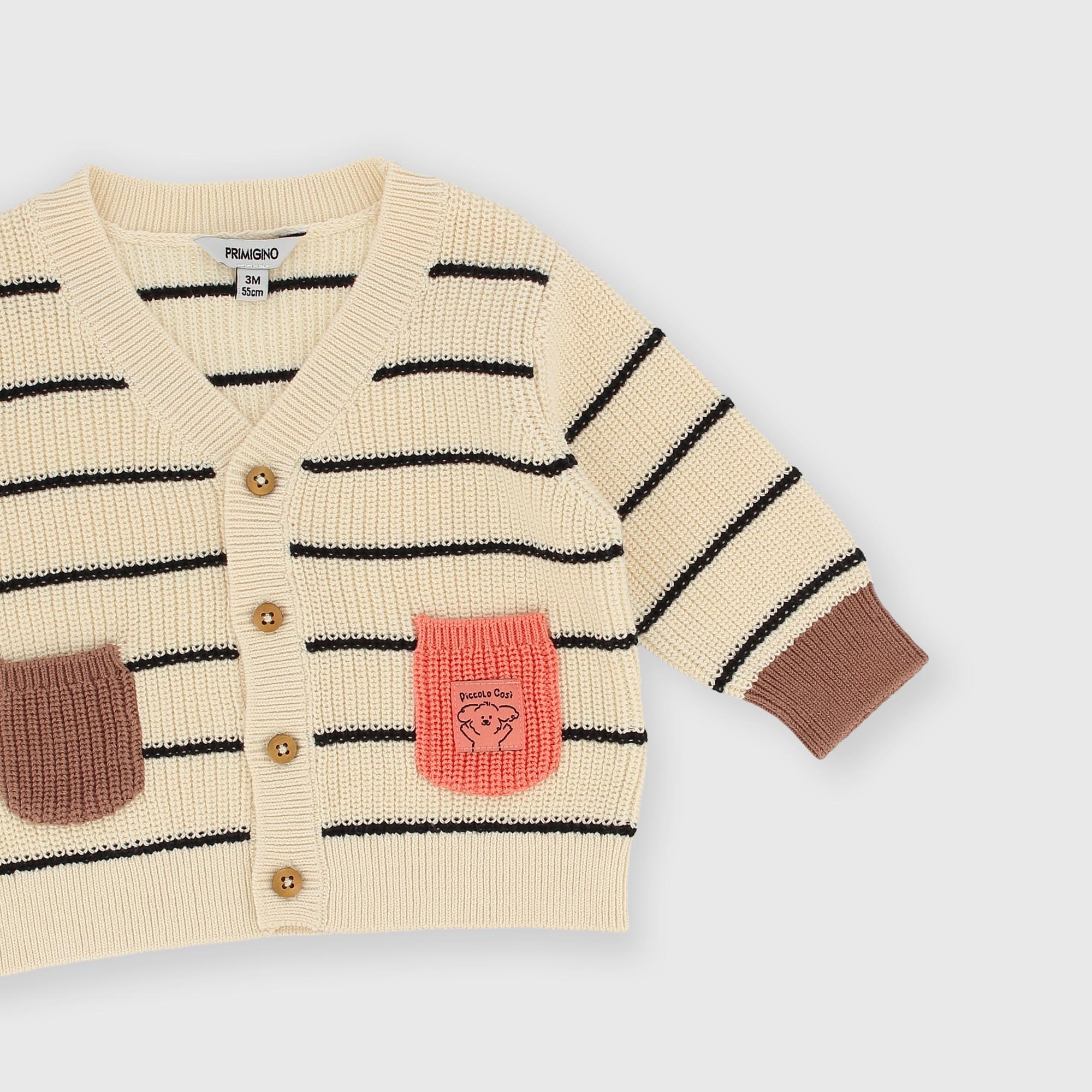 Мягкий кардиган из хлопкового трикотажа в полоску с V-образным вырезом и длинными рукавами. Застежка на пуговицы спереди. Накладной карман