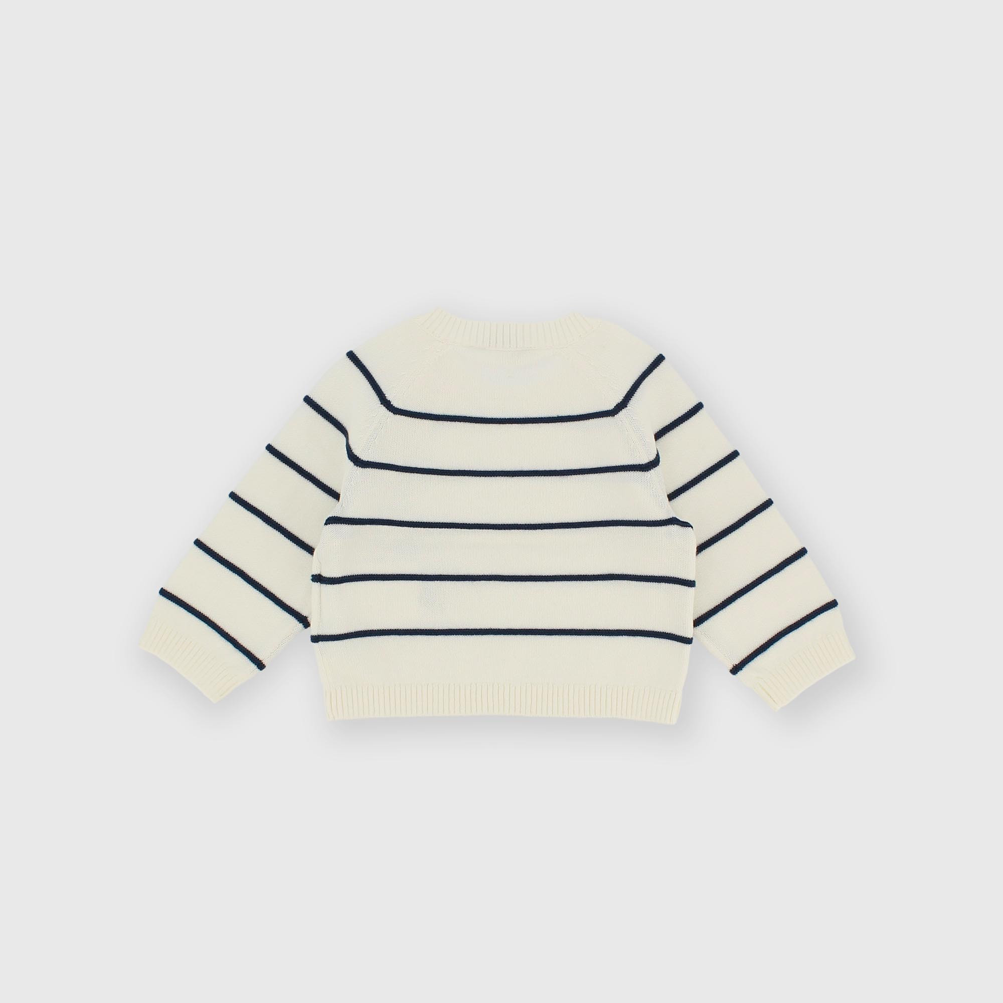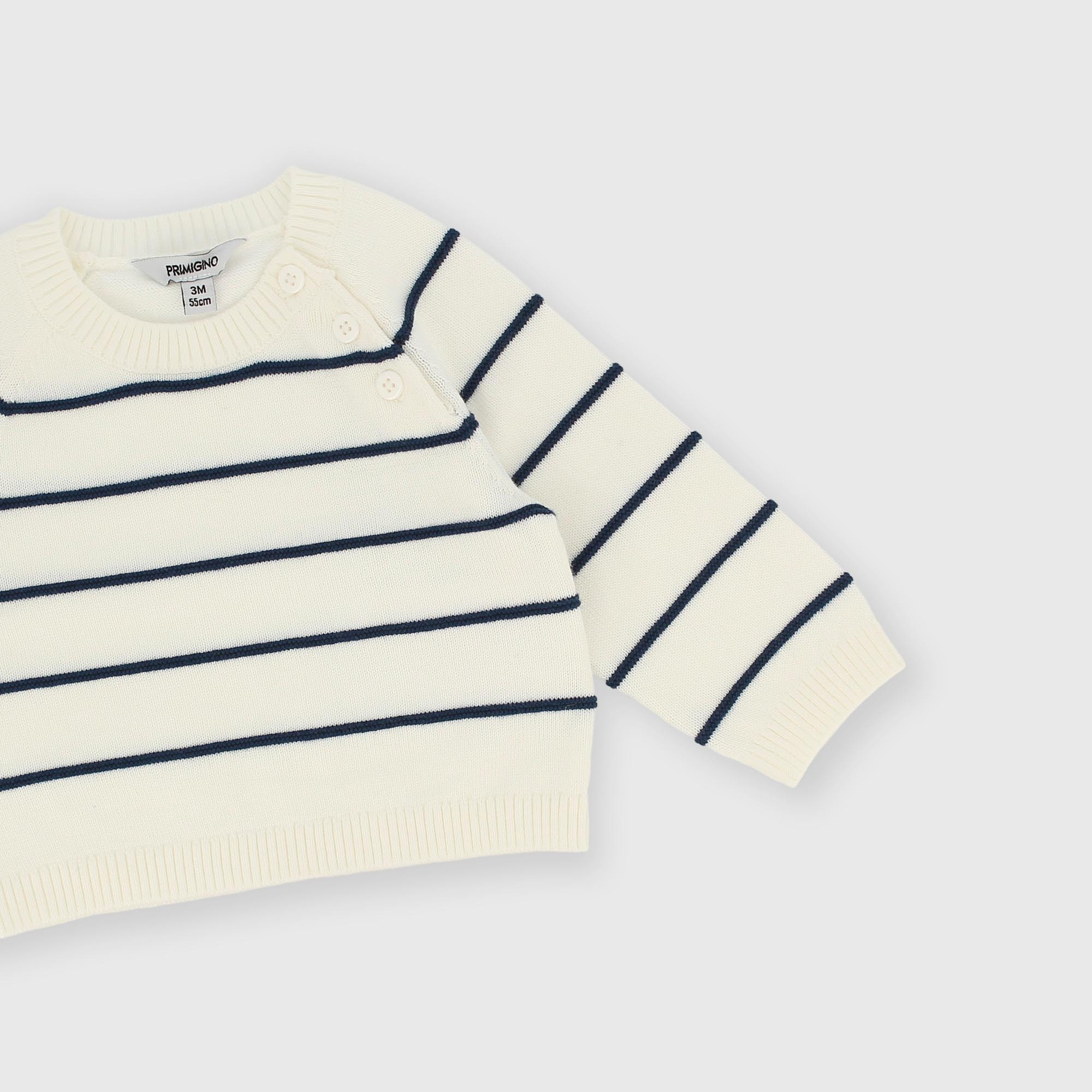 Мягкий хлопковый свитер в полоску с круглым вырезом и длинными рукавами. Застегивается на пуговицы на плече.
