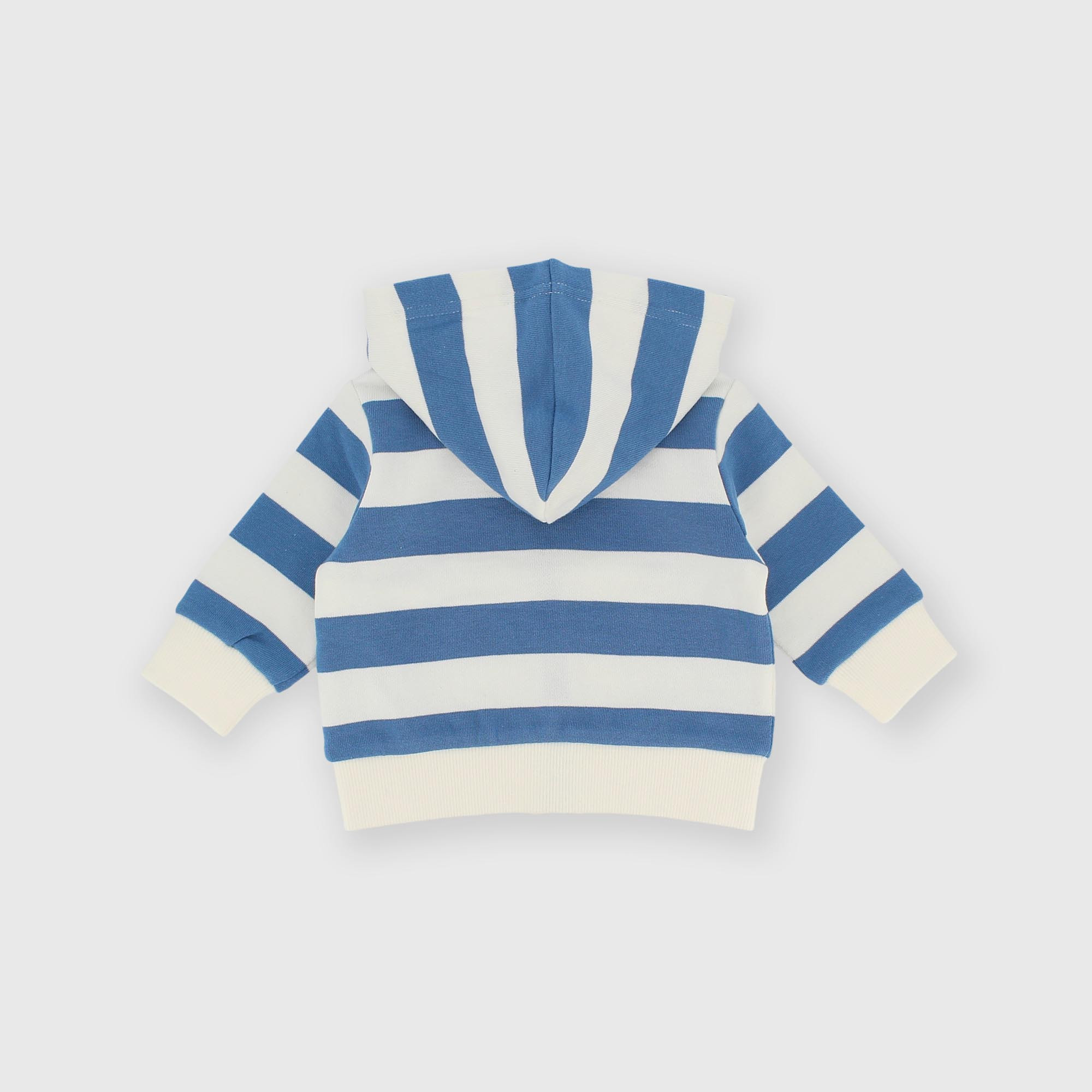 Толстовка с длинными рукавами, без застёжки. Молния спереди и карманы-кенгуру. Принтованные полосы. Ребристые манжеты и подол.